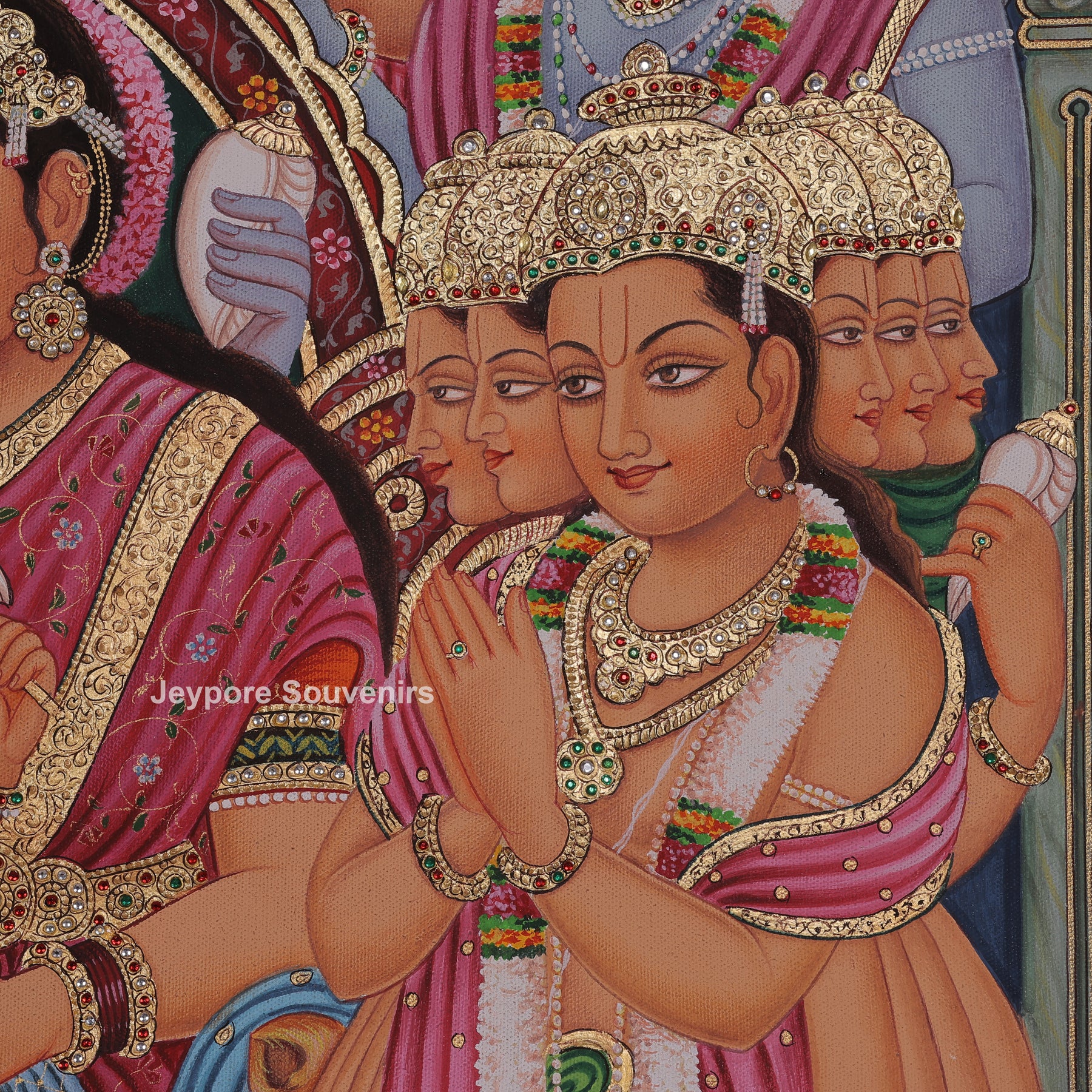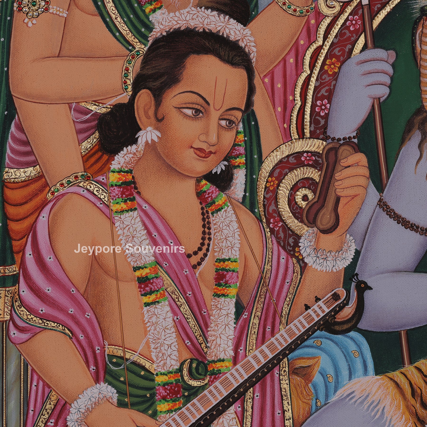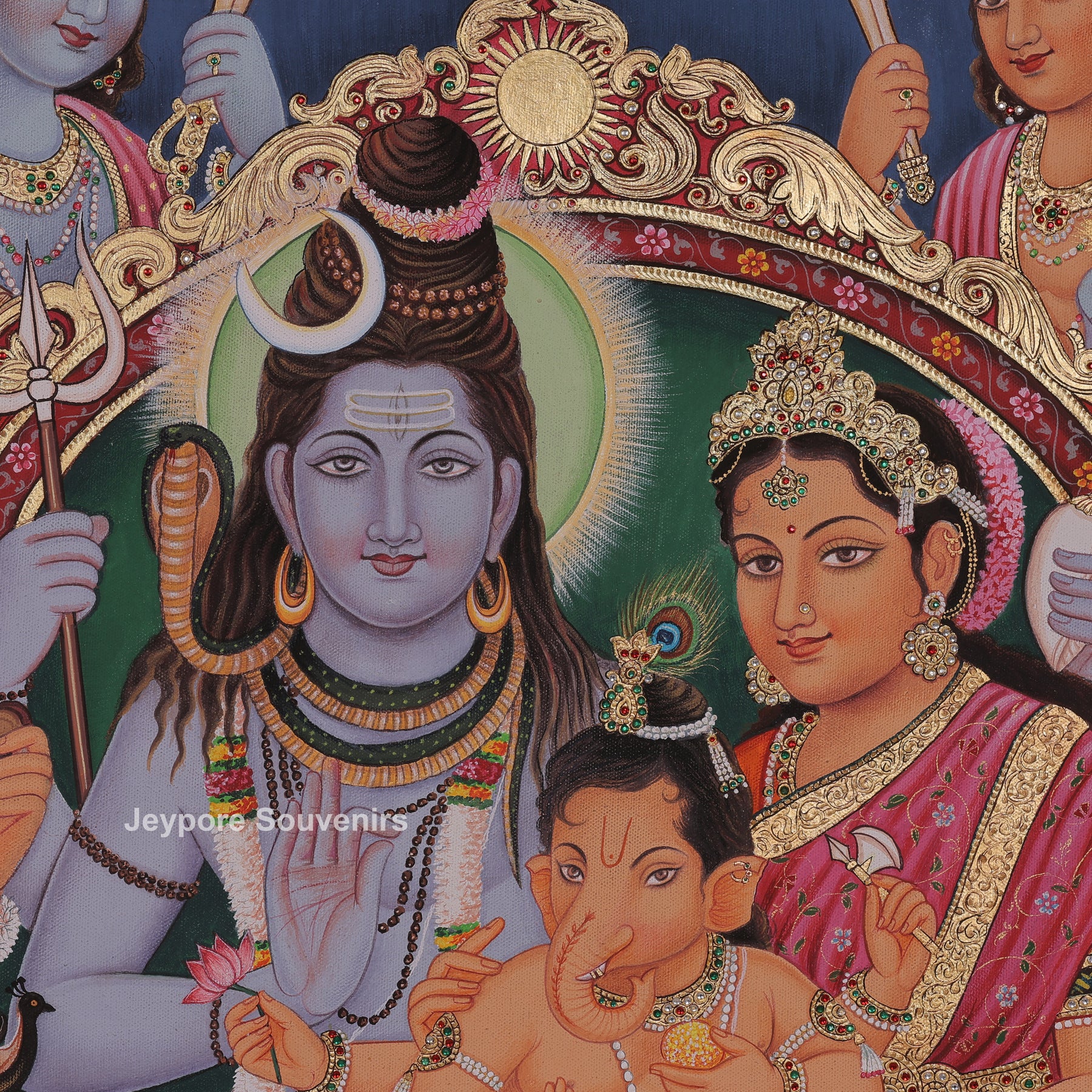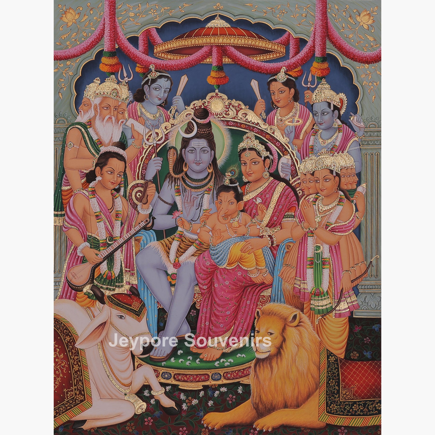 A beautiful Shiv Darbar painting, showing Lord Shiva and Goddess Parvati seated together with little Ganesha in their lap. The scene is filled with divine warmth — surrounded by other gods, Nandi, and Parvati’s lion, all gathered in devotion. Hand-painted on canvas with real gold leaf work, this artwork truly captures the feeling of peace and togetherness.