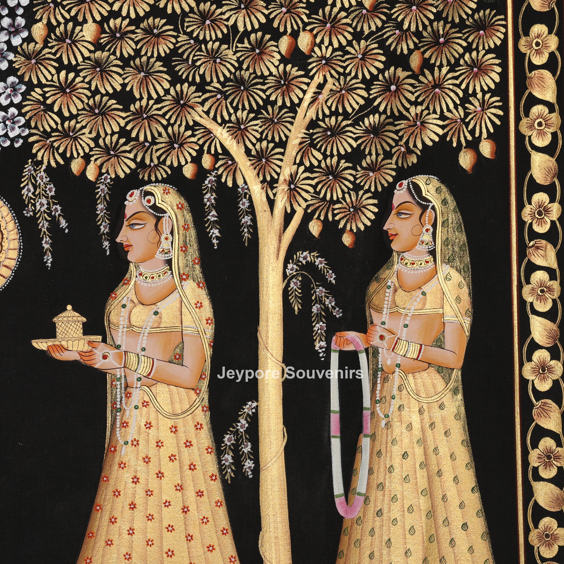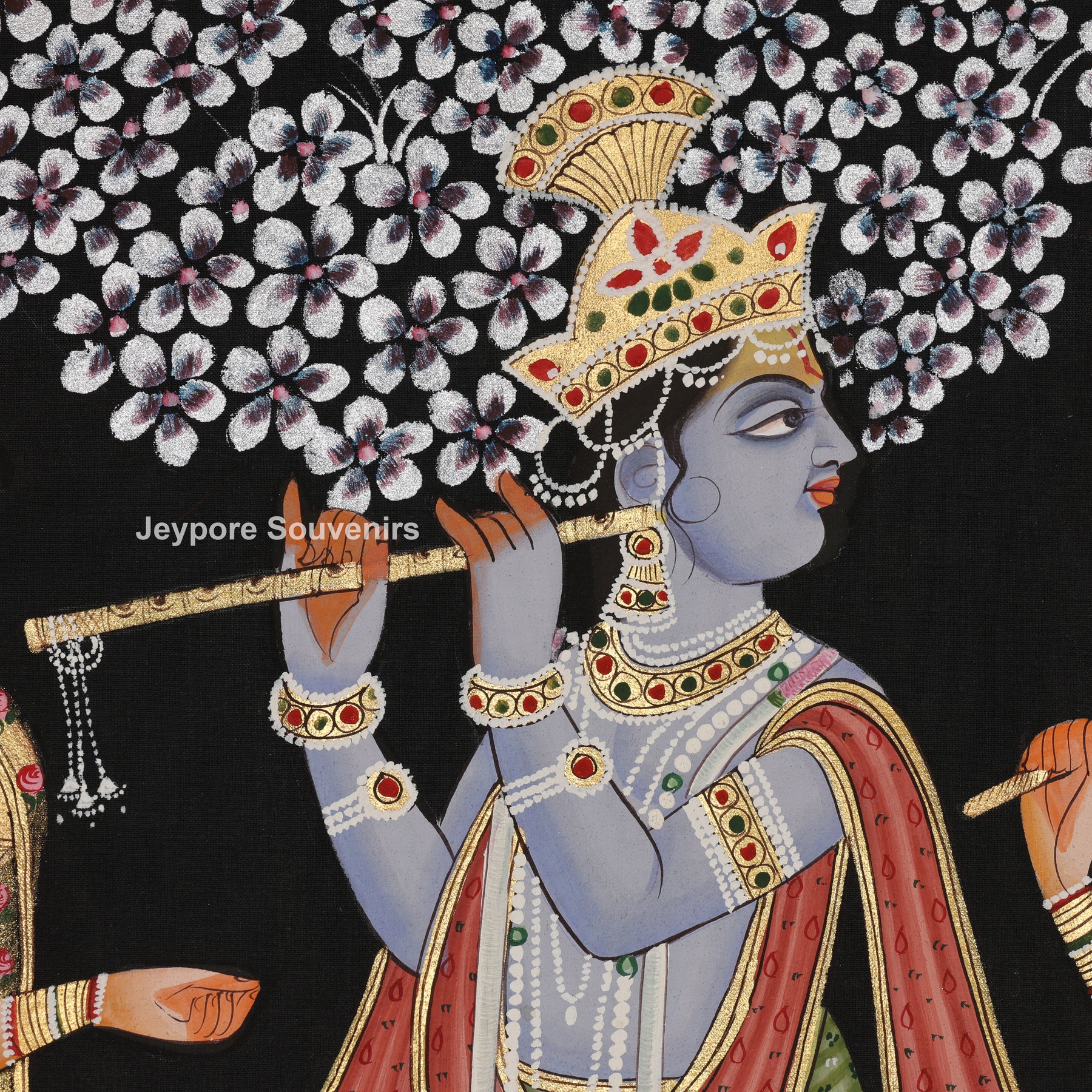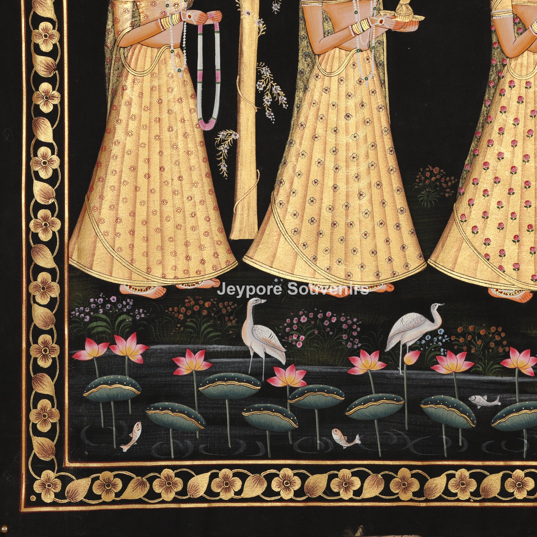 This hand-painted pichwai painting depicts Lord Krishna playing the flute, elegantly surrounded by devoted gopis in a tranquil Raas Leela celebration beneath blooming trees. Created in the traditional Rajasthani miniature painting style, is executed on high-quality cotton fabric with natural mineral and plant-based pigments, accented by intricate gold leaf detailing. The rich black backdrop accentuates the radiant gold hues and intricate details. Ideal for home shrines, upscale interiors, hotels, and spiritual environments, this painting embodies devotion, harmony, sophistication, and enduring Indian cultural craftsmanship—perfect for high-end décor and collectors.