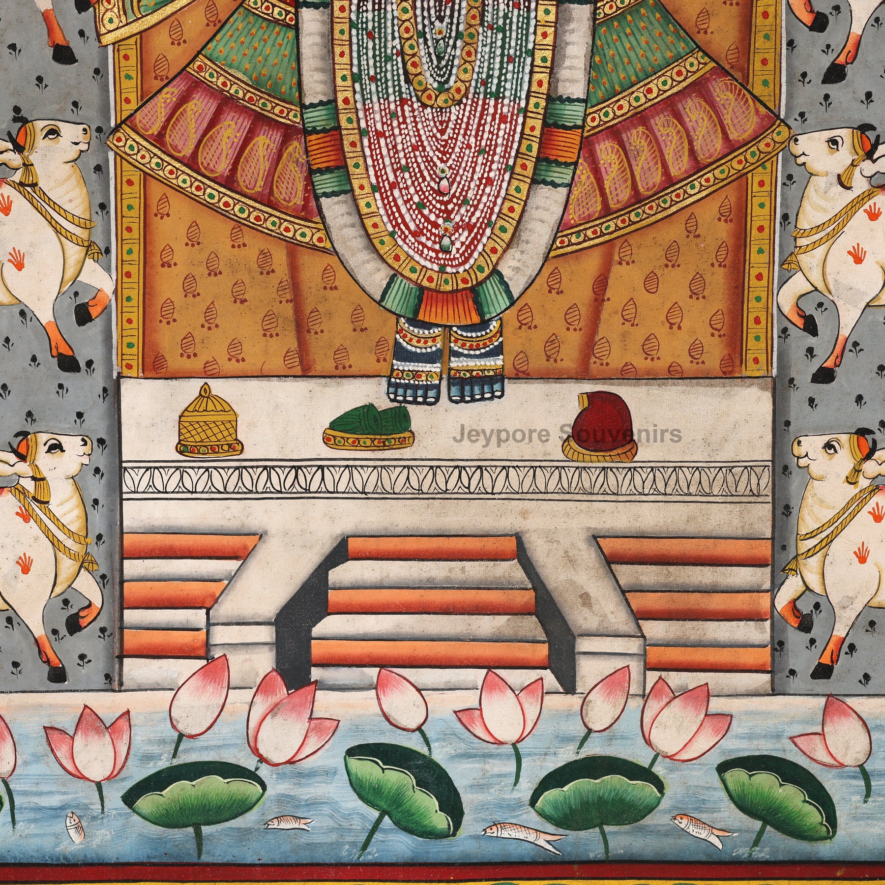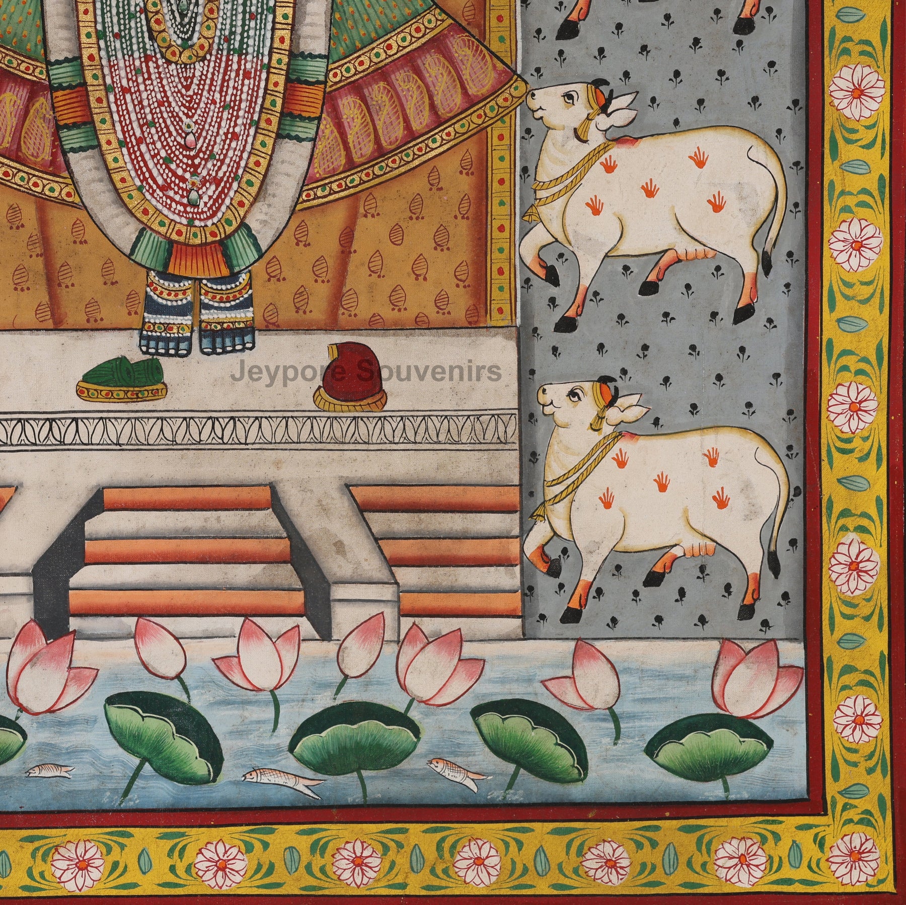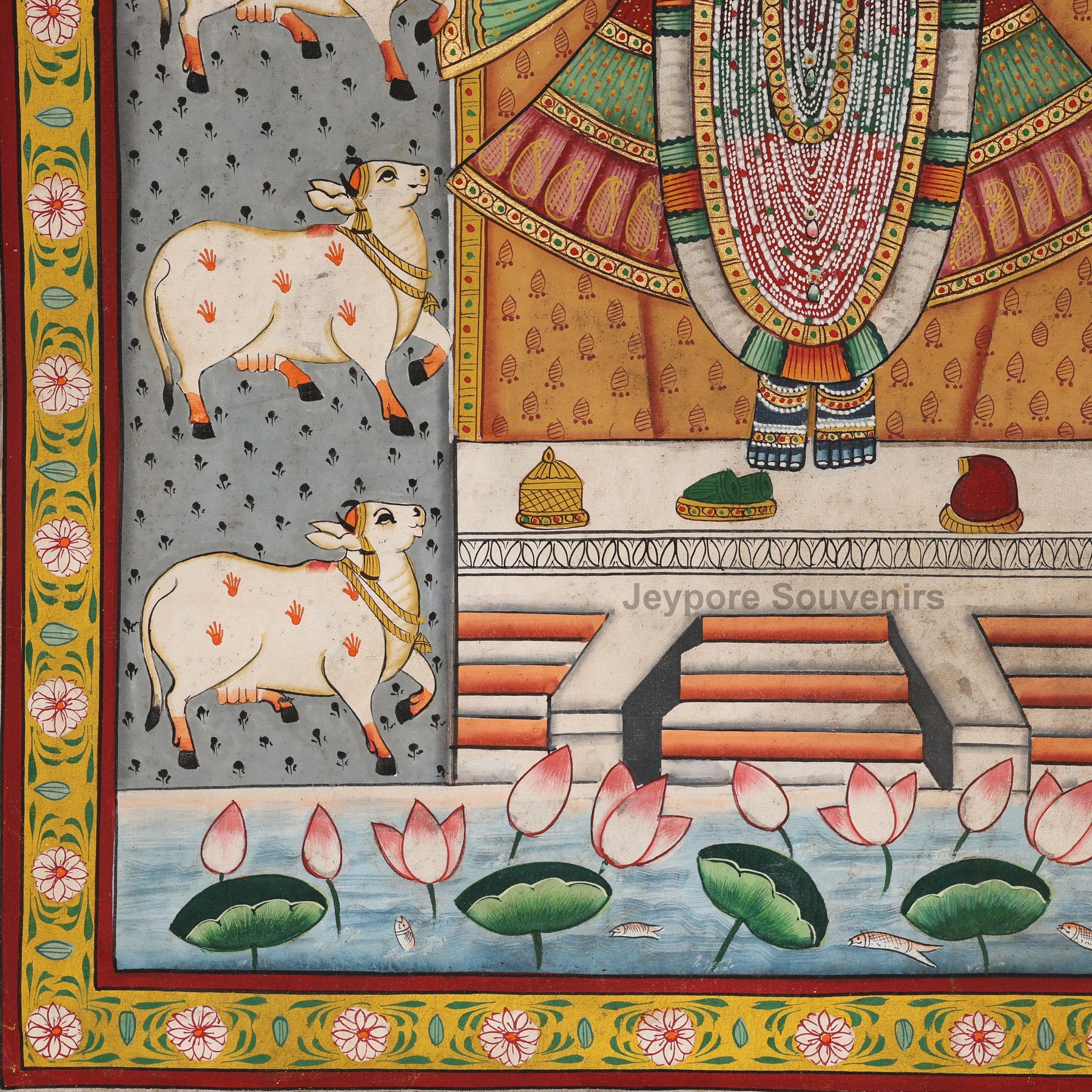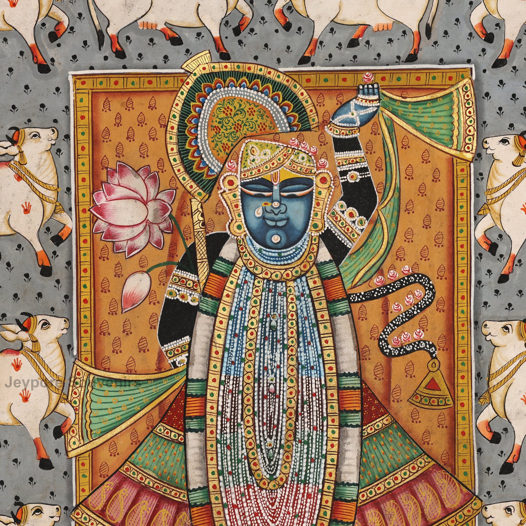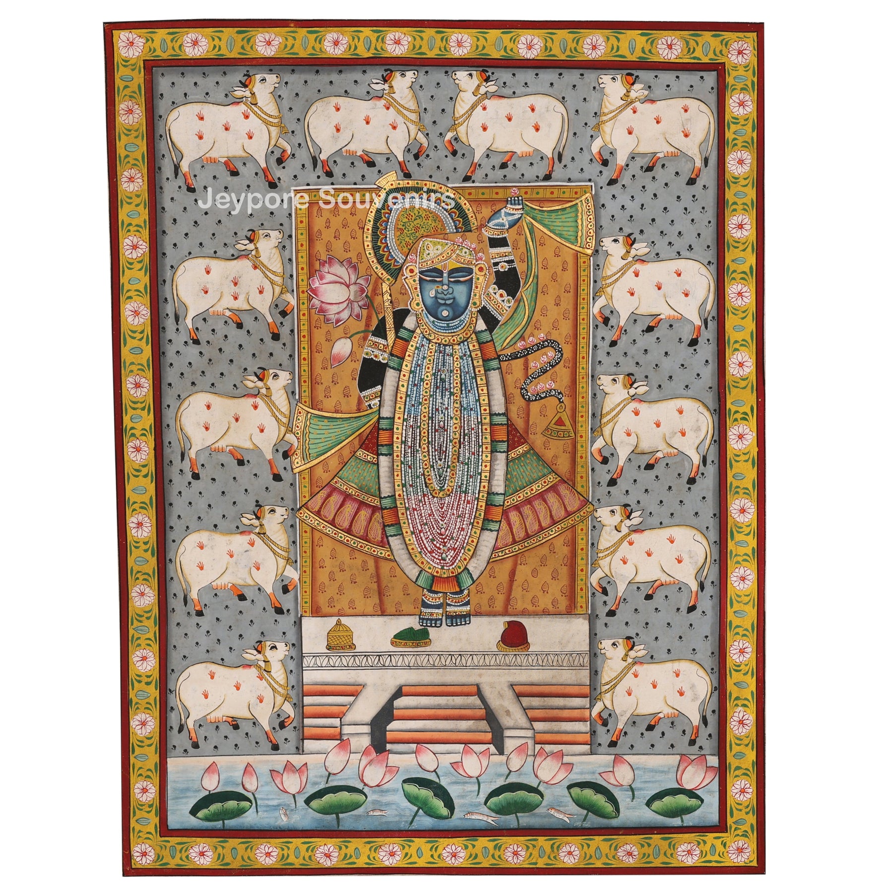 Absolutely! This painting is ideal for temple walls, pooja rooms, living spaces, or meditation corners. The depiction of Shrinathji surrounded by cows and lotus flowers brings calmness, devotion, and prosperity into your home.