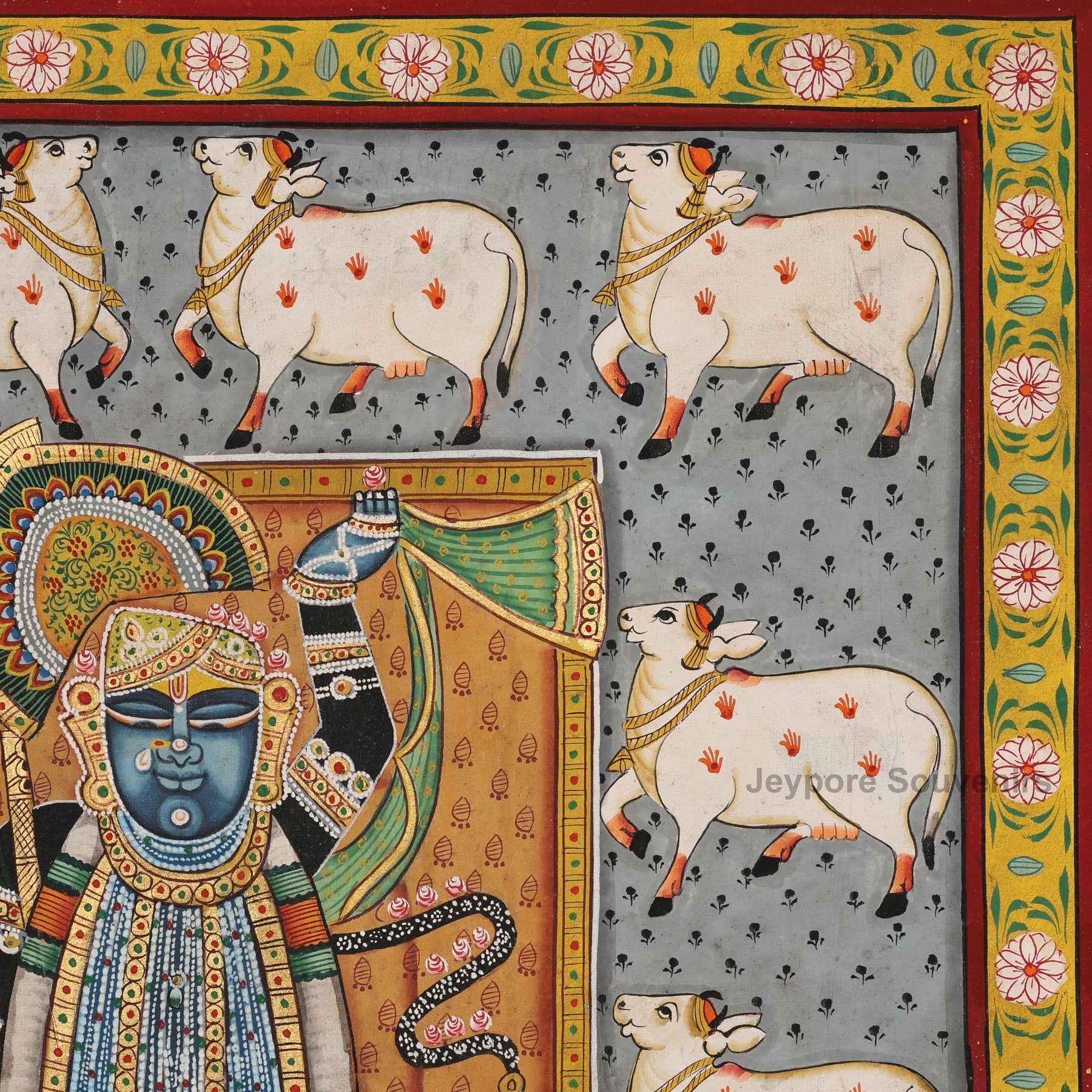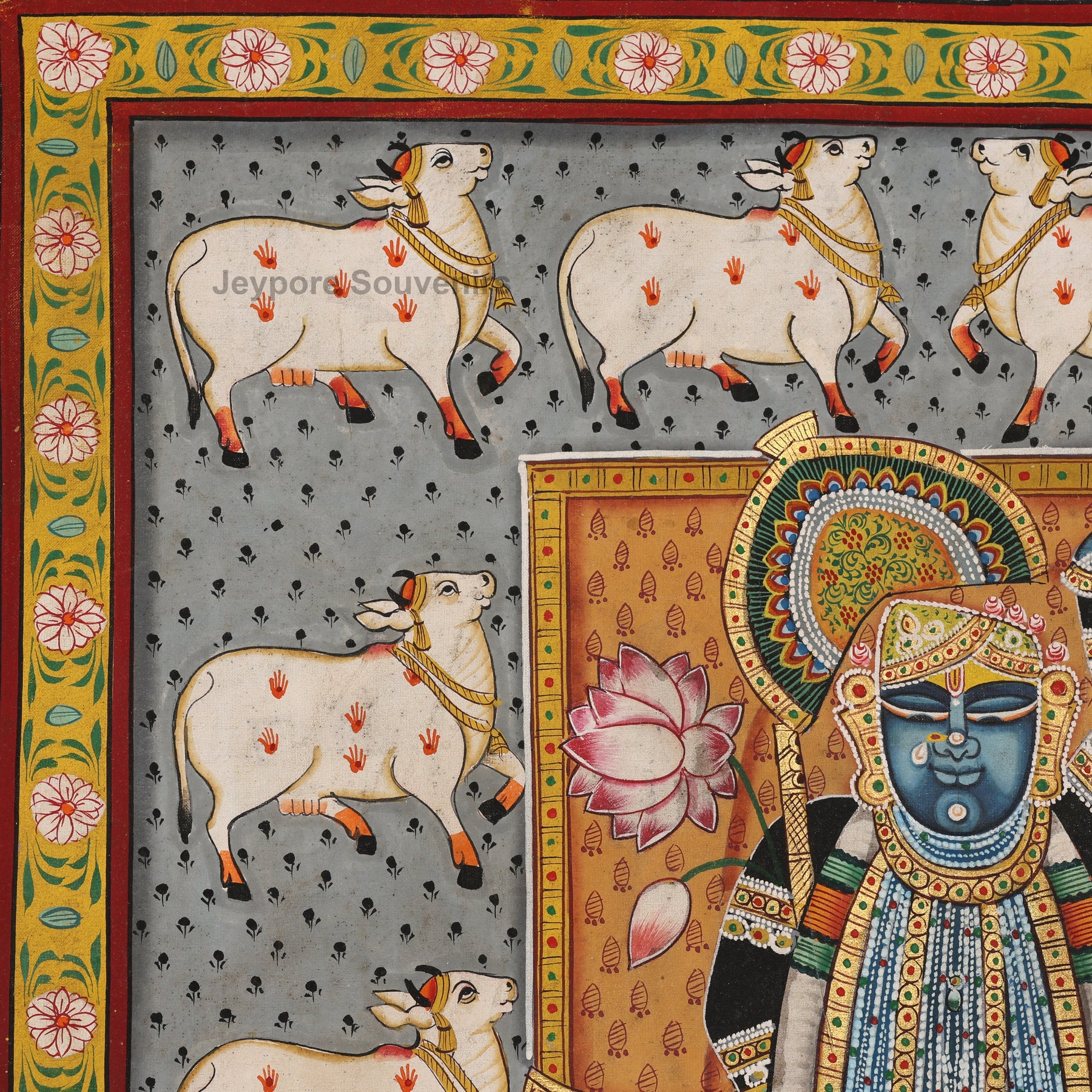 In Pichwai art, cows symbolize purity, devotion, and divine abundance. They represent Krishna’s eternal companions in Vrindavan and signify protection, love, and selfless service. The cows surrounding Shrinathji reflect the harmony between the divine and all living beings.