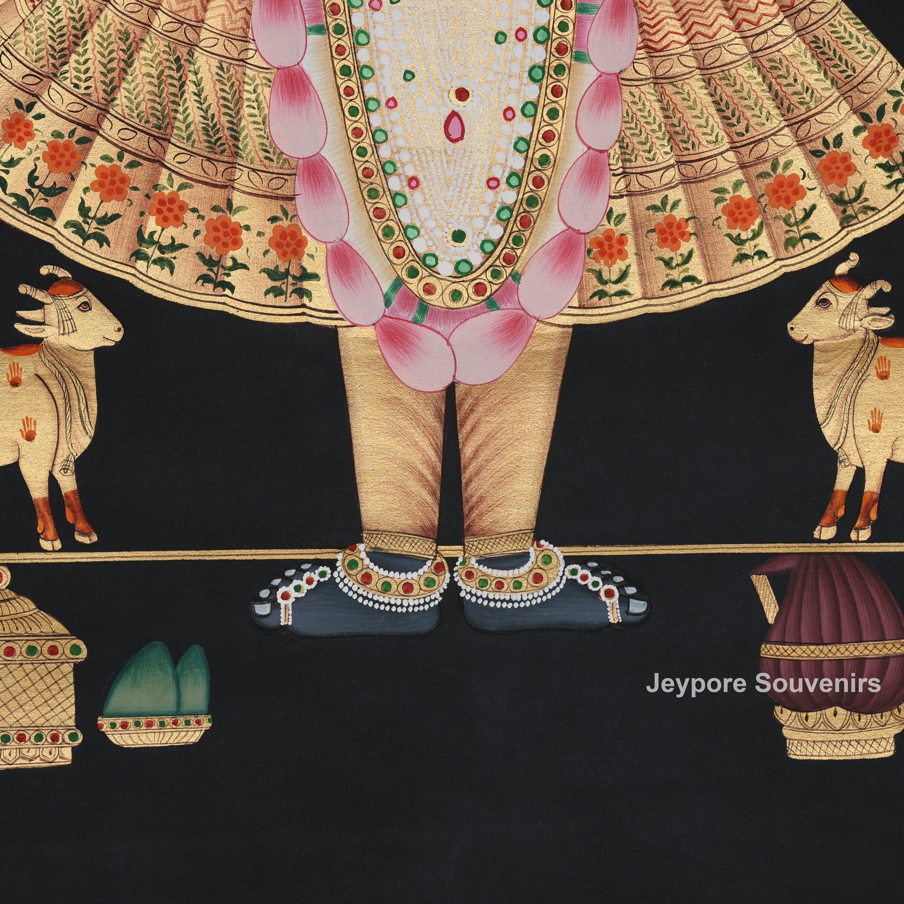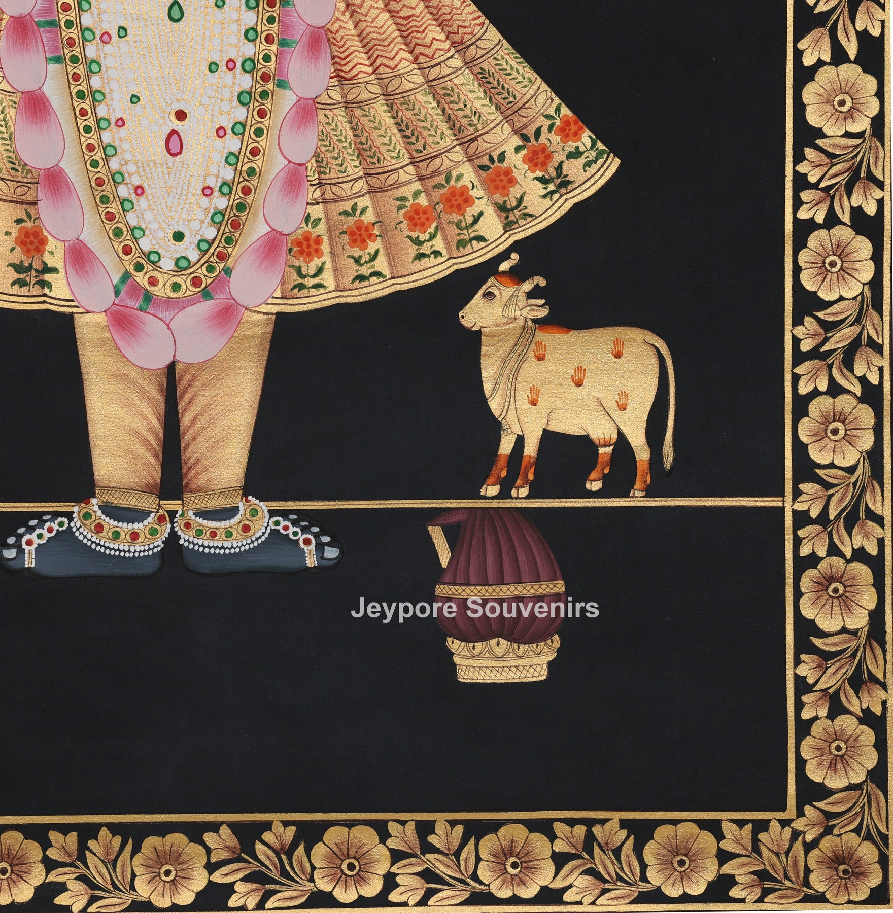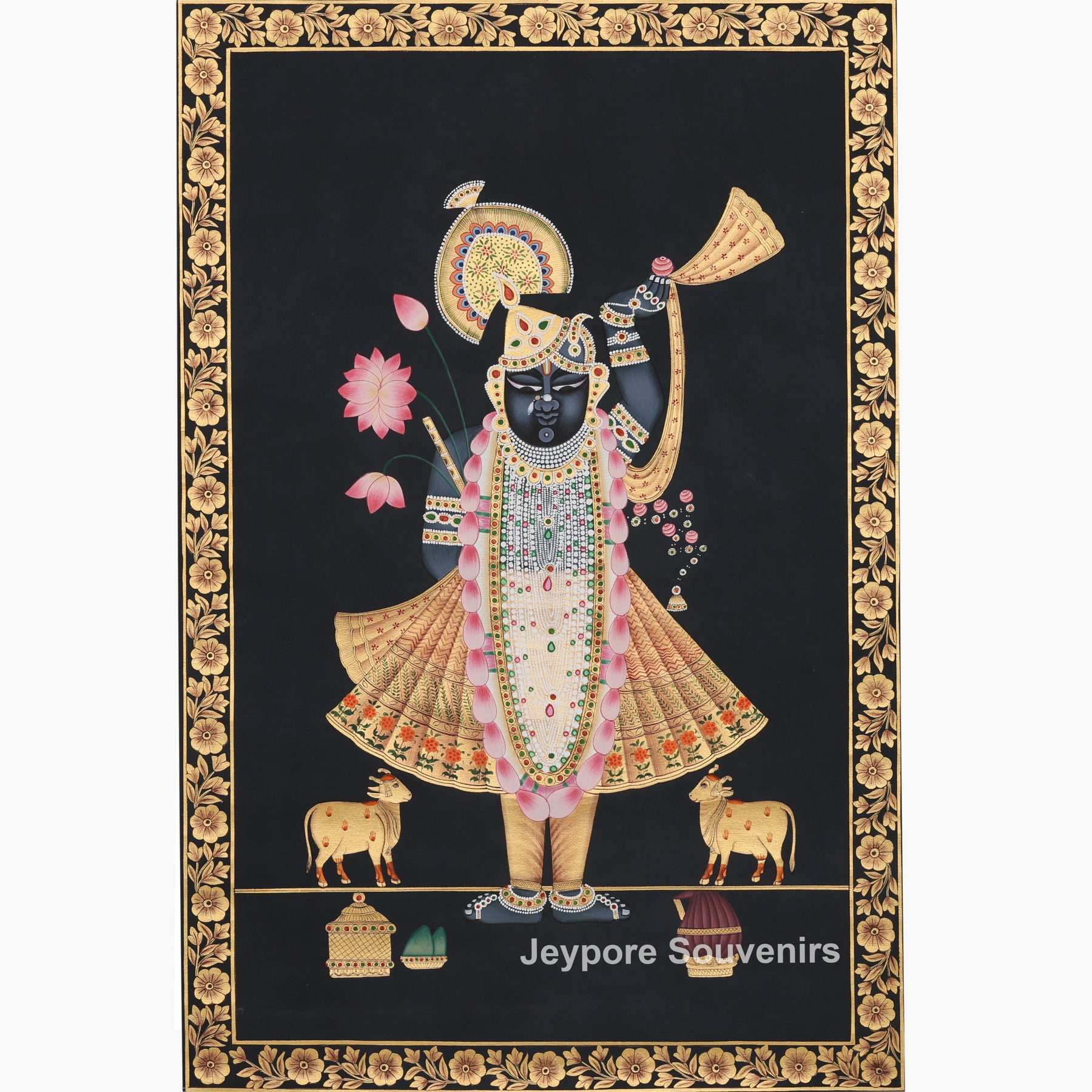 The composition is framed with an ornate floral border inspired by traditional temple aesthetics. Elements like lotus flowers, sacred cows, and ceremonial objects enhance the spiritual narrative, making this artwork not just a painting but a sacred visual experience.