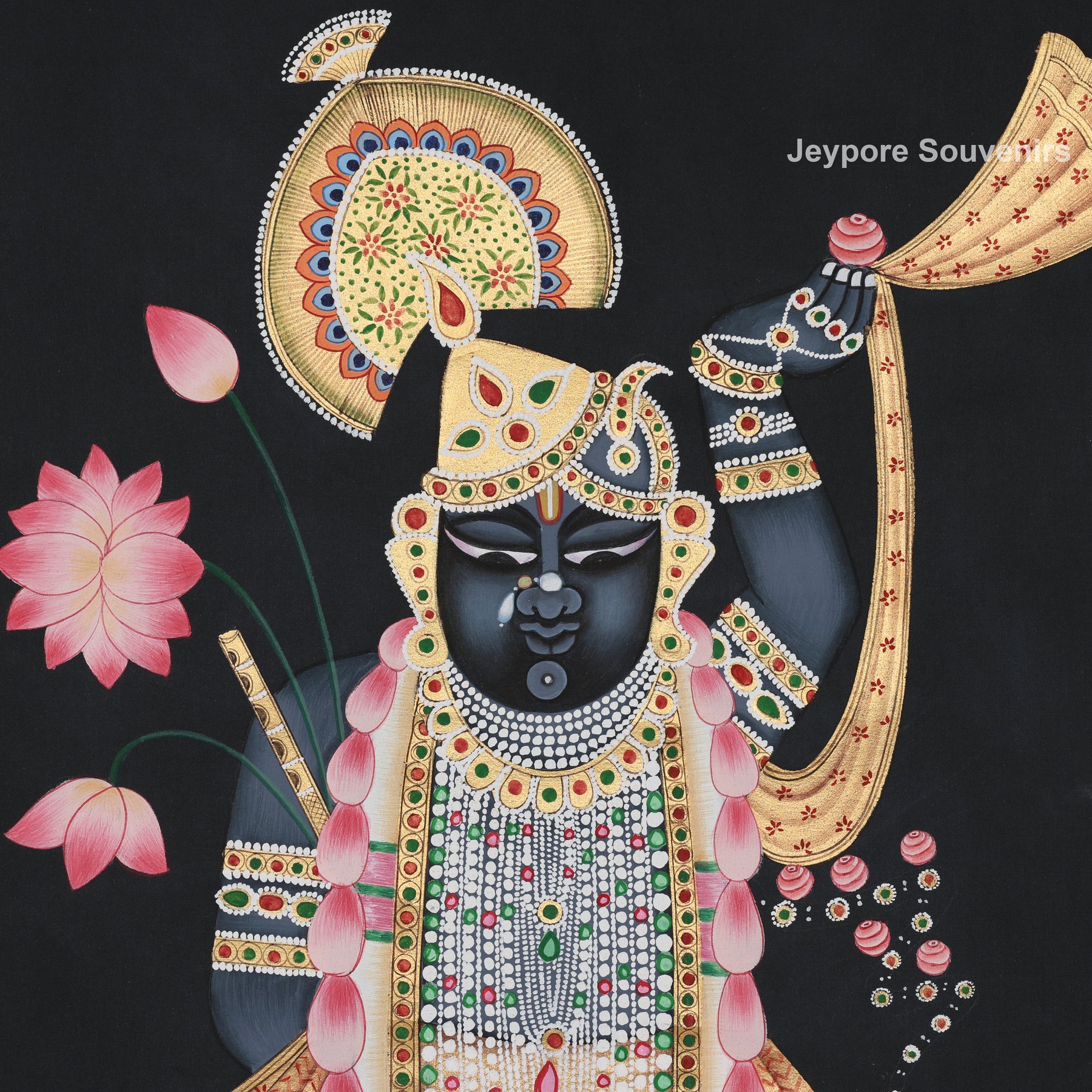 This pichwai painting depicts Shrinathji, the revered child form of Lord Krishna, rendered in the classic Pichwai art style from, Rajasthan. Set against a deep black background, the painting showcases Shrinathji adorned with intricate jewelry, floral garlands, and rich textile details, symbolizing divine grace and devotion.