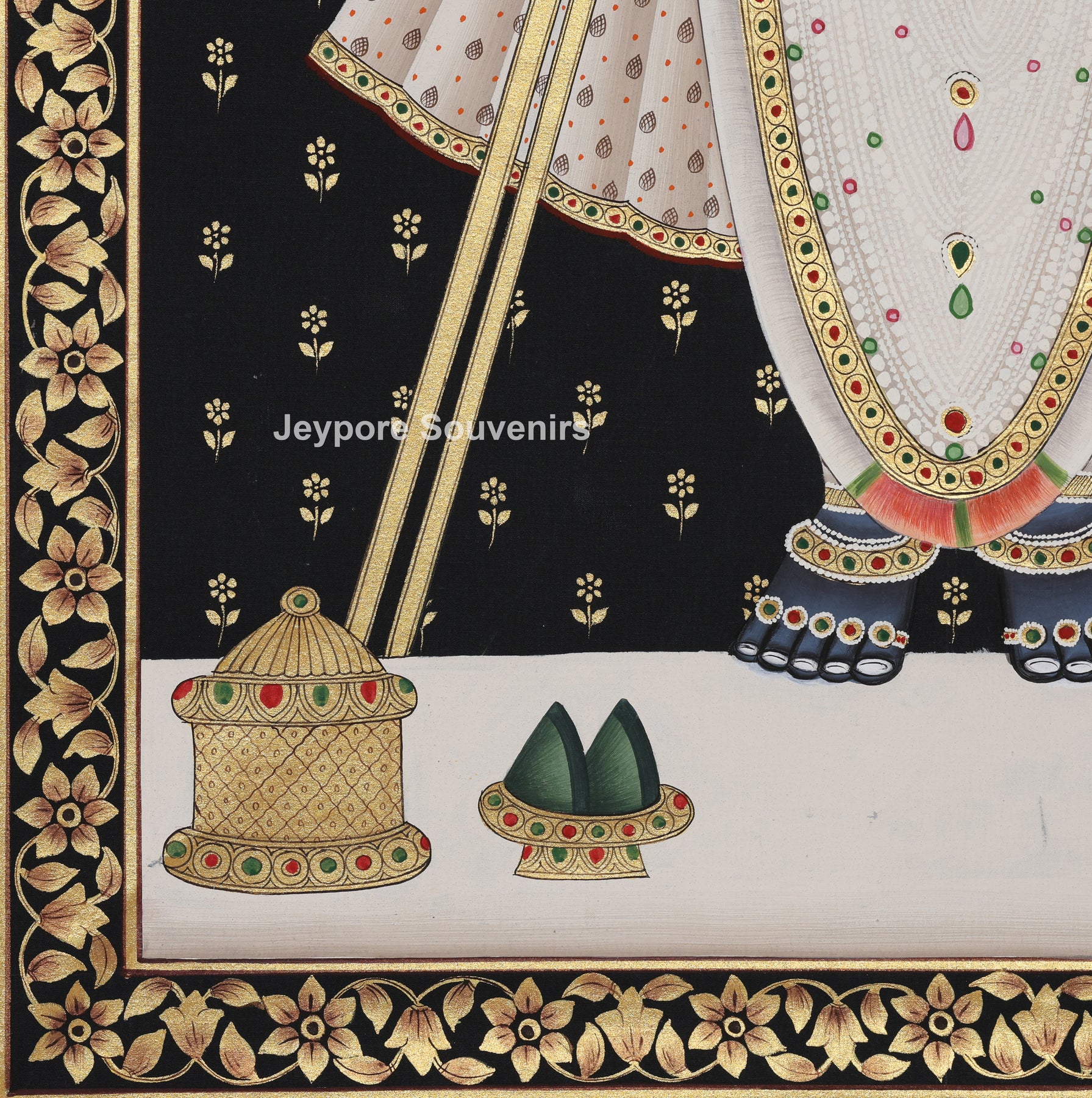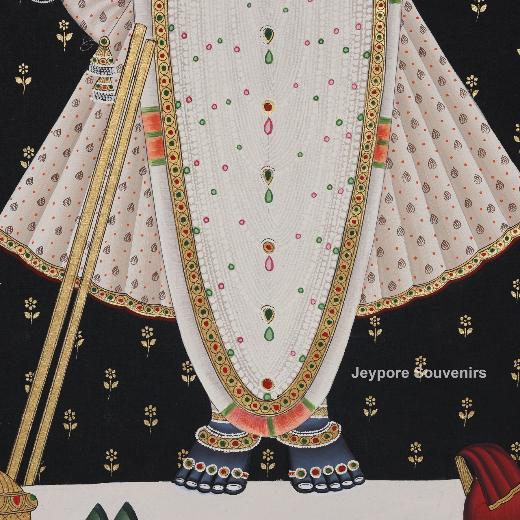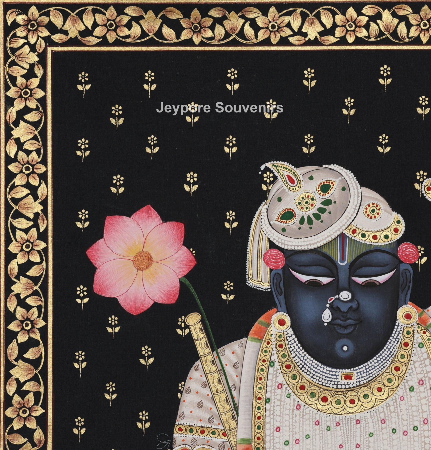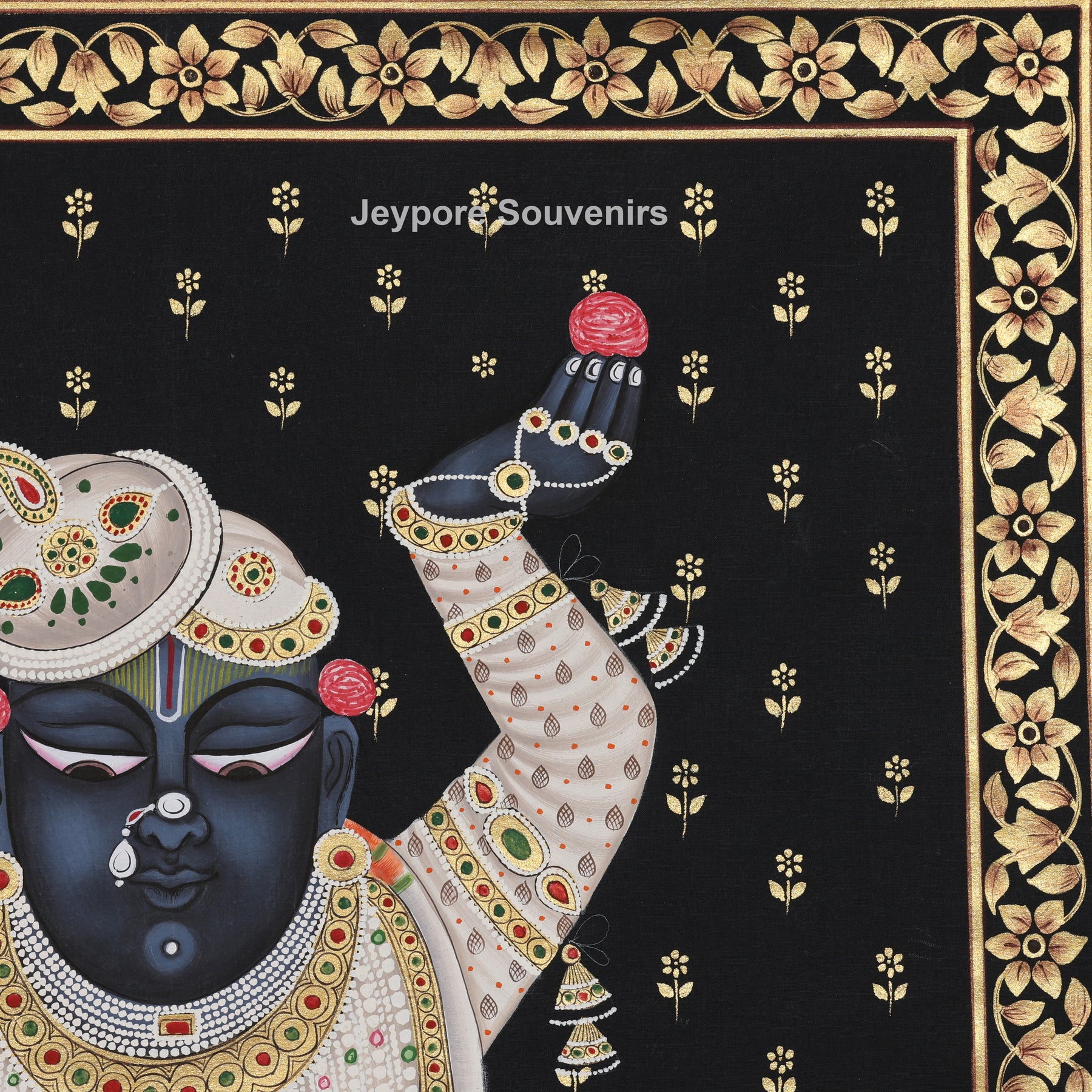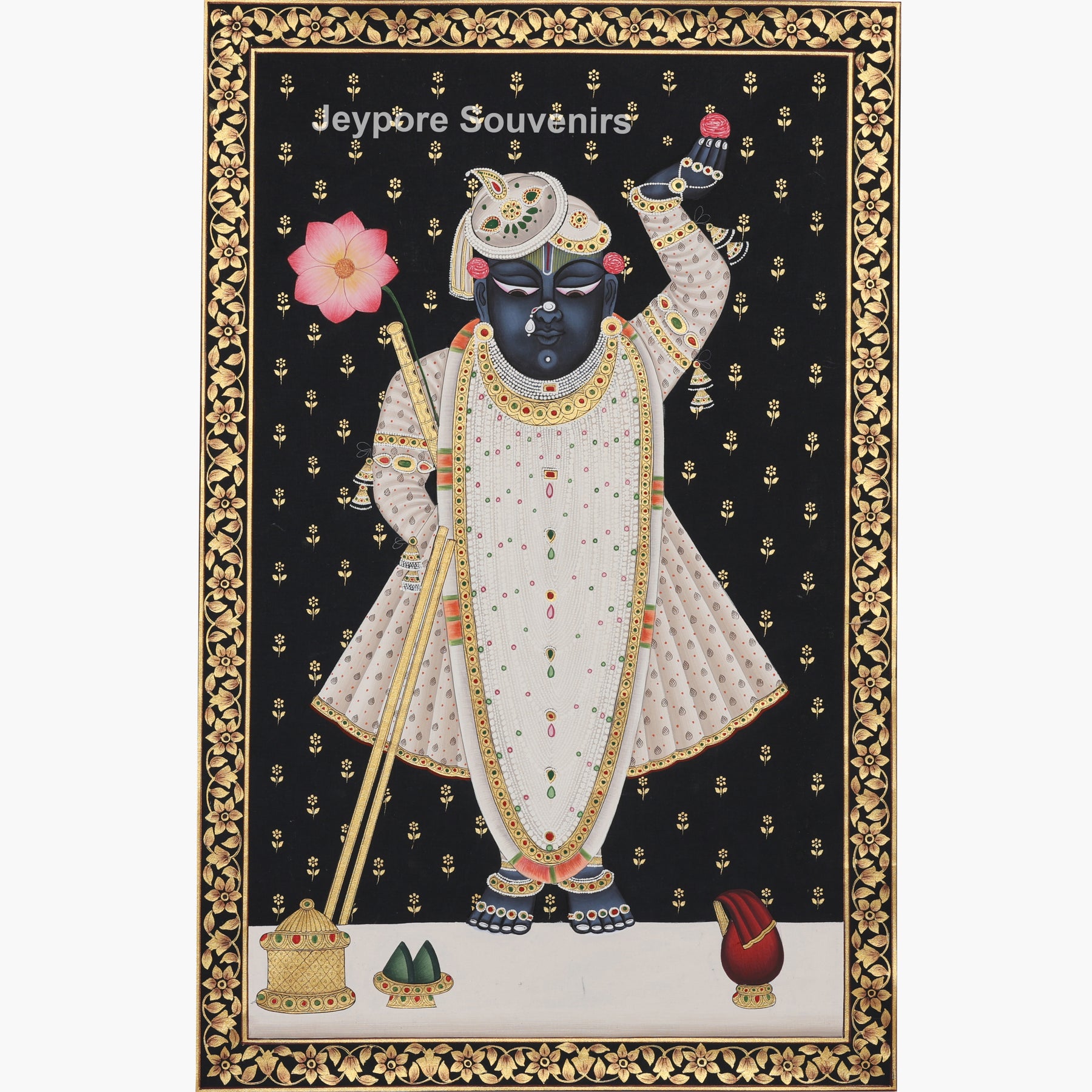 This exquisite Shrinathji Pichwai painting, inspired by the sacred art tradition of Rajasthan. Depicting Shrinathji in a graceful standing posture, this artwork is richly detailed with traditional ornaments, intricate patterns, and a striking black background highlighted with gold floral motifs.