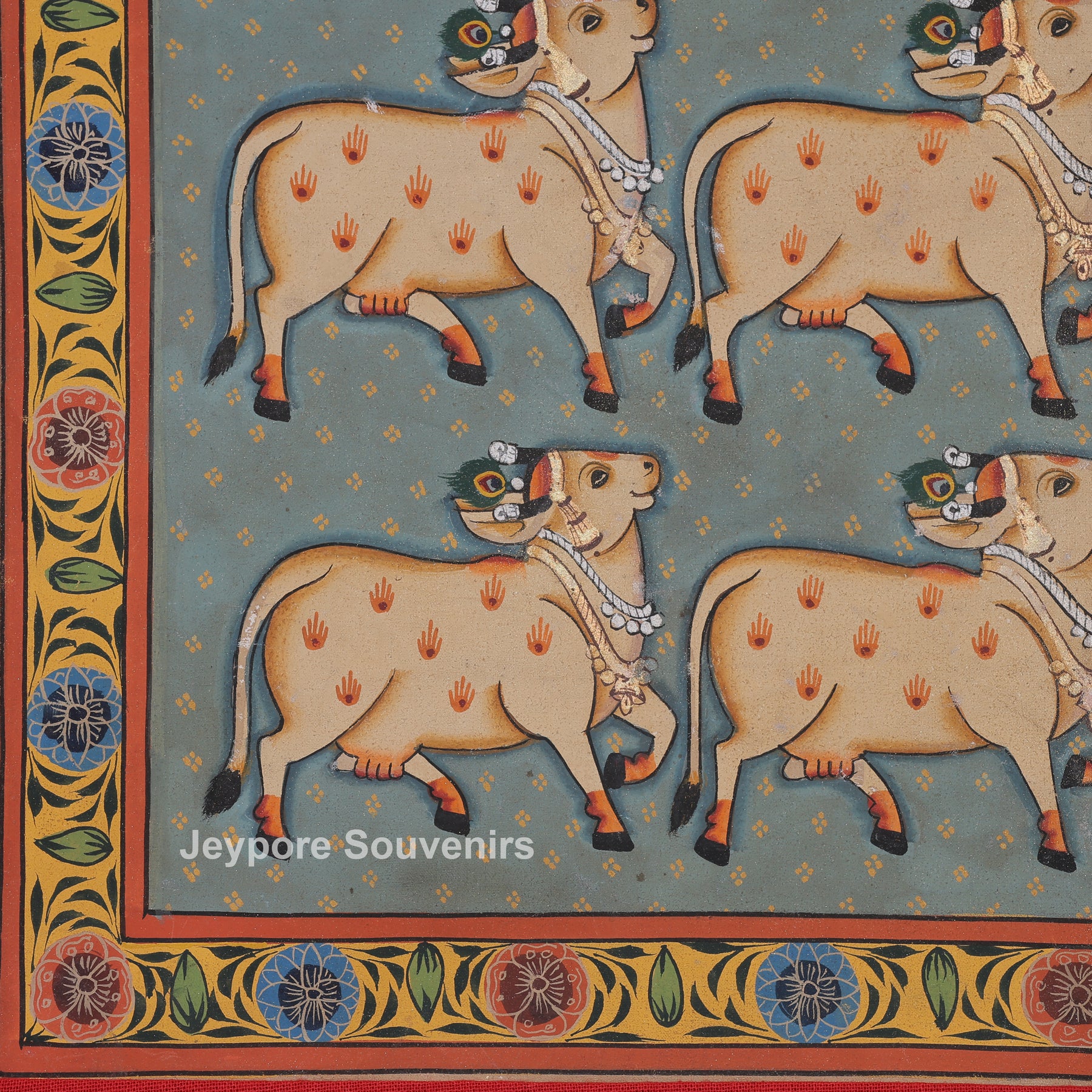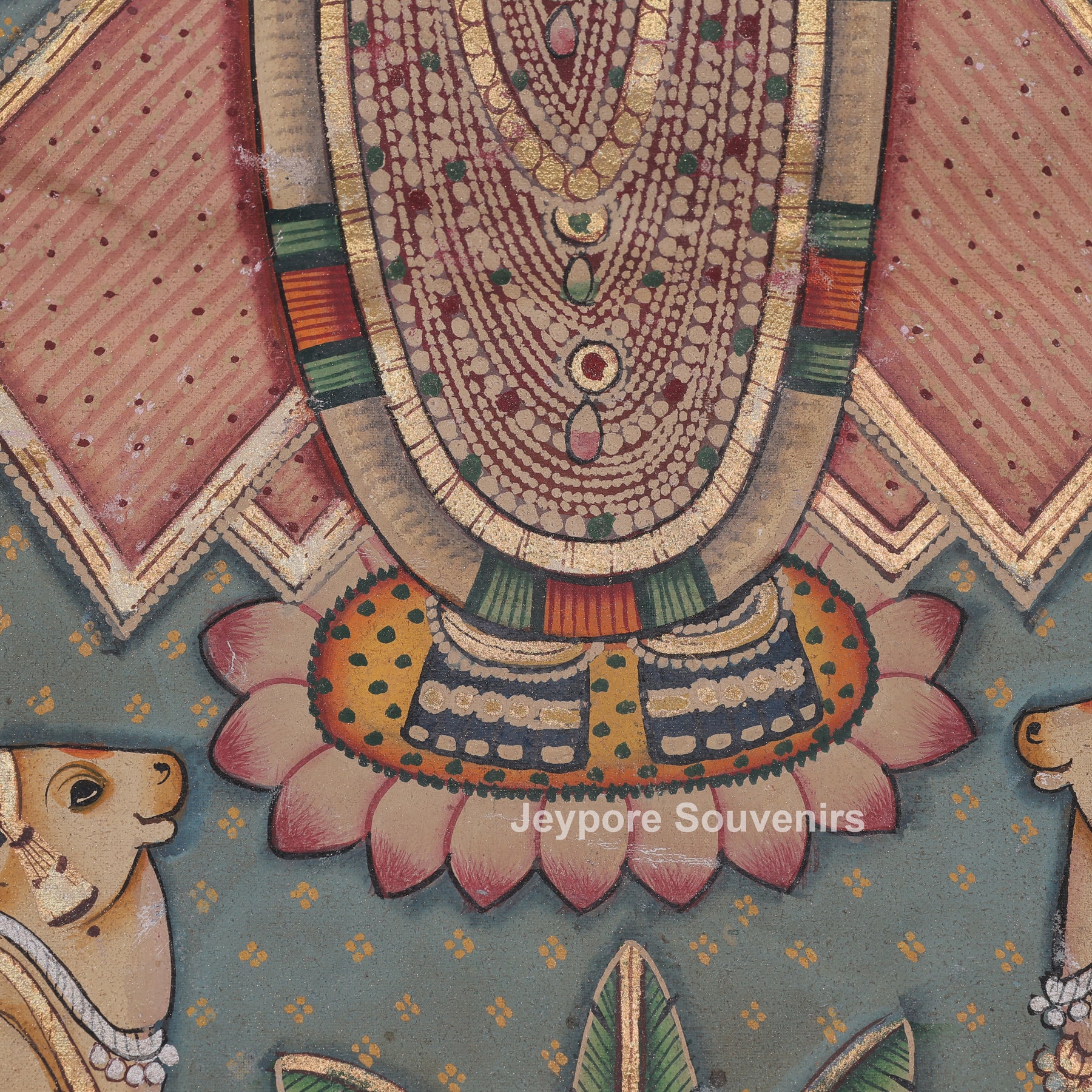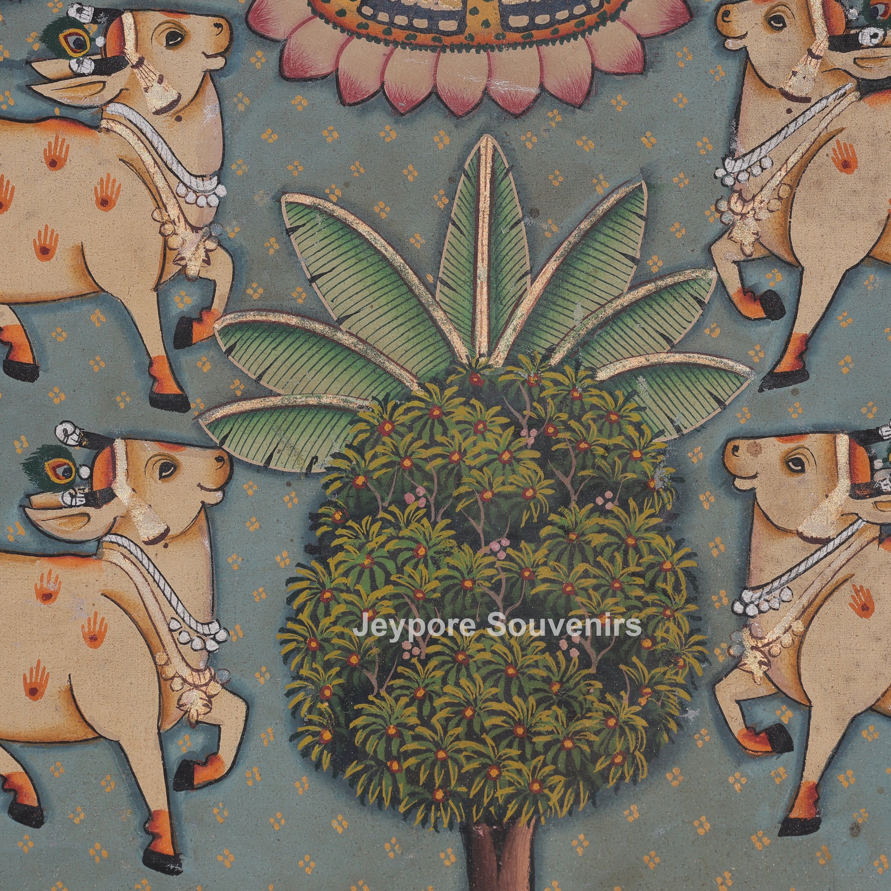 A beautifully handmade shrinathji pichwai painting traditional painting with a central sacred figure standing on a raised platform inside a decorated shrine-like space. The figure is richly dressed with fine ornaments, patterned clothing, and colorful details, giving a calm and divine presence. Around the central figure, several cows are arranged in a balanced and repeating pattern, creating a sense of harmony and devotion. The background is bright and filled with warm colors, floral designs, and decorative borders that enhance the overall look. At the bottom, lotus flowers grow in neat rows, adding peace and purity to the scene. The steps and architectural details suggest a holy or respectful setting. No people are shown in action; instead, the image focuses on stillness, devotion, and beauty through careful artistic work and traditional design elements