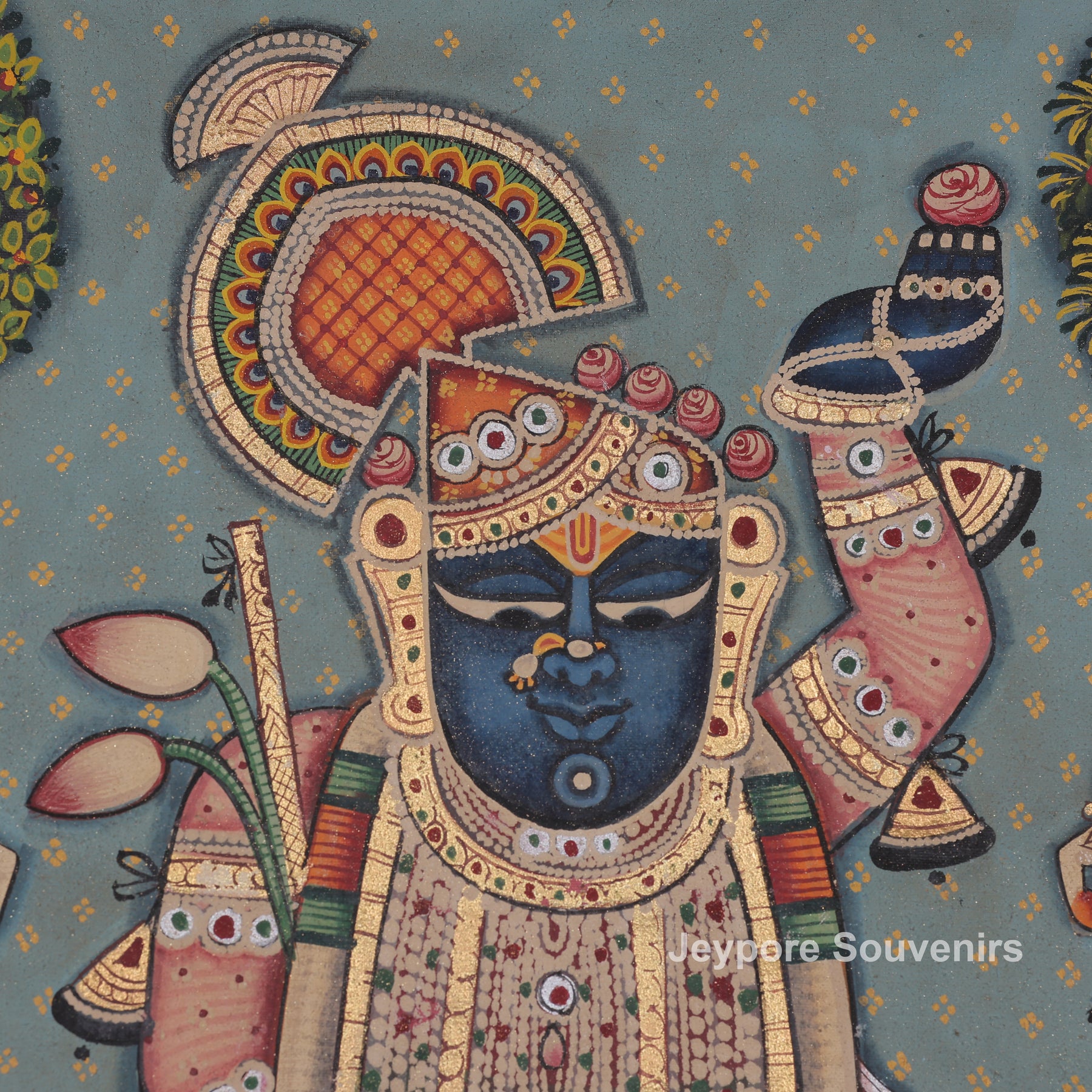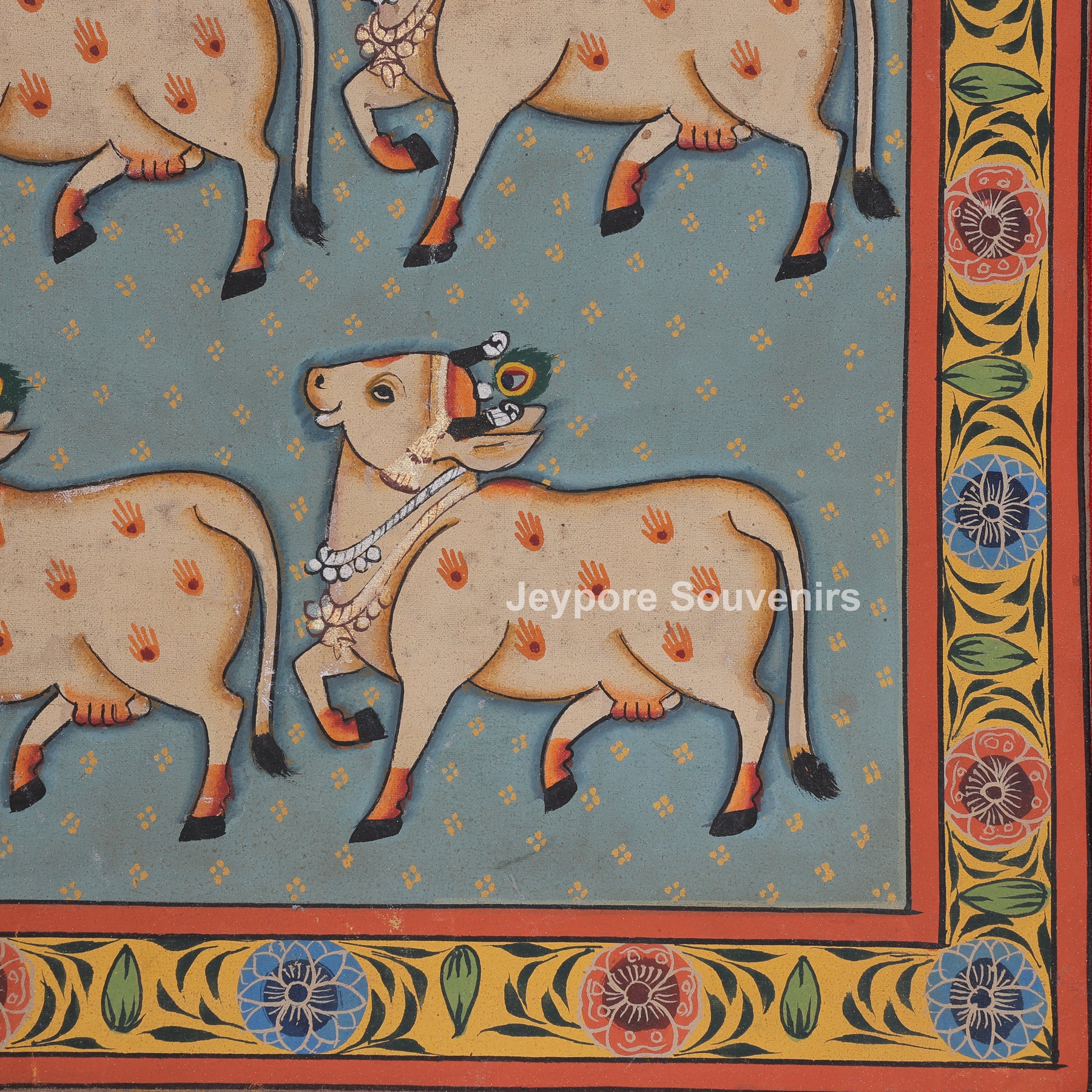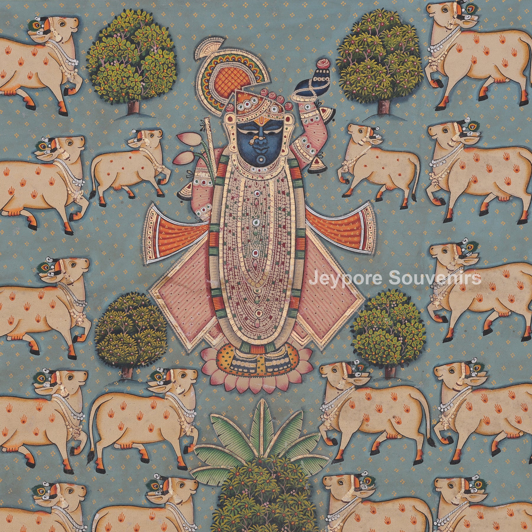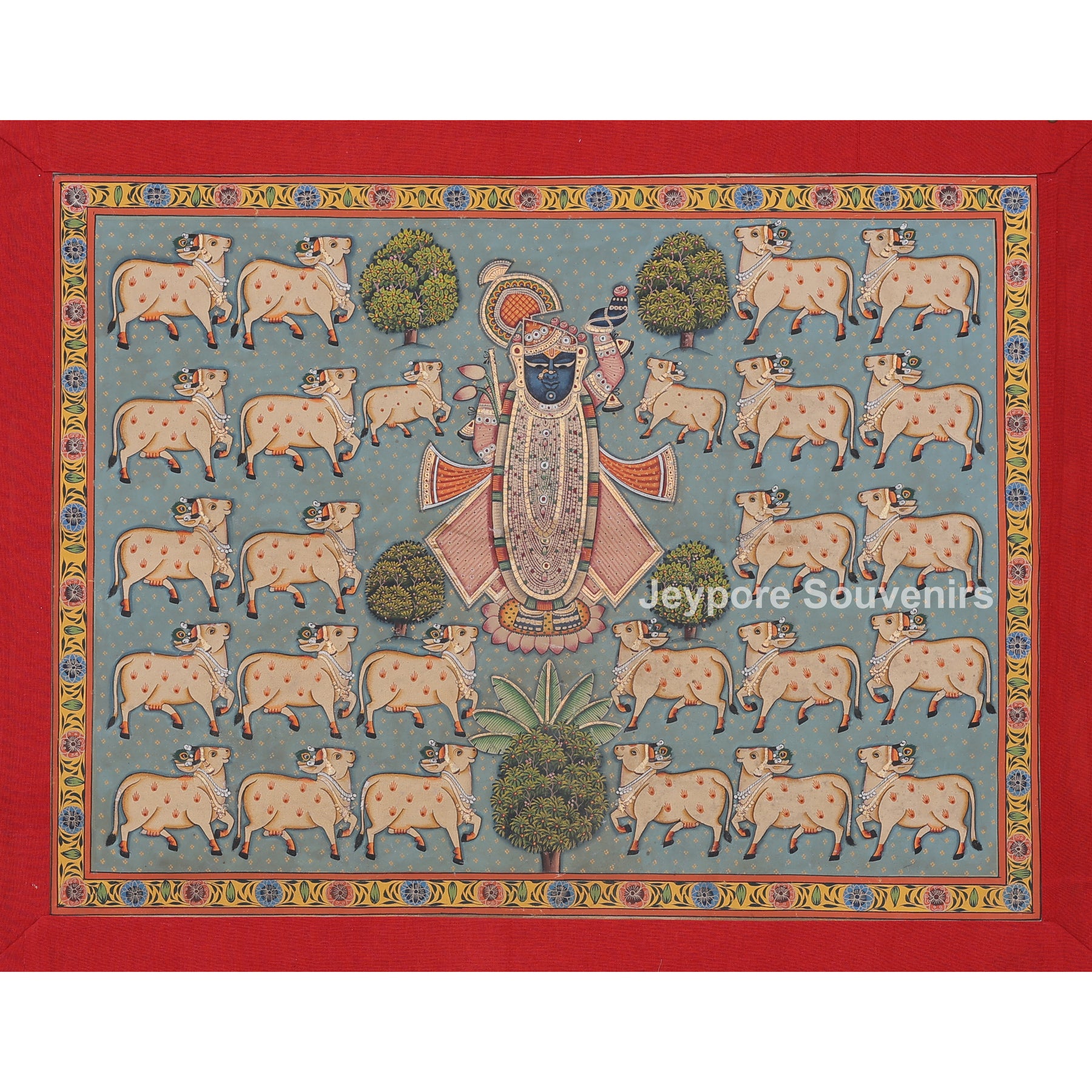 A beautifully handmade shrinathji pichwai painting traditional painting with a central sacred figure standing on a raised platform inside a decorated shrine-like space. The figure is richly dressed with fine ornaments, patterned clothing, and colorful details, giving a calm and divine presence. Around the central figure, several cows are arranged in a balanced and repeating pattern, creating a sense of harmony and devotion. The background is bright and filled with warm colors, floral designs, and decorative borders that enhance the overall look. At the bottom, lotus flowers grow in neat rows, adding peace and purity to the scene. The steps and architectural details suggest a holy or respectful setting. No people are shown in action; instead, the image focuses on stillness, devotion, and beauty through careful artistic work and traditional design elements