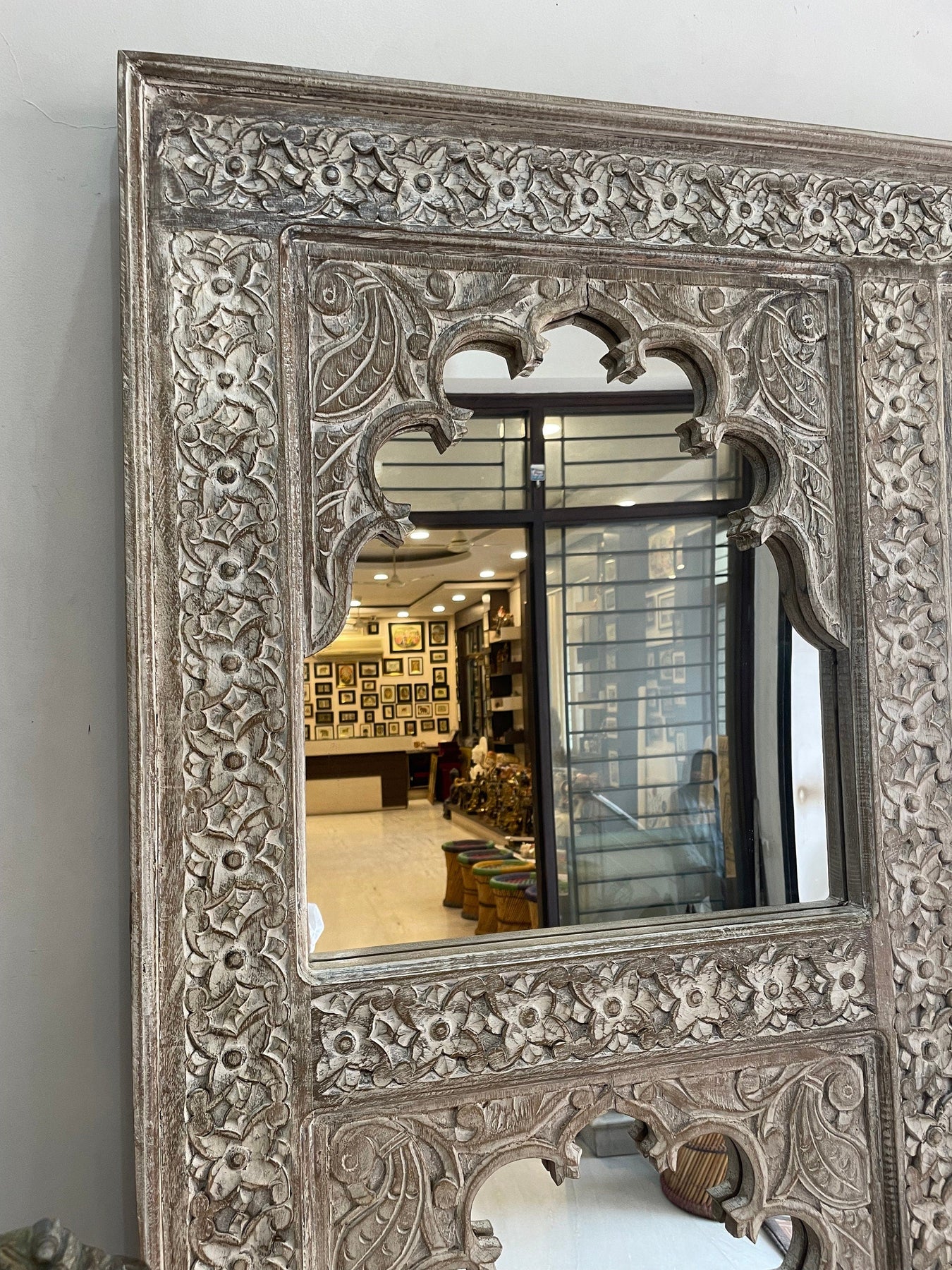 Hand carved 4 Jharokha Mirror | Wooden frame in Distressed Rustic Finish