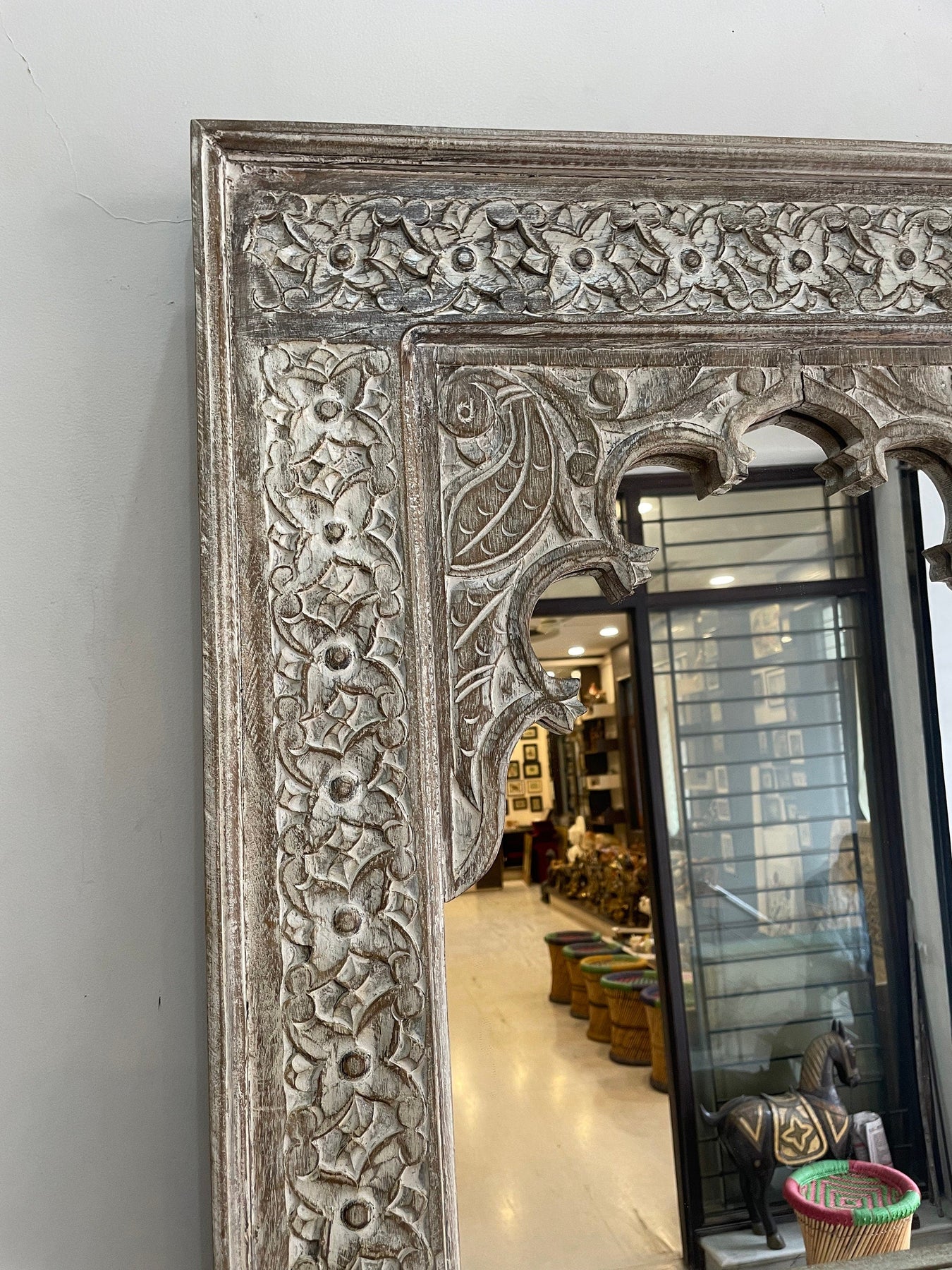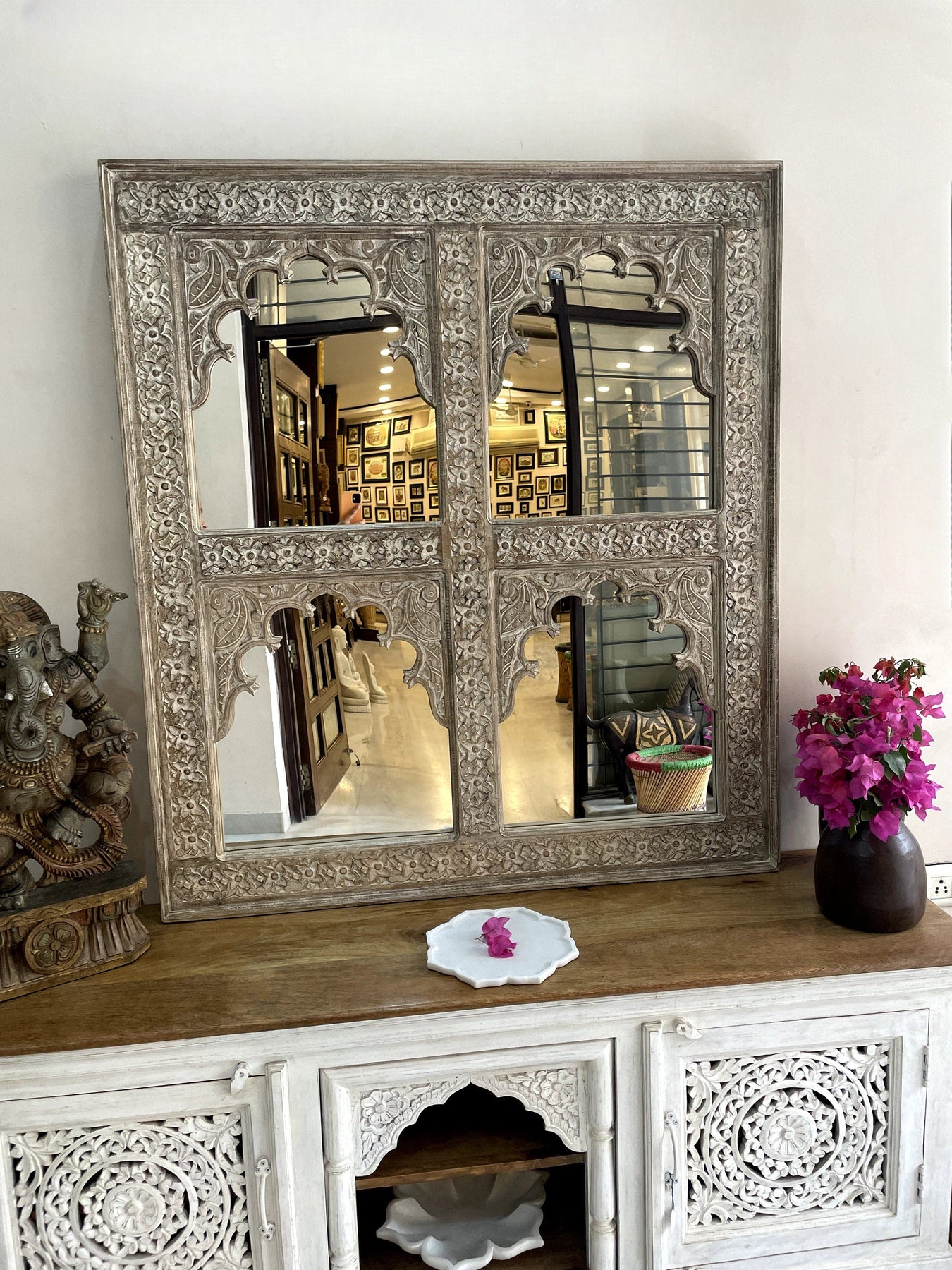 Enhance your space with this beautifully carved Distressed Jharokha wooden frame with 4 mirrors!