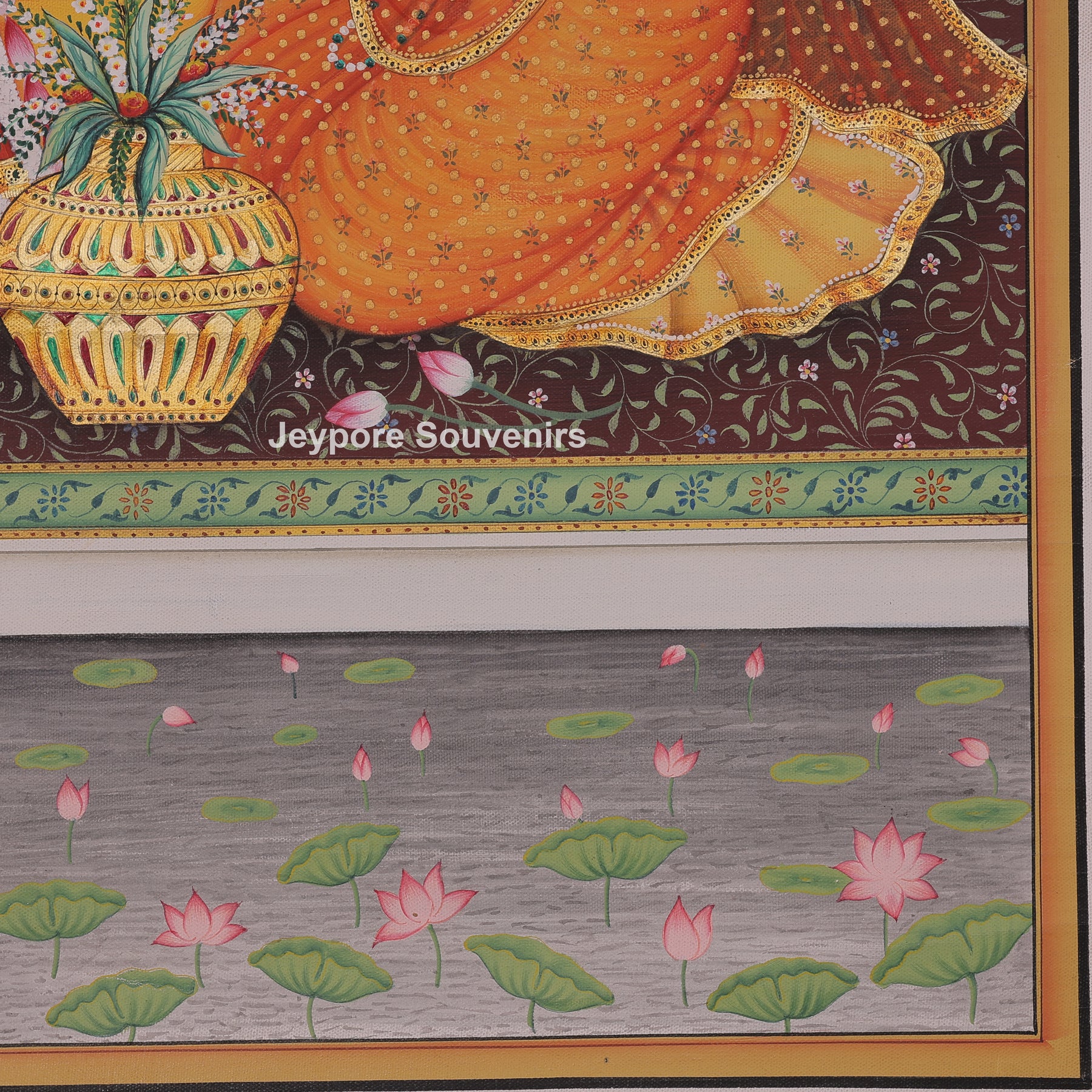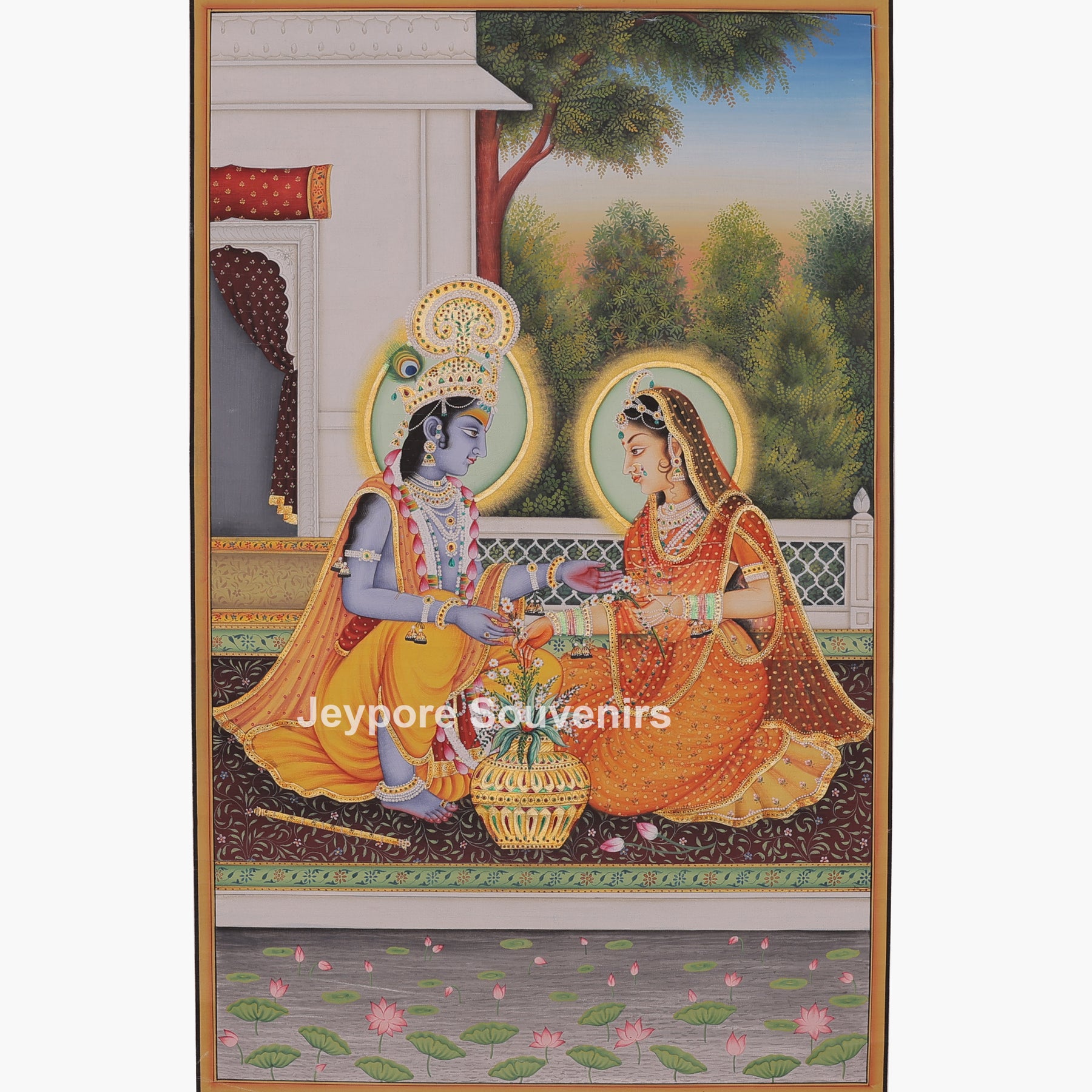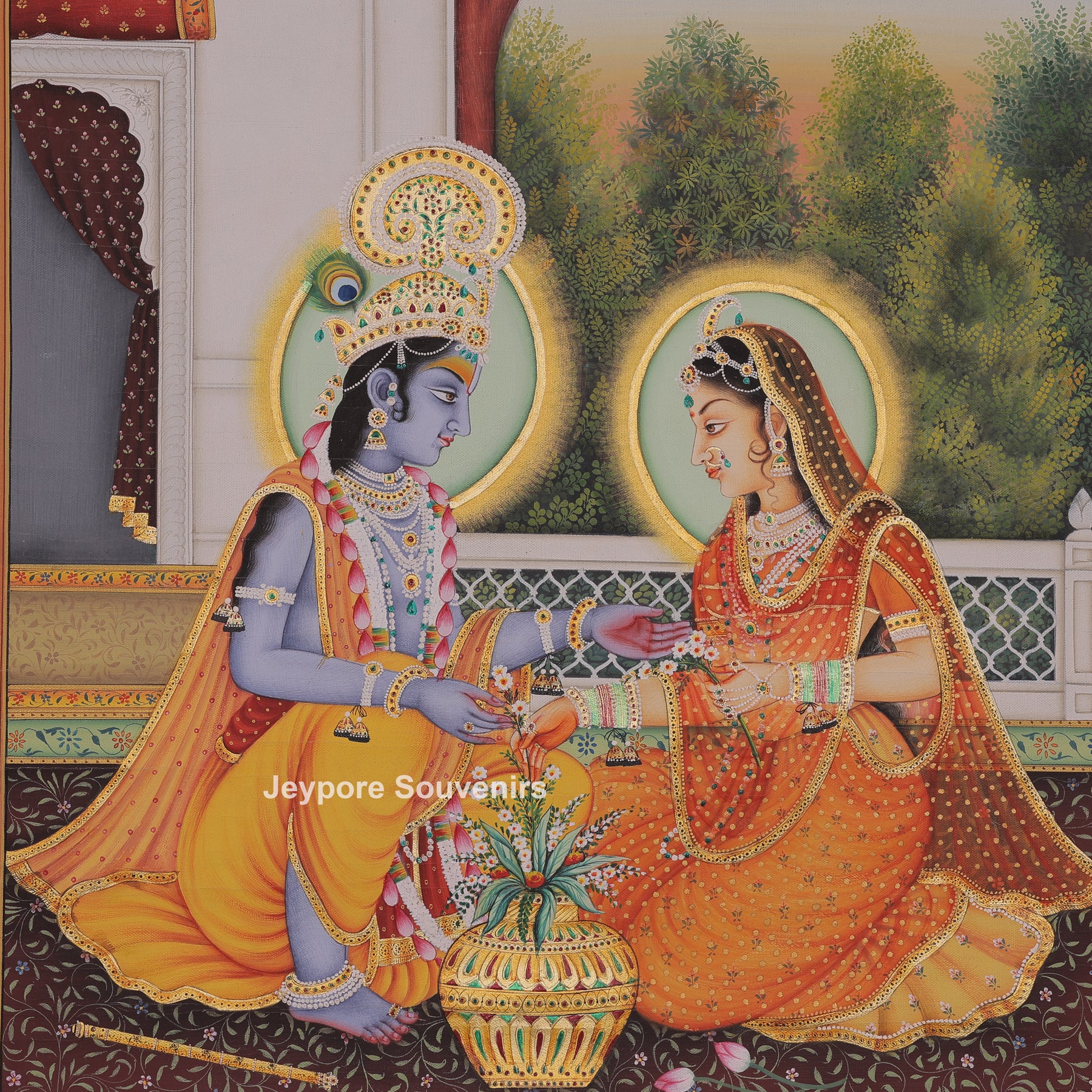 This painting shows Krishna and Radha sitting peacefully together on a decorated platform. Krishna is gently offering flowers to Radha, and Radha is looking at him with a calm and loving expression. Both are wearing beautiful traditional clothes and jewelry. A flower pot is placed between them, showing care and devotion. Behind them is a palace wall, trees, and a soft evening sky. Below, lotus flowers float on water, adding beauty to the scene. The image shows love, peace, and togetherness in a quiet royal setting