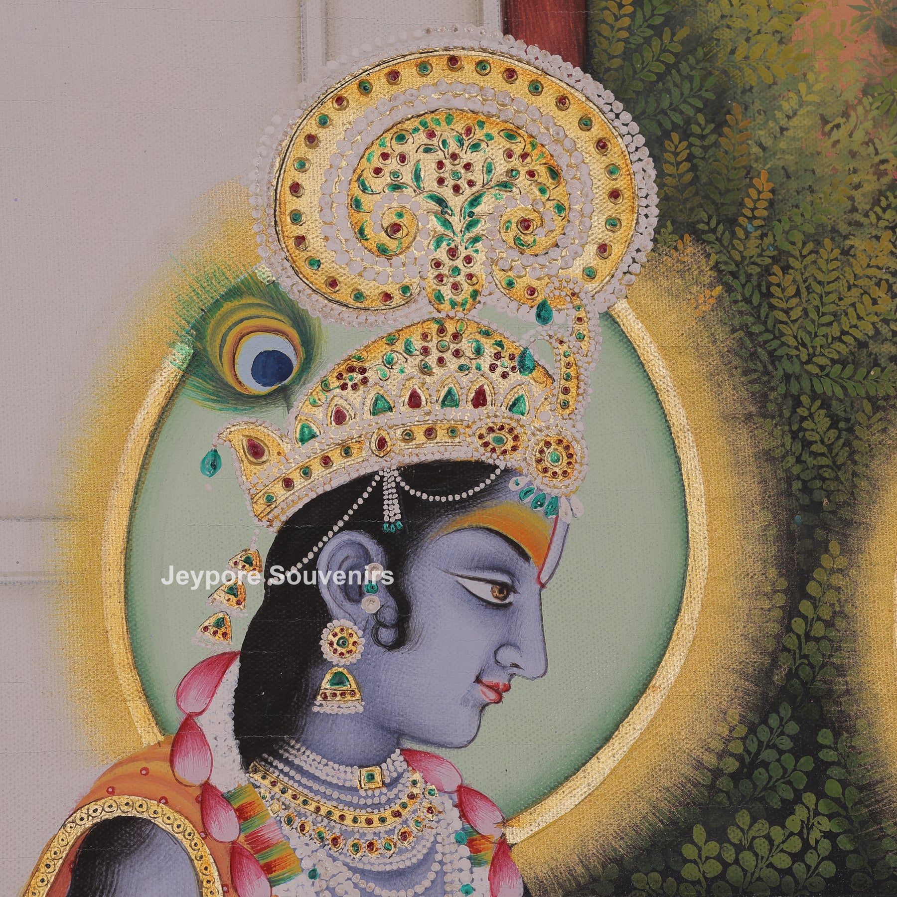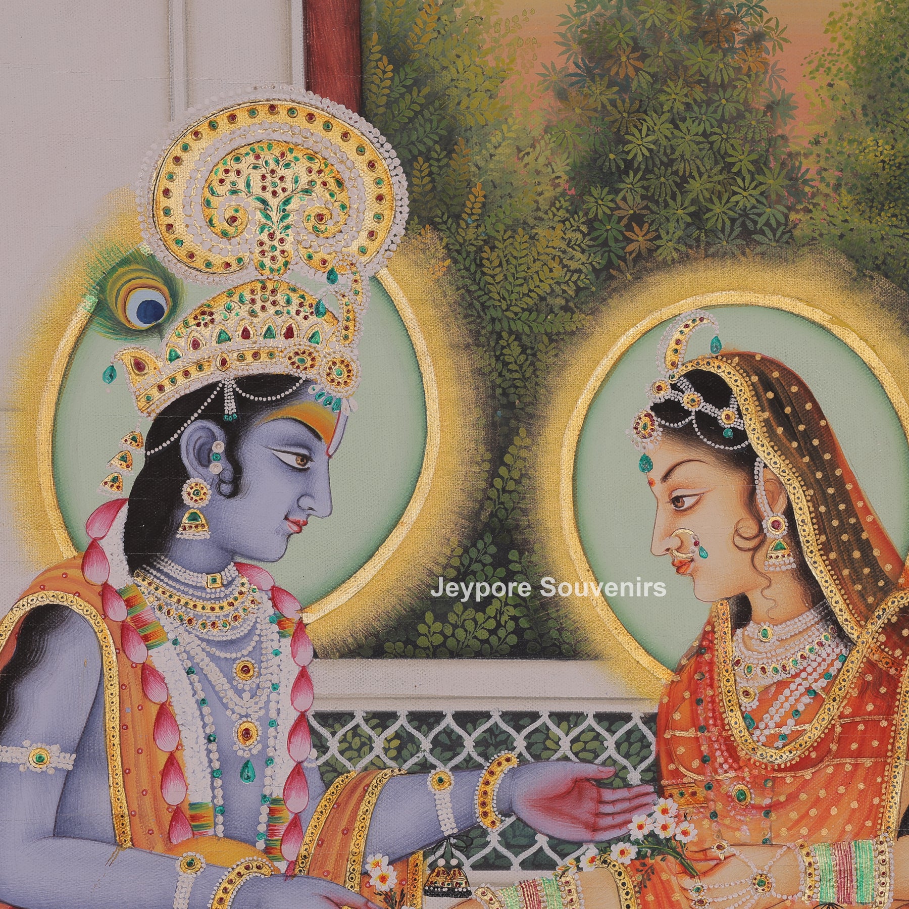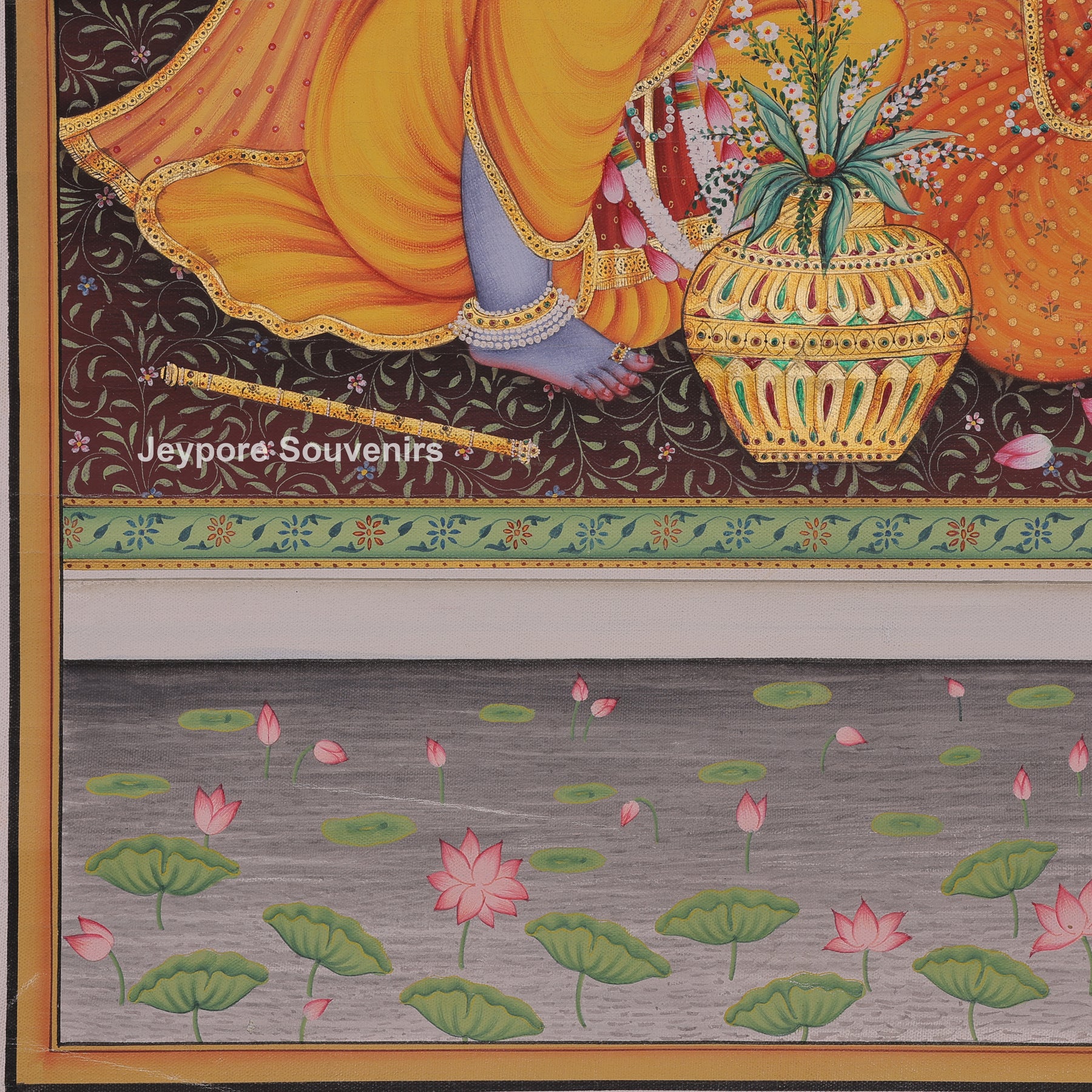 This painting shows Krishna and Radha sitting peacefully together on a decorated platform. Krishna is gently offering flowers to Radha, and Radha is looking at him with a calm and loving expression. Both are wearing beautiful traditional clothes and jewelry. A flower pot is placed between them, showing care and devotion. Behind them is a palace wall, trees, and a soft evening sky. Below, lotus flowers float on water, adding beauty to the scene. The image shows love, peace, and togetherness in a quiet royal setting