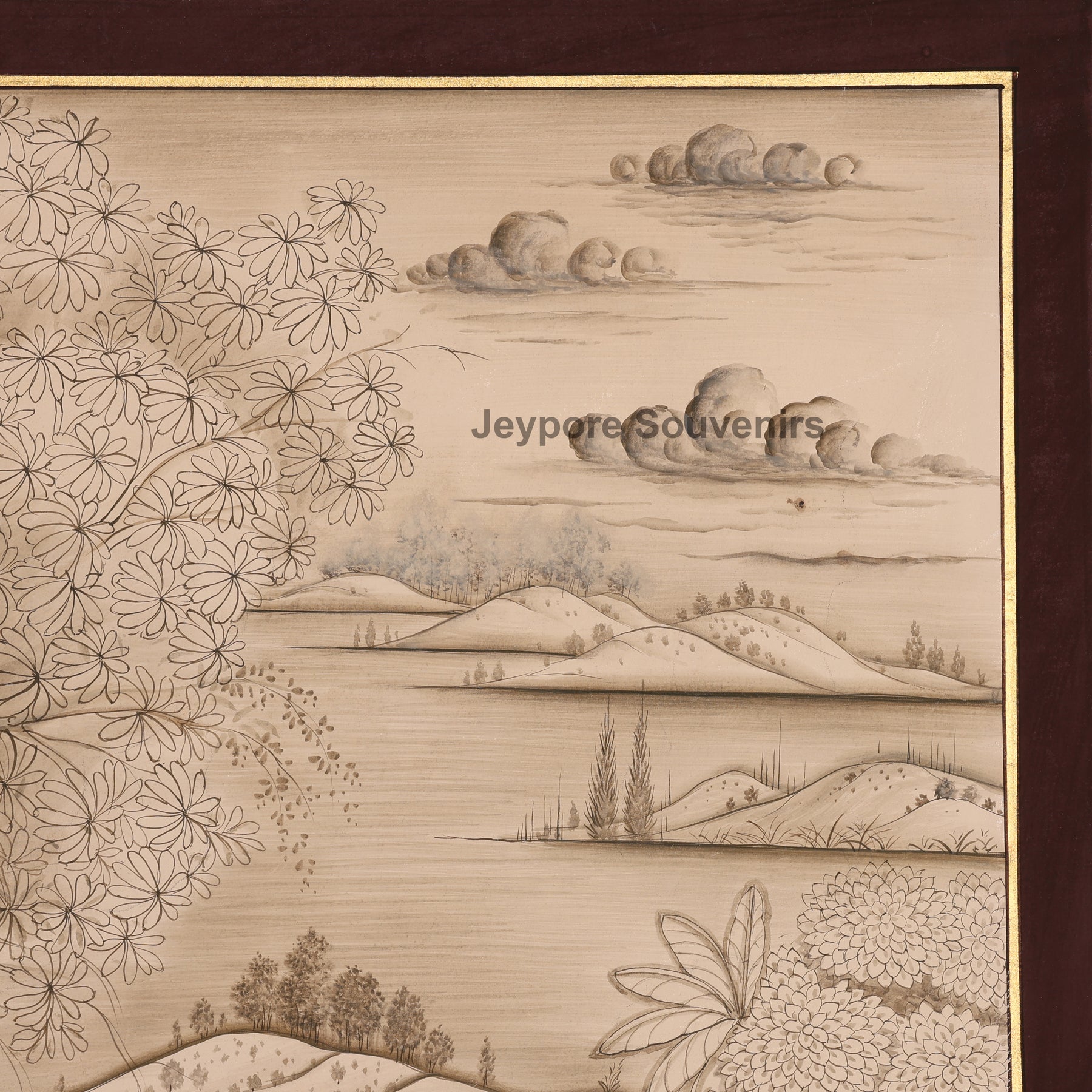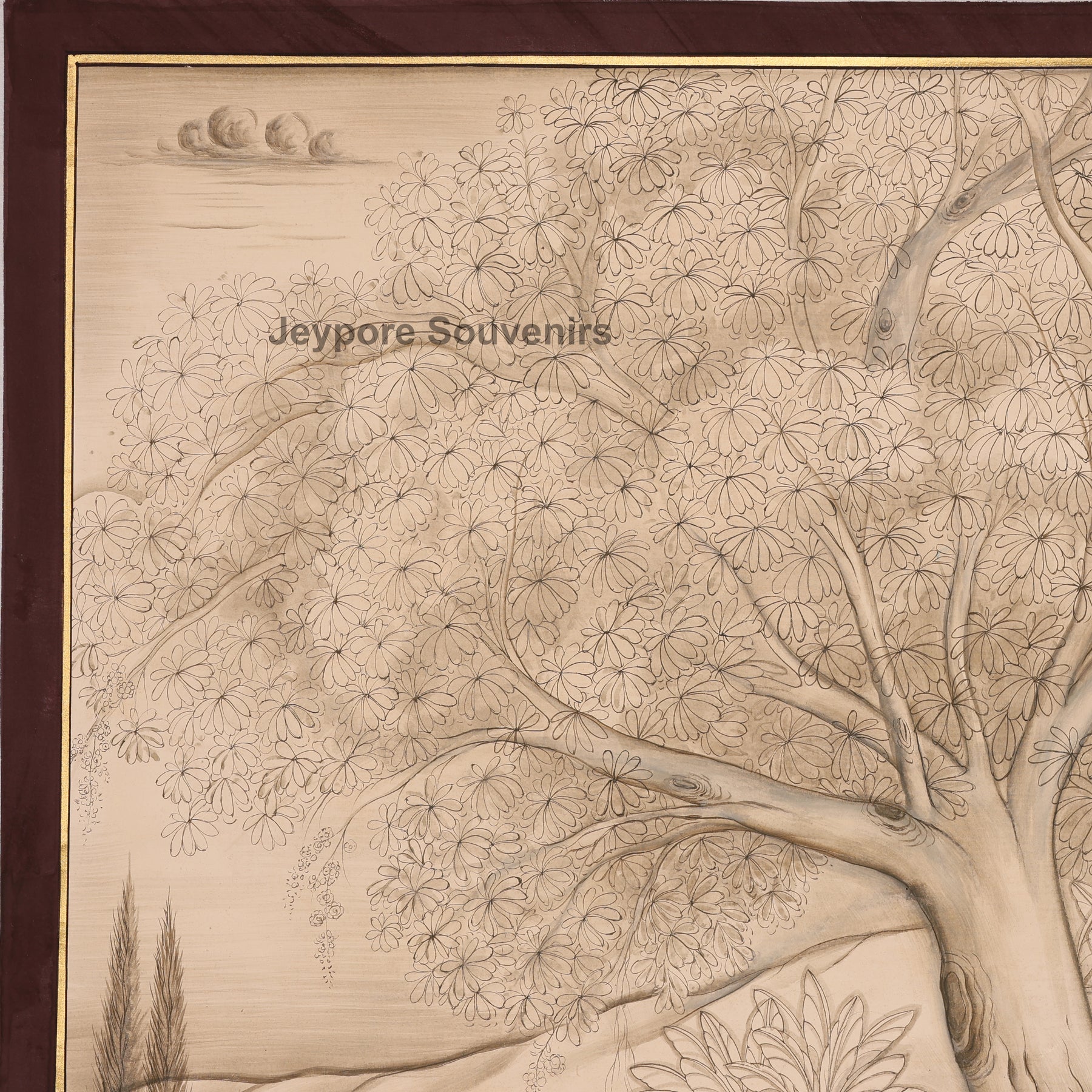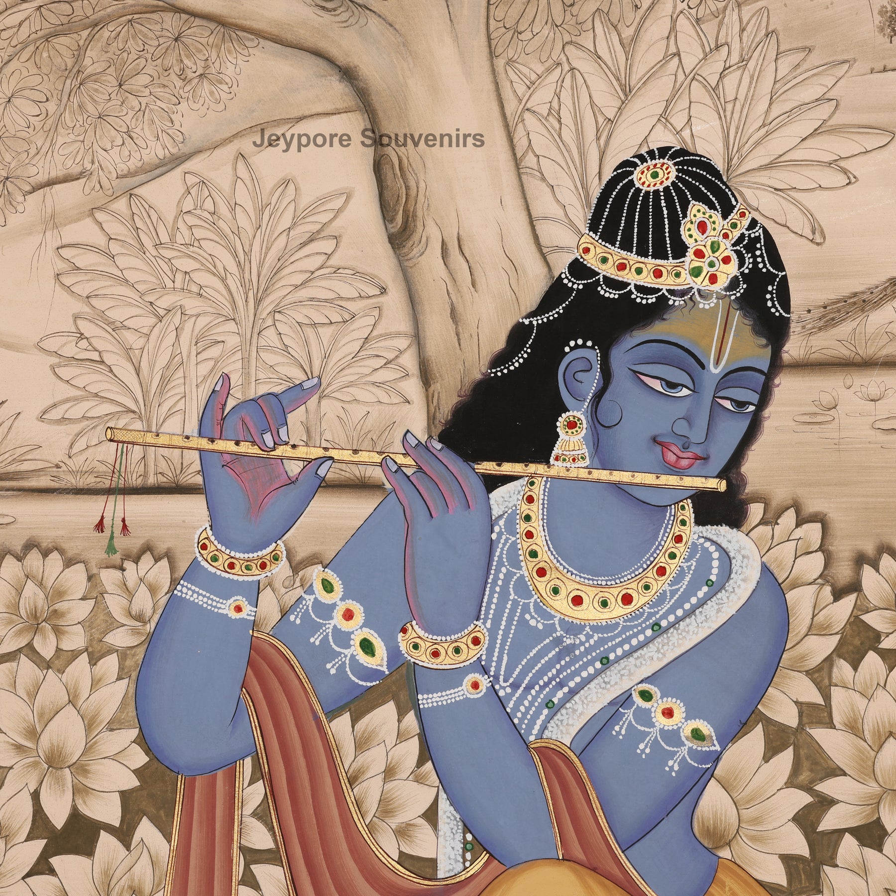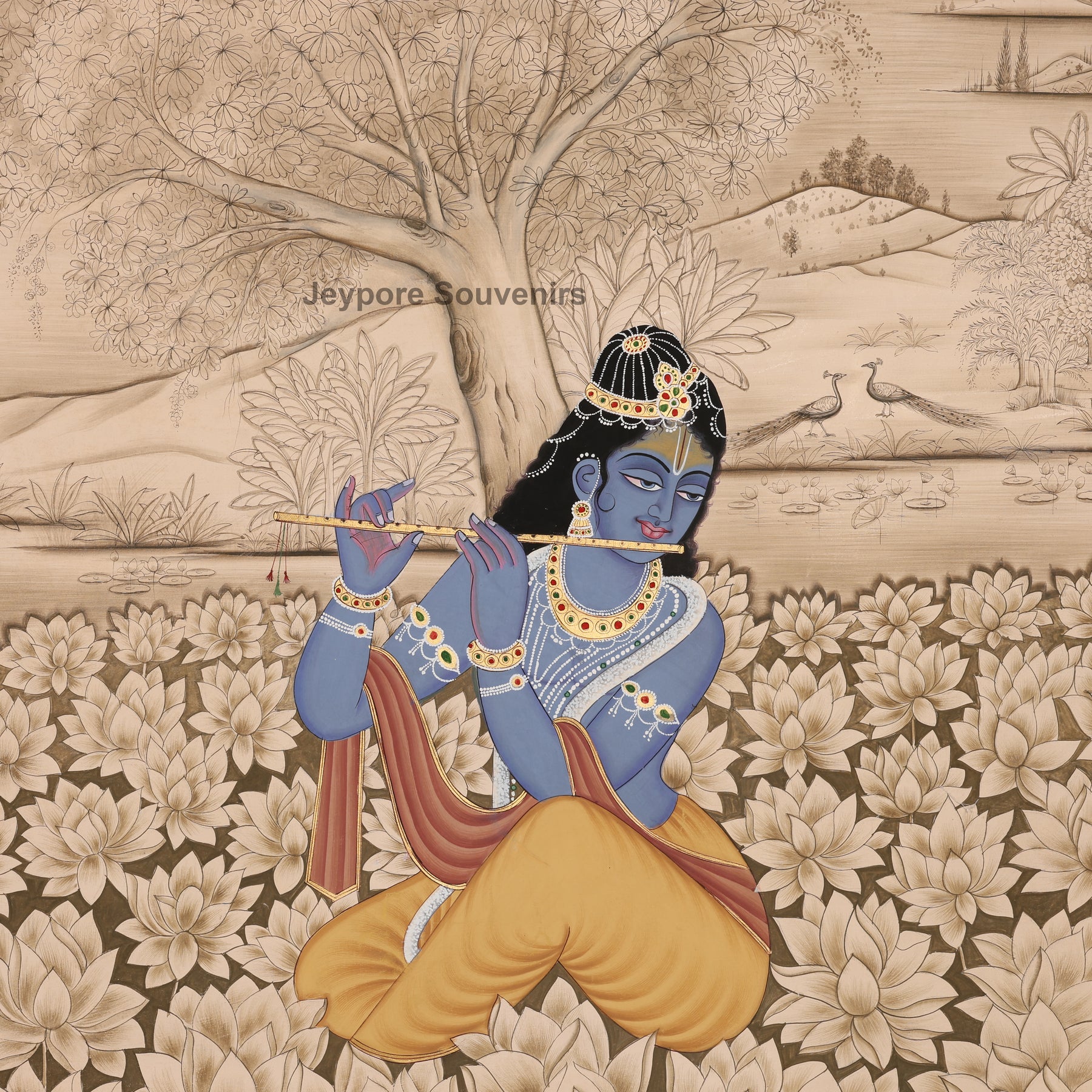 This beautiful hand-painted pichwai painting portrays Lord Krishna in a moment of divine elegance, positioned among a vibrant pond of flourishing lotuses. His distinctive blue skin tone is strikingly set against a monochrome, sepia-hued background, directing all attention to the heavenly central figure. Resting against a grand tree, Krishna plays his golden flute (bansuri), an act representing the soul's summons to the divine. The intricate detailing of his ornaments, the graceful folds of his yellow pitambara (dhoti), and the fragile lotus petals highlight the careful skill of classic Indian craftsmanship.