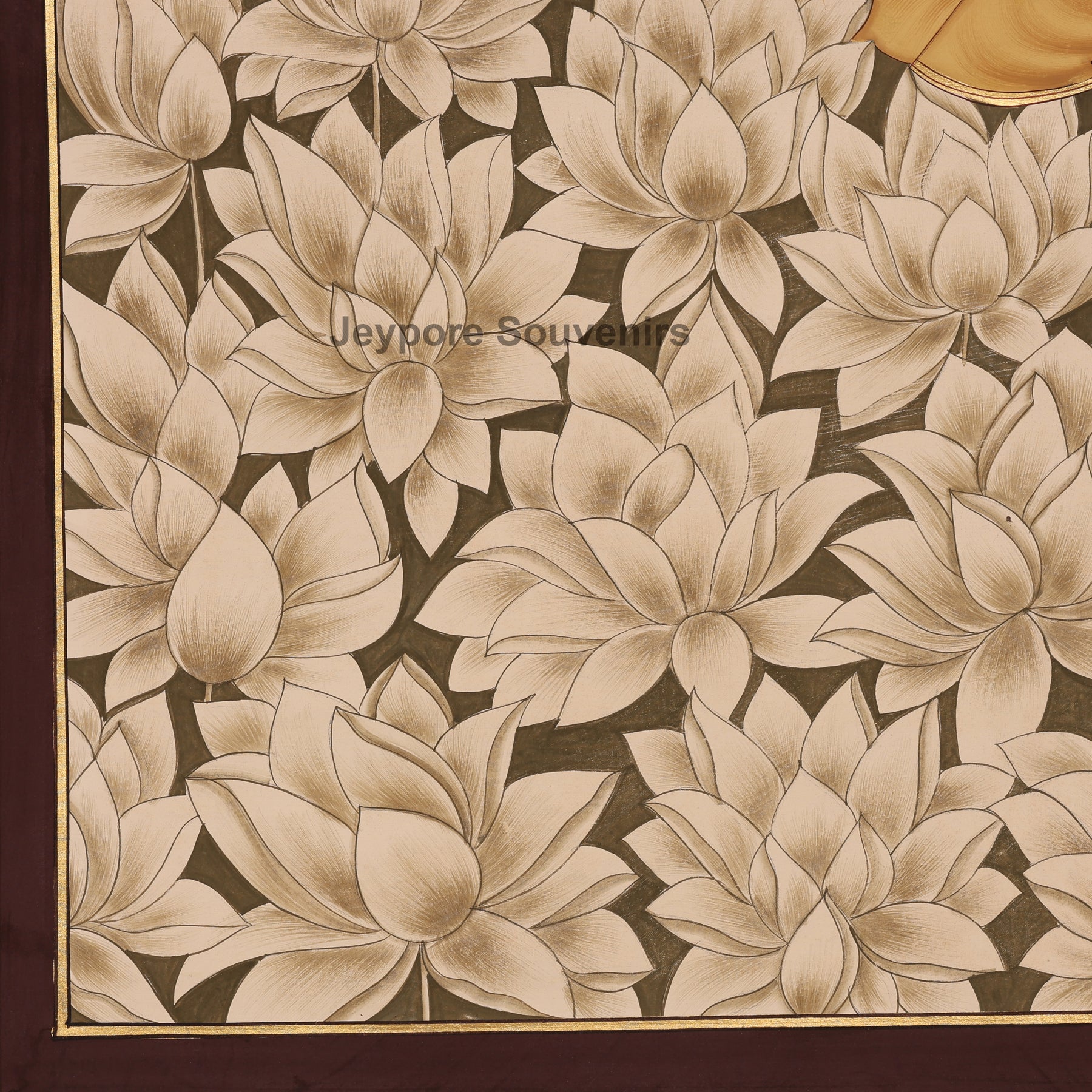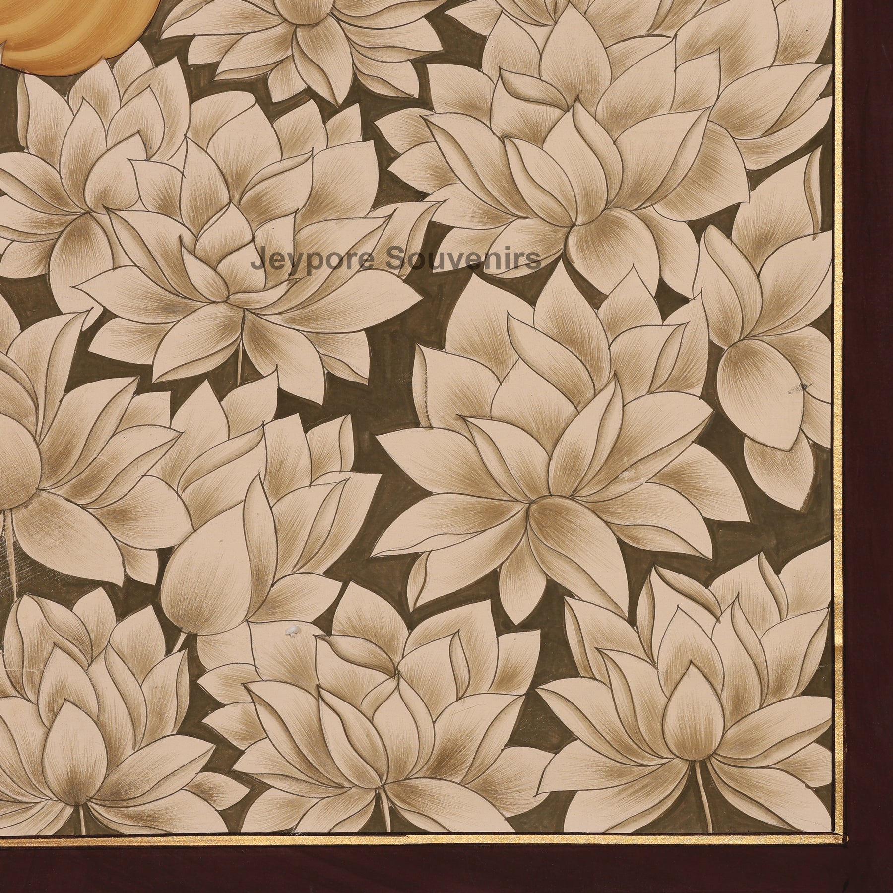 Lord Krishna Playing Flute in Lotus - Hand-Painted Pichwai