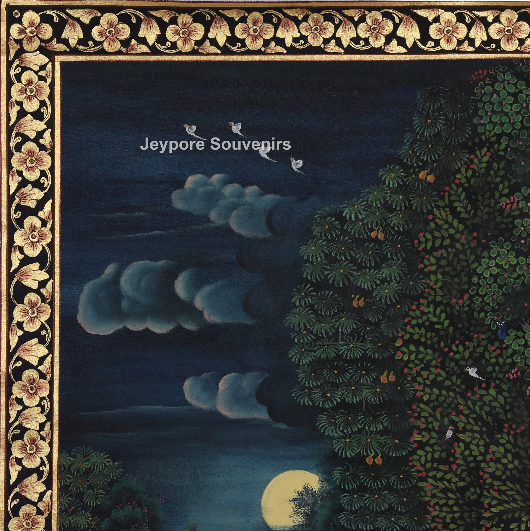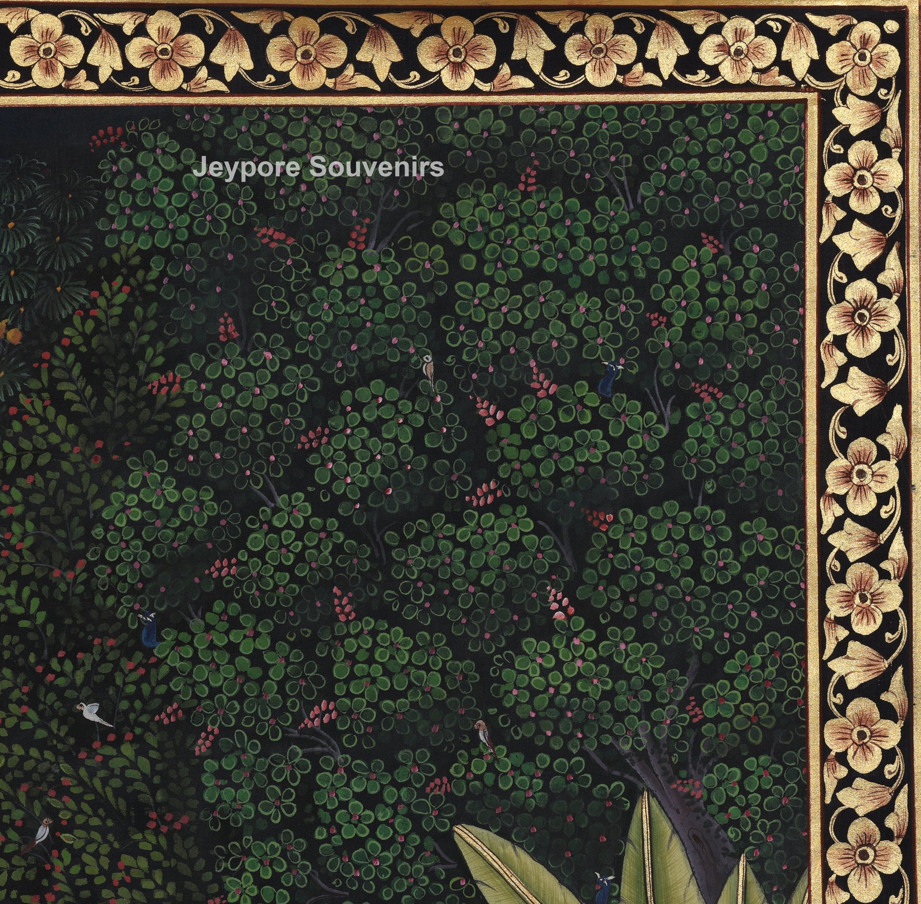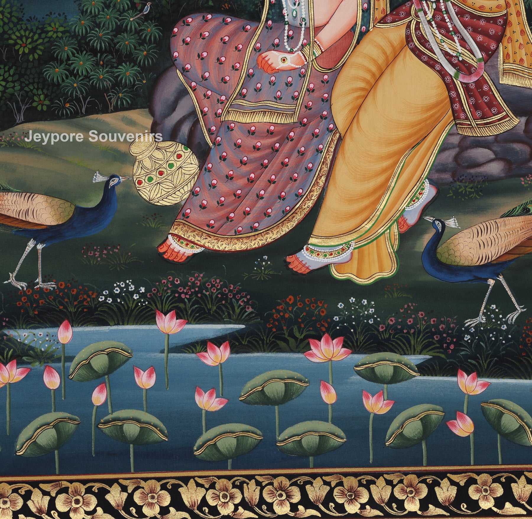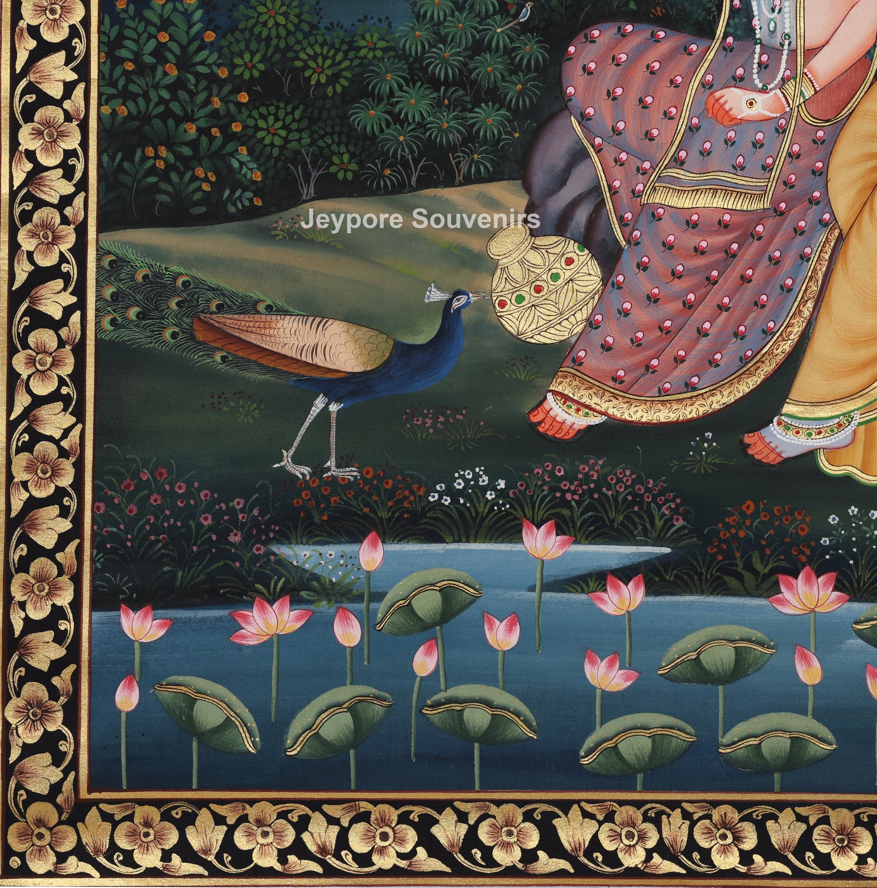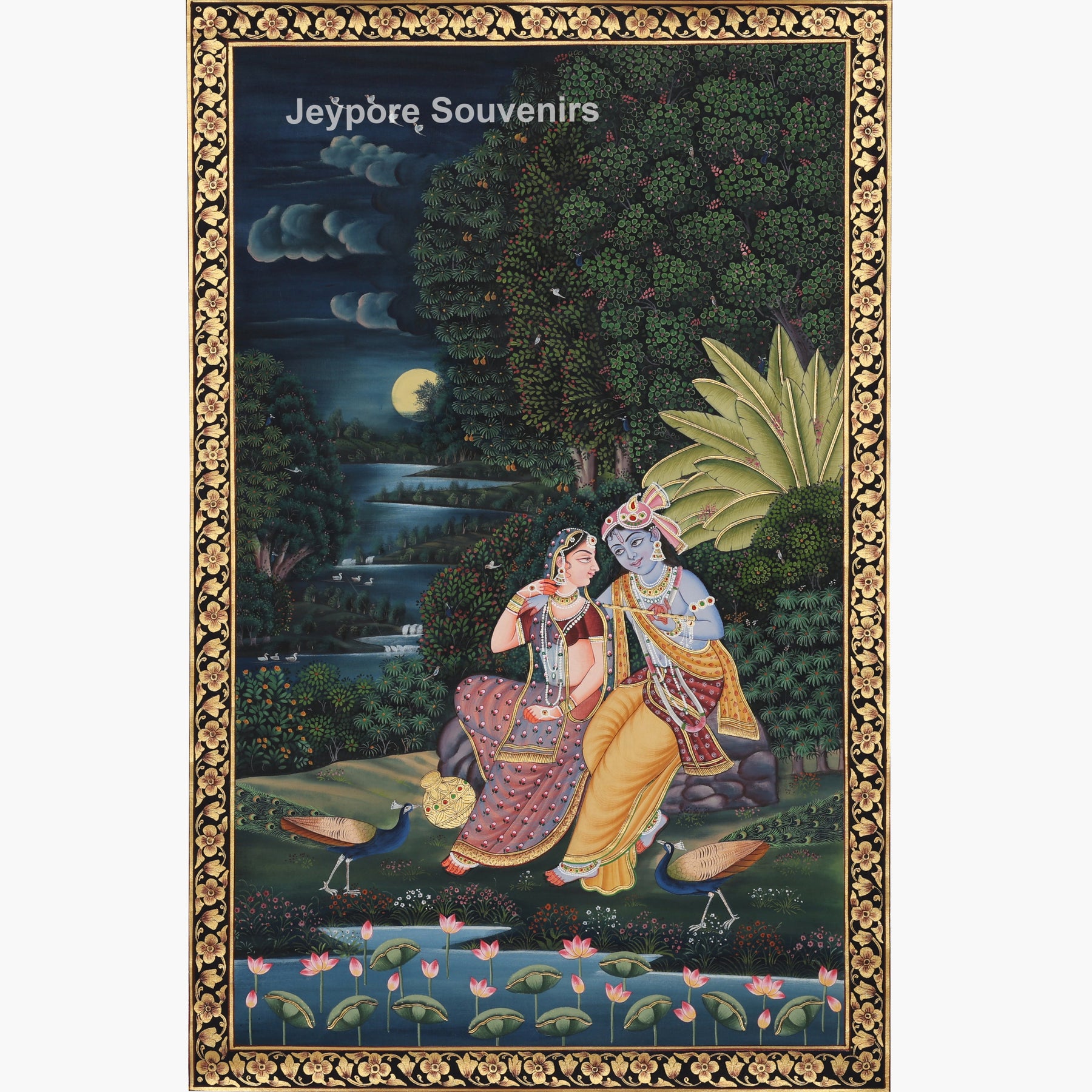 The setting is a magical evening landscape, featuring seated radha krishna a cascading waterfall, a dense forest canopy, and a lotus pond in the foreground. The tranquil scene is completed by two majestic peacocks a symbol frequently associated with Krishna's crown and beauty. This piece perfectly embodies spiritual harmony, deep affection, and the unparalleled artistic heritage of the Rajput courts.