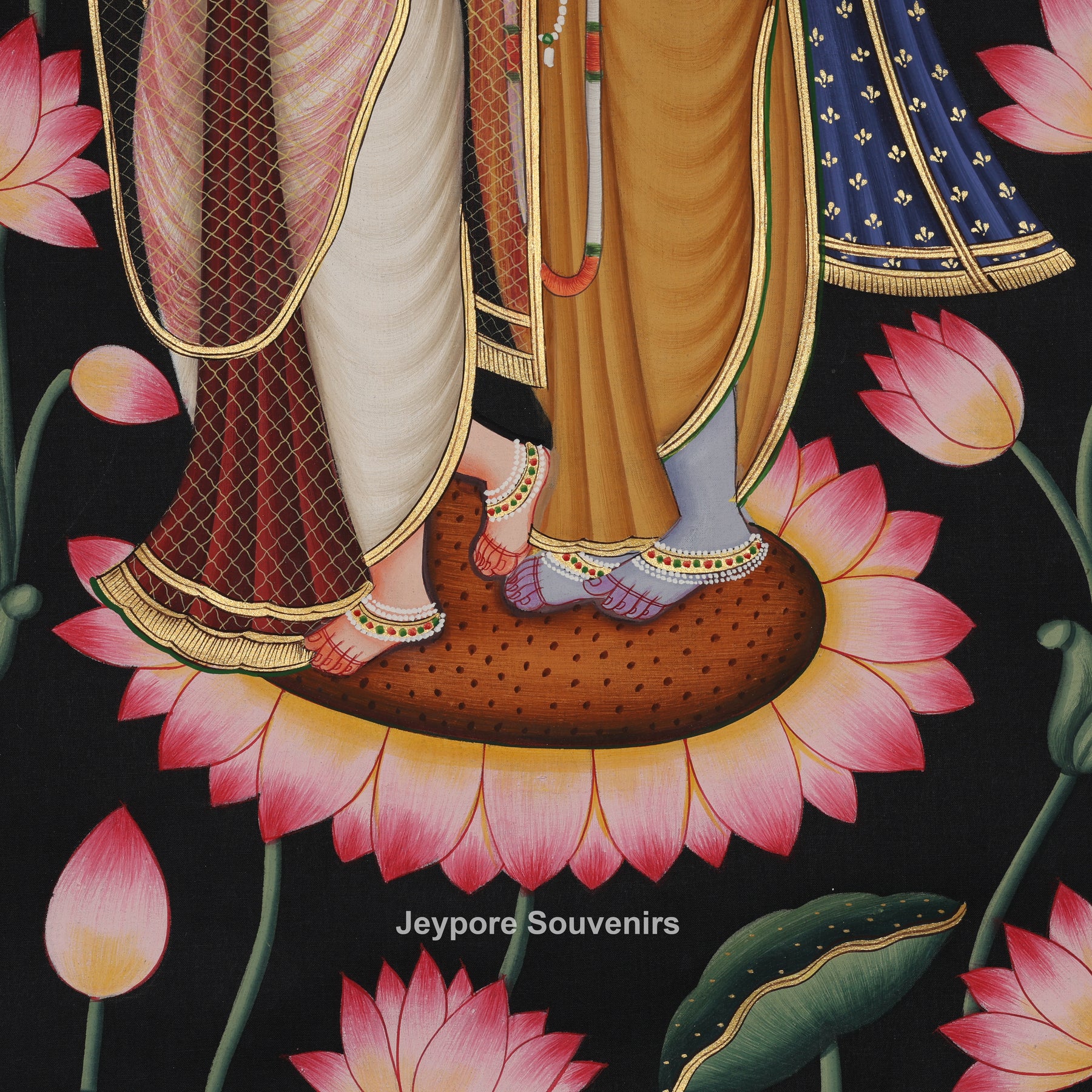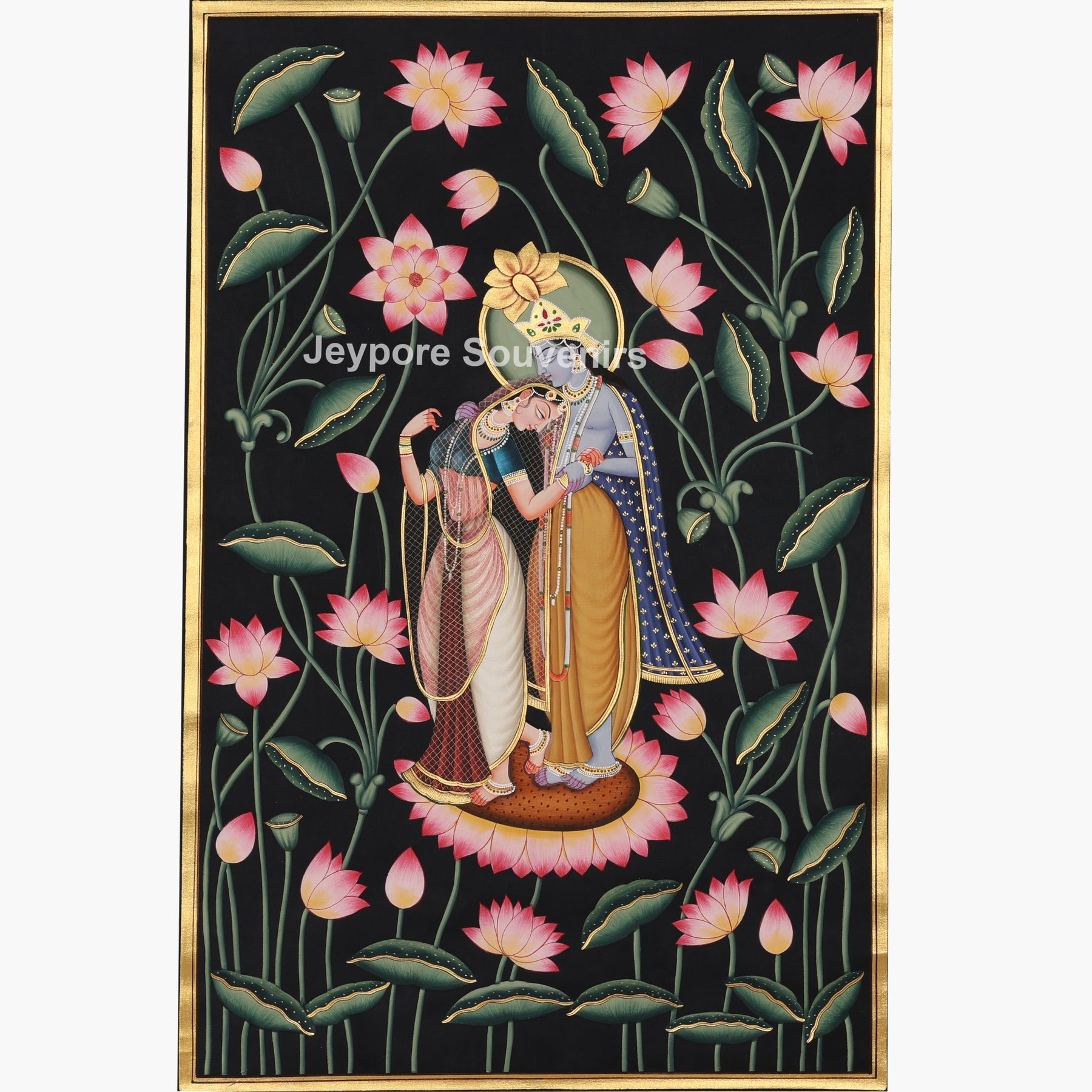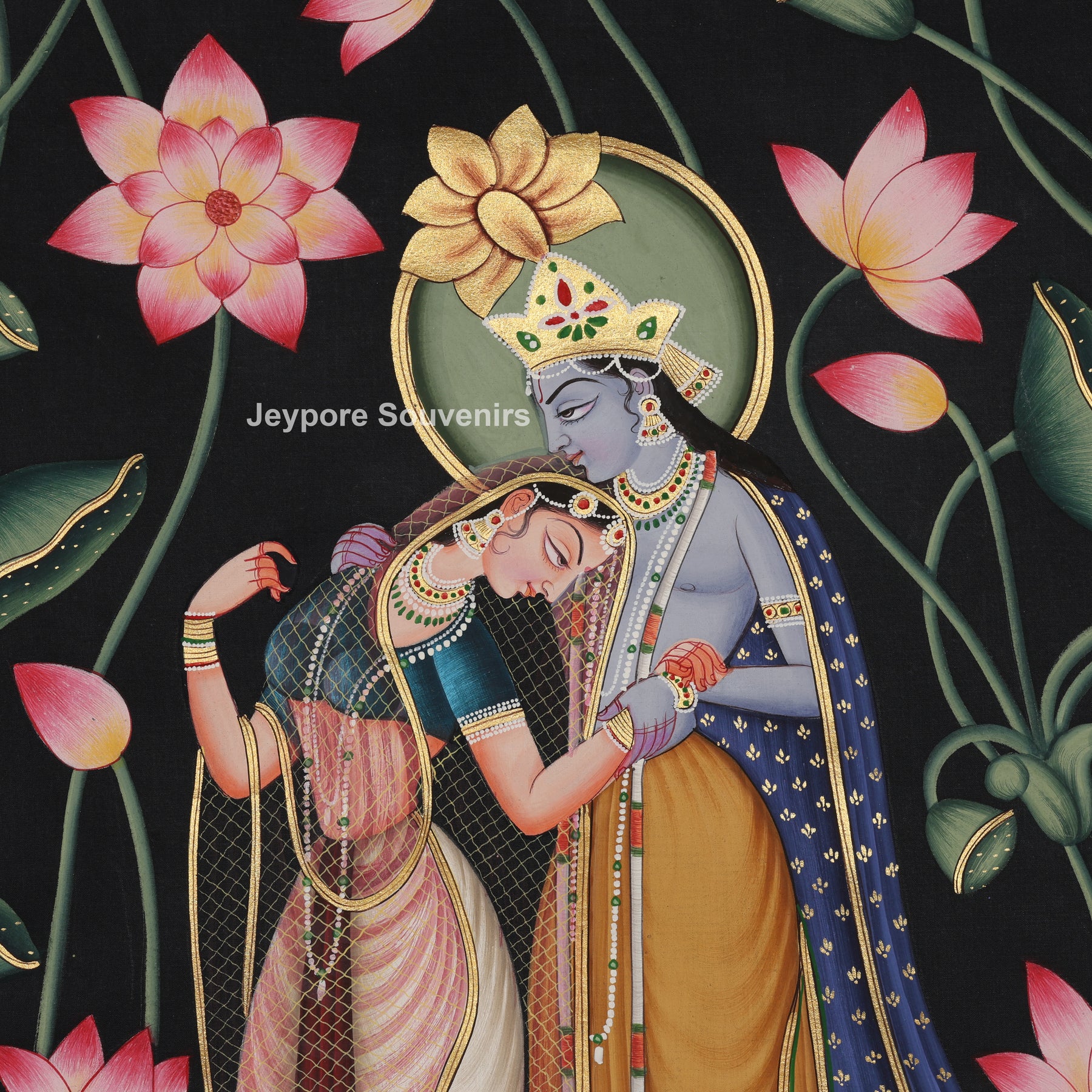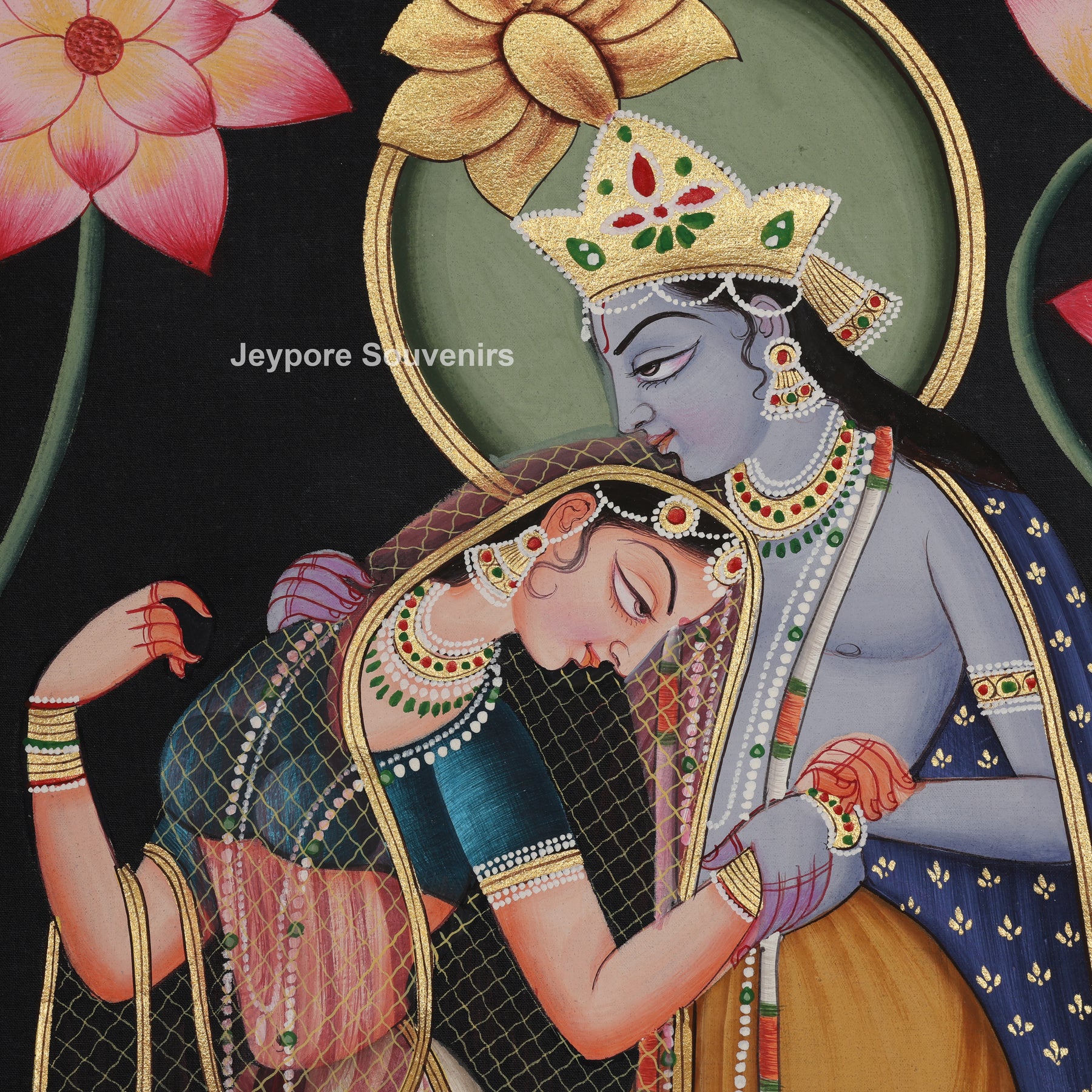 The artwork captures a timeless moment of divine love and harmony, surrounded by blooming lotuses symbolizing purity and devotion.