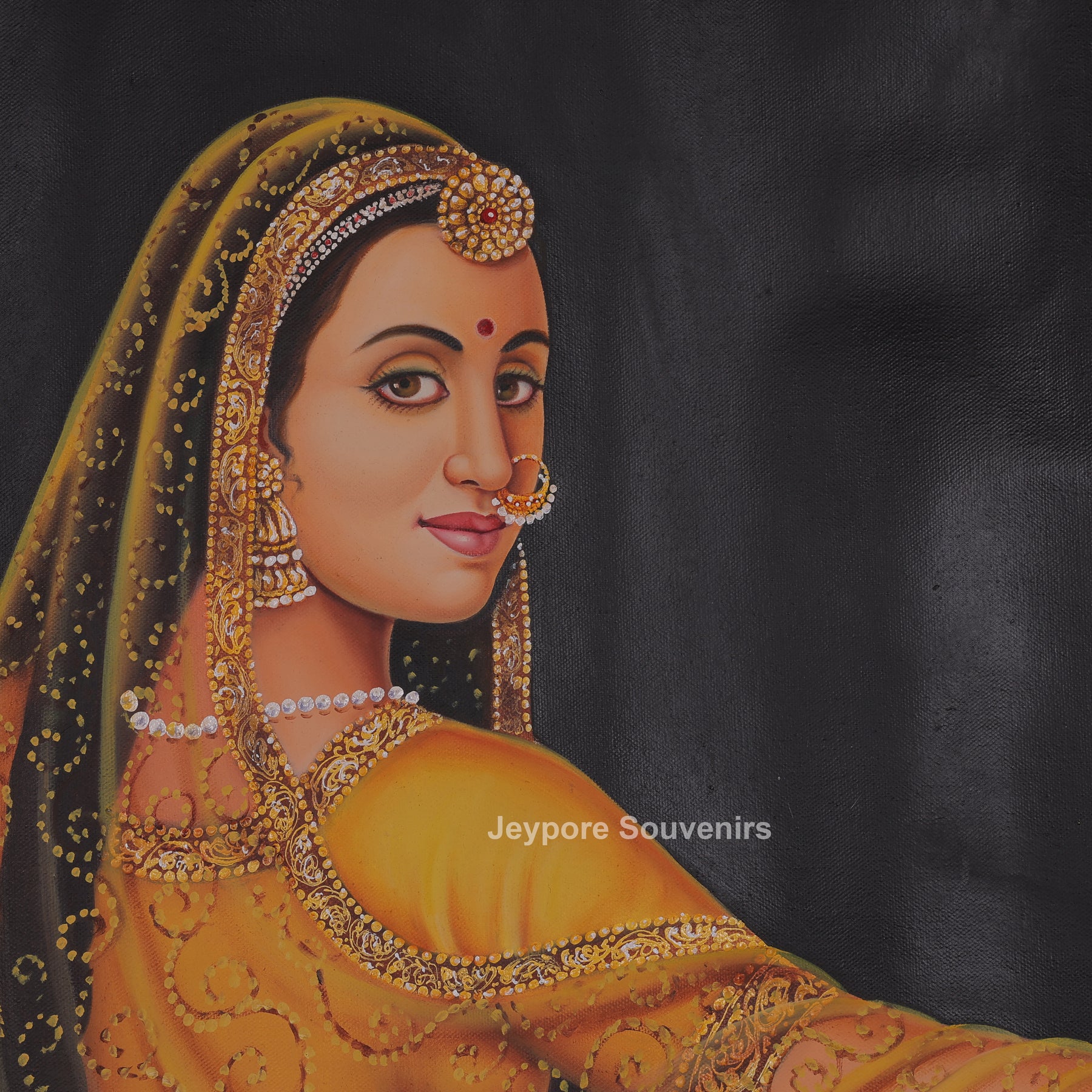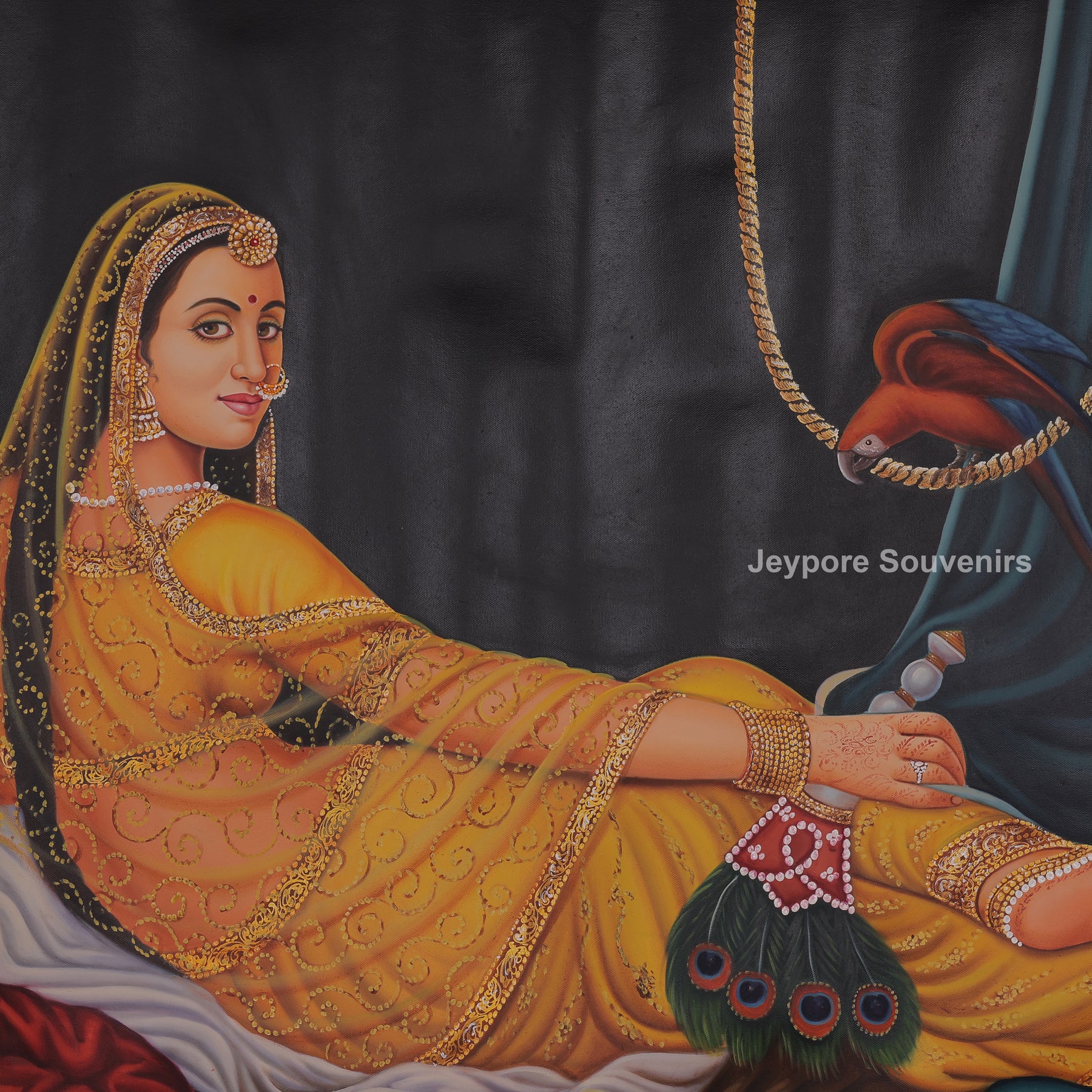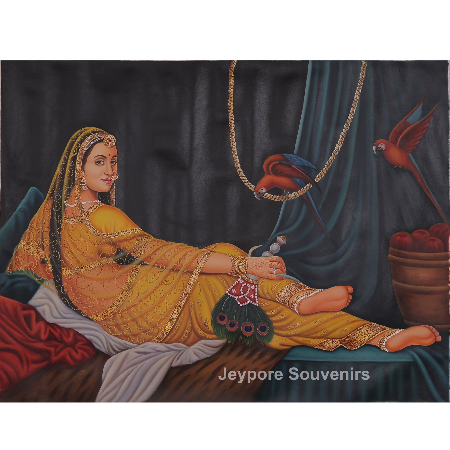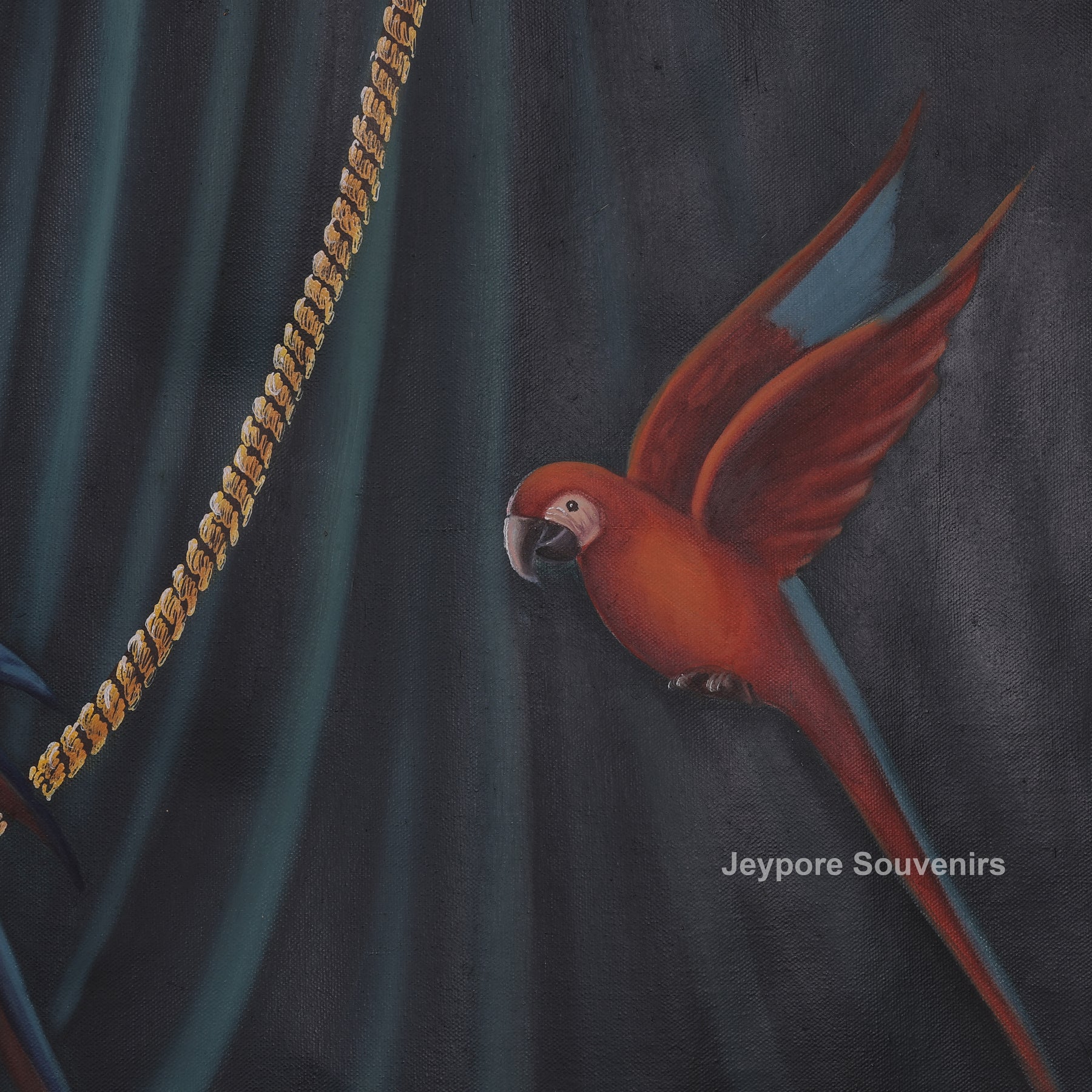 This canvas painting presents a serene royal scene featuring a rani seated in a calm natural setting, holding a delicate hand pouch while colorful parrots add life to the moment. The figure is dressed in finely detailed traditional attire, highlighted with soft folds, rich colors, and gentle facial expressions. Surrounding elements like flowing drapes, greenery, and birds create a peaceful and balanced composition. The painting is hand-created on canvas using fine brushes and layered colors, allowing smooth textures and depth throughout the scene. Careful attention is given to jewelry, fabric patterns, and natural details, reflecting skilled. The painting approach focuses on elegance, harmony, and royal leisure, making this piece ideal for enhancing living spaces, bedrooms, or heritage-style interiors with a refined and timeless visual appeal.