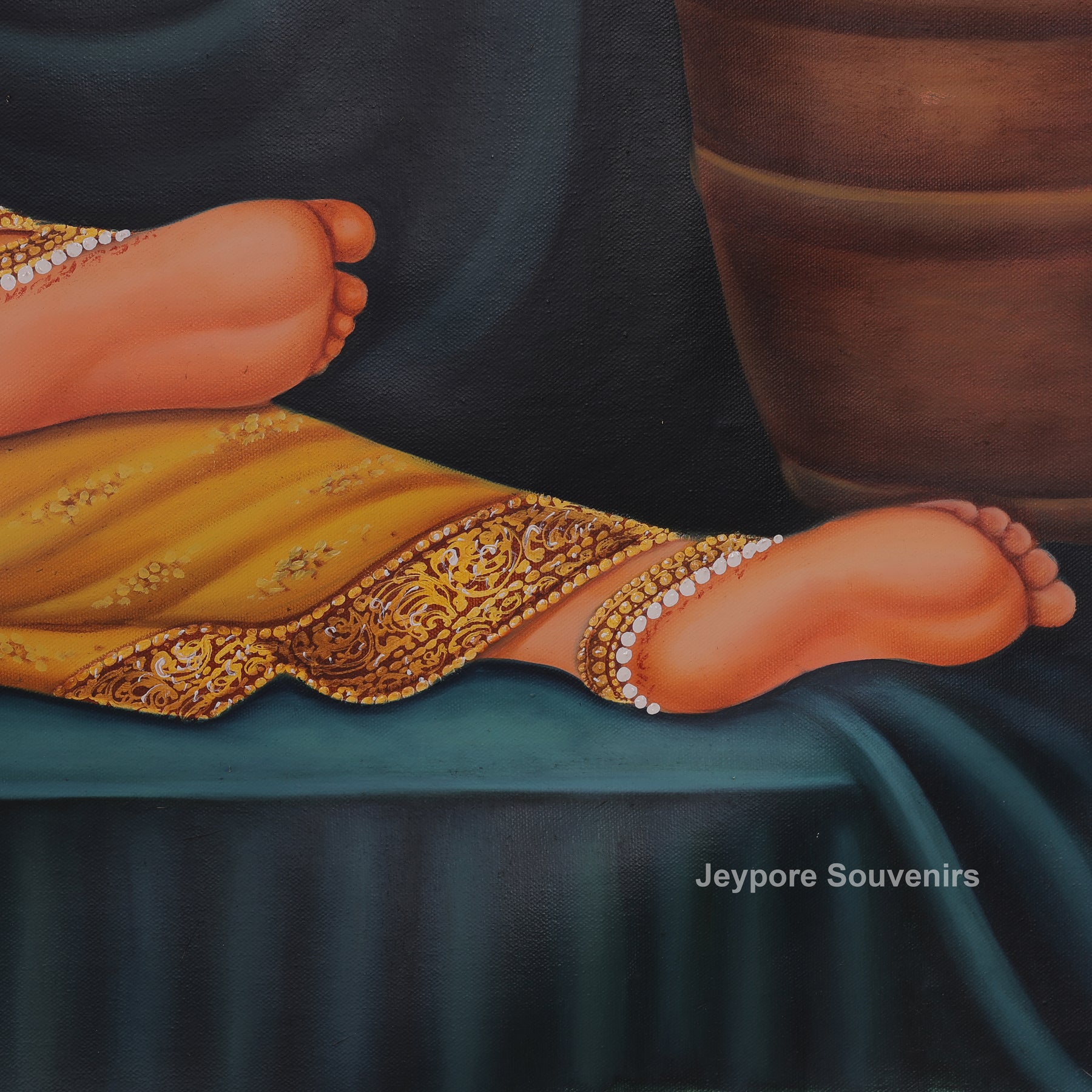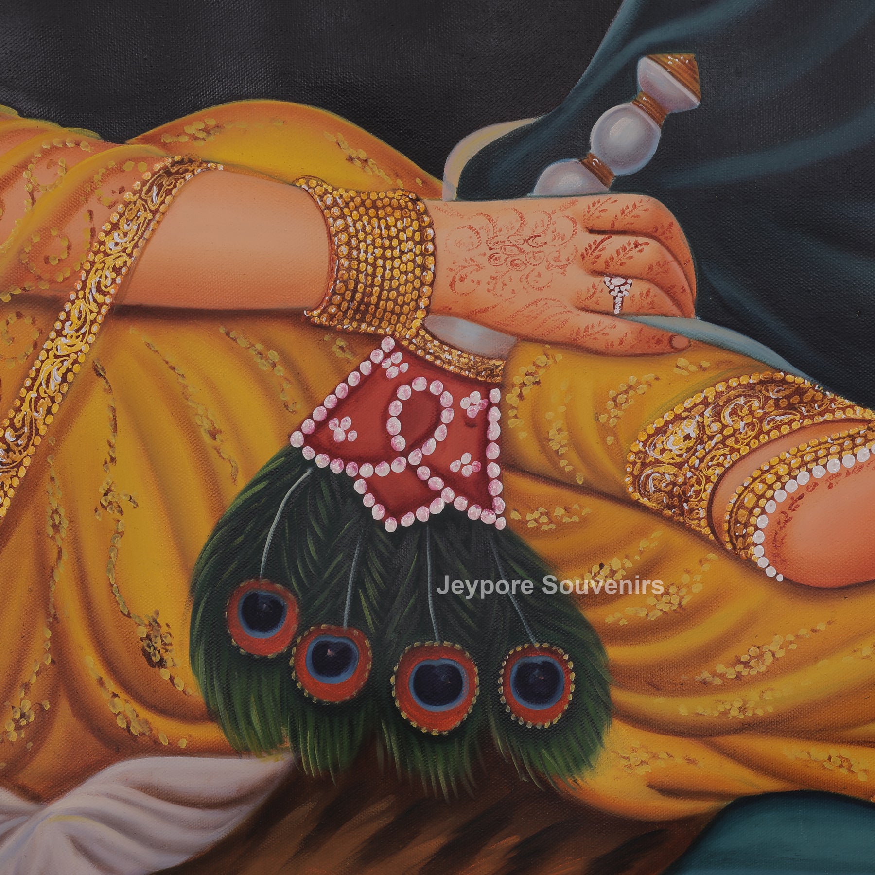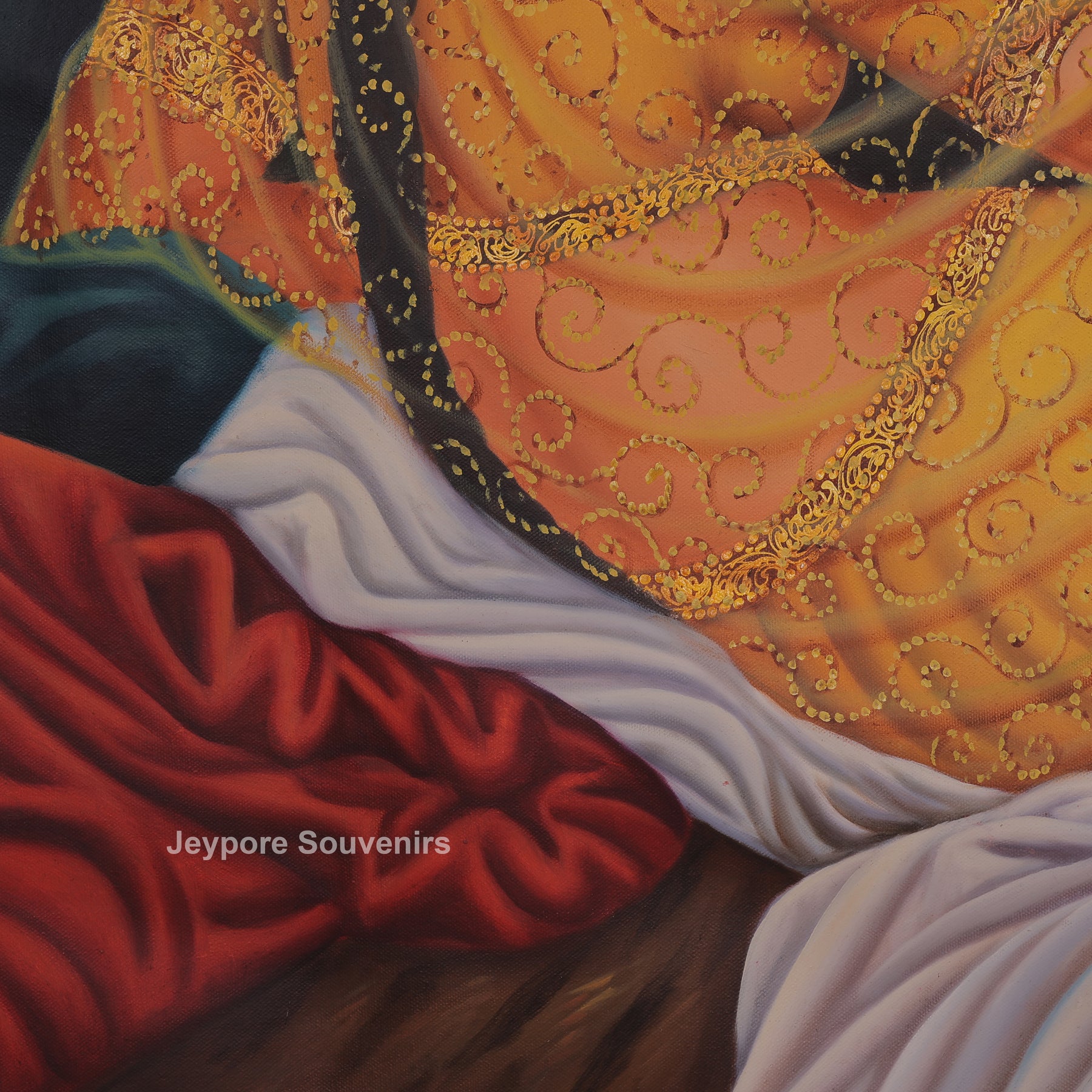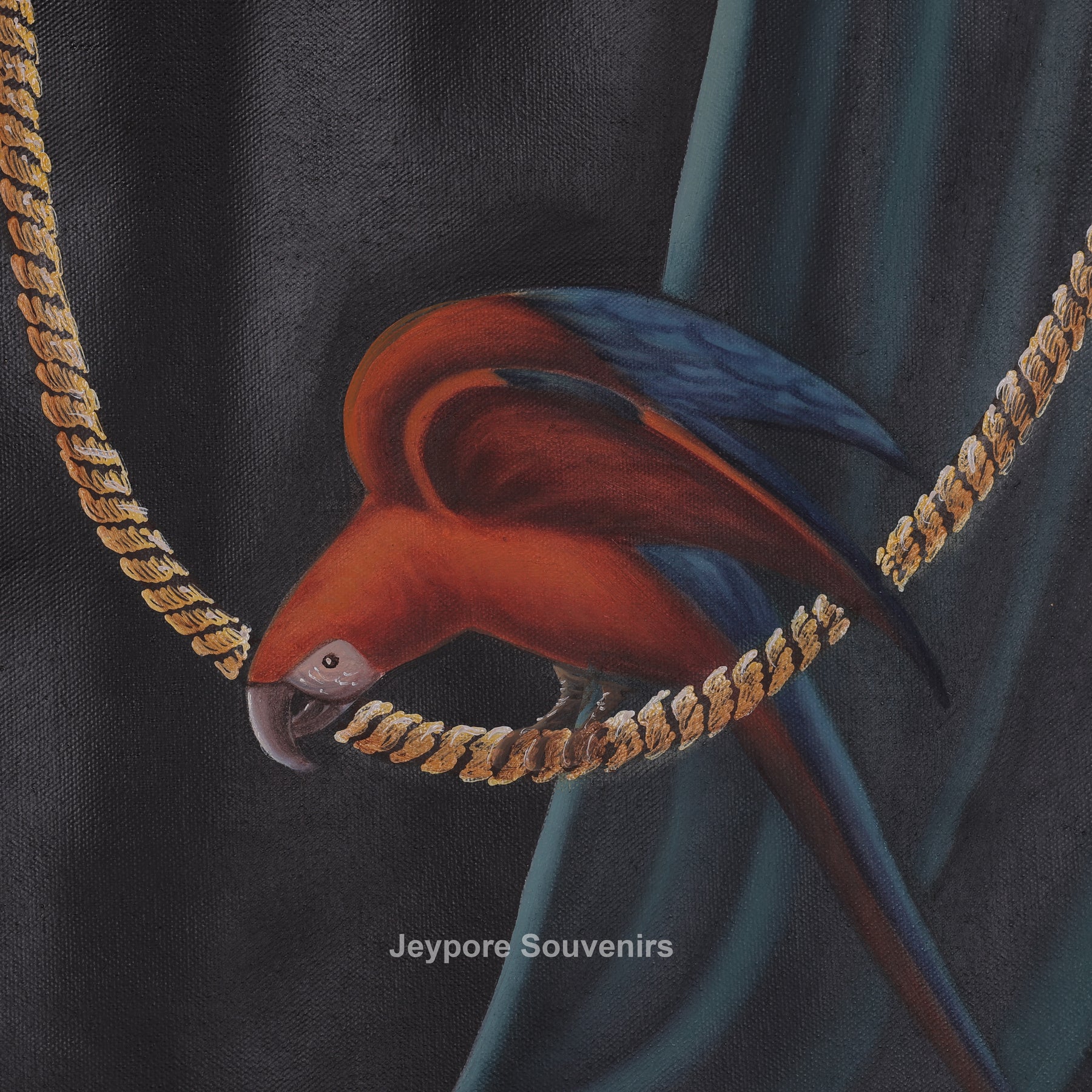 This canvas painting presents a serene royal scene featuring a rani seated in a calm natural setting, holding a delicate hand pouch while colorful parrots add life to the moment. The figure is dressed in finely detailed traditional attire, highlighted with soft folds, rich colors, and gentle facial expressions. Surrounding elements like flowing drapes, greenery, and birds create a peaceful and balanced composition. The painting is hand-created on canvas using fine brushes and layered colors, allowing smooth textures and depth throughout the scene. Careful attention is given to jewelry, fabric patterns, and natural details, reflecting skilled. The painting approach focuses on elegance, harmony, and royal leisure, making this piece ideal for enhancing living spaces, bedrooms, or heritage-style interiors with a refined and timeless visual appeal.