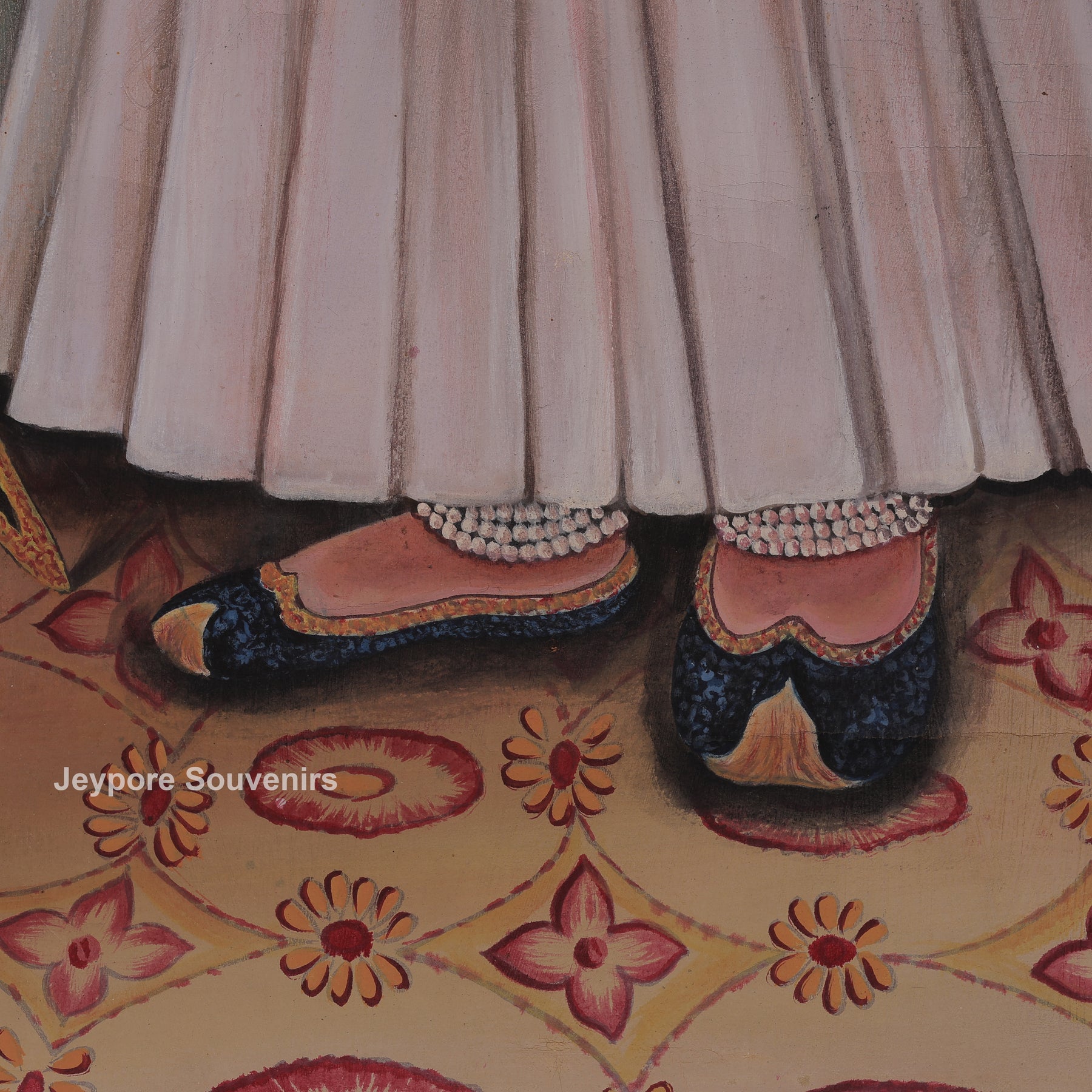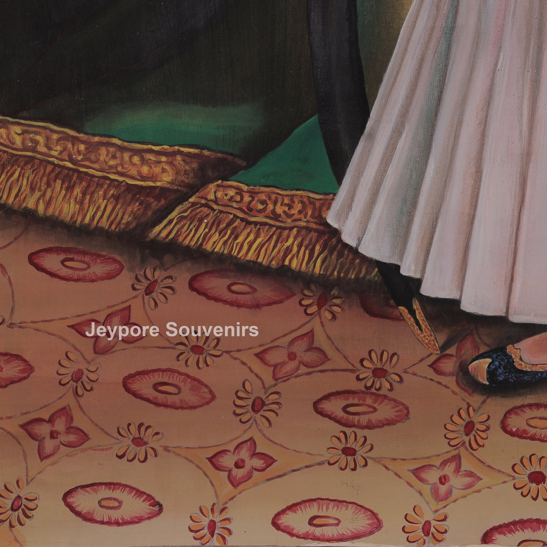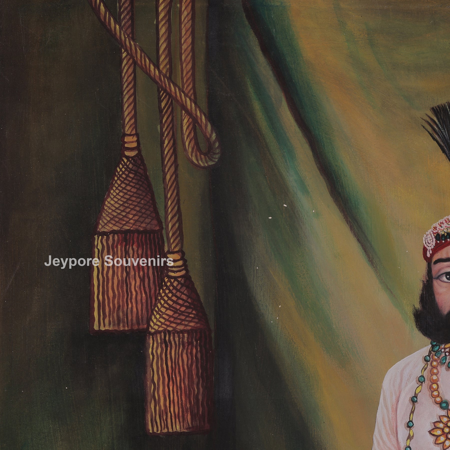 This canvas painting presents a royal man standing calmly inside a decorated palace room. He is wearing traditional royal clothing, including a long white robe, a colorful waist belt, and rich jewelry around his neck and head. A tall feather is placed on his headgear, adding to his royal look. The man holds a sword in one hand, showing courage and authority, while a round shield rests on his other arm for protection. His posture is strong and confident, as if he is guarding or representing his kingdom. The background has soft green curtains, hanging cords, and patterned flooring, which gives the scene a classic and historical feel. The painting reflects royal pride, strength, and elegance from a traditional era.