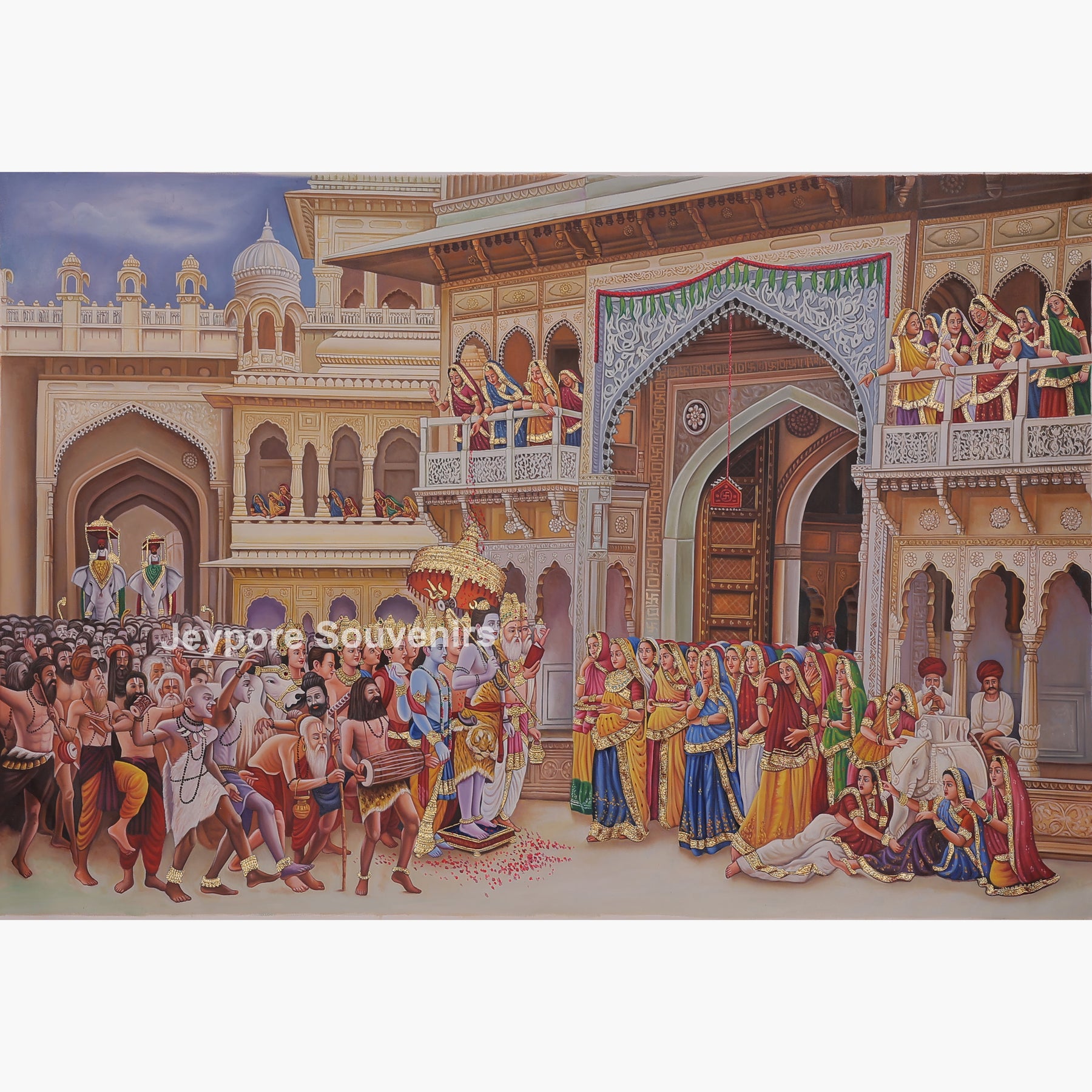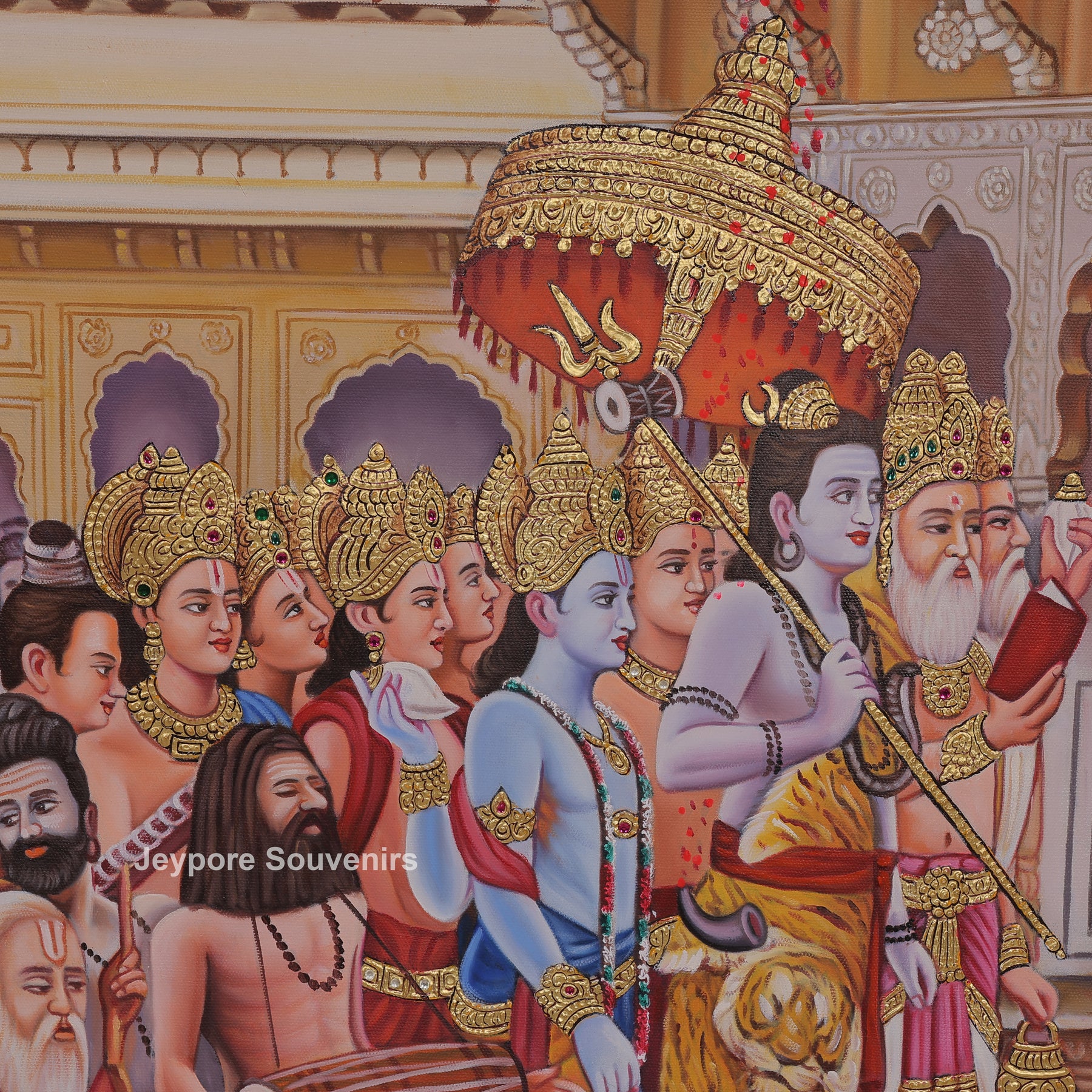 This handmade canvas painting beautifully portrays the divine wedding of Lord Shiva and Goddess Parvati in a ceremonial toran-style composition. The scene captures the sacred moment of their union, surrounded by celestial beings, sages, and joyful attendants witnessing the holy ritual. Lord Shiva is shown in a calm and powerful form, while Goddess Parvati appears graceful and serene, symbolizing love, devotion, and balance. Traditional motifs, decorative arches, and detailed patterns enhance the festive atmosphere of the wedding celebration. Soft yet vibrant colors bring life to the figures and the surroundings, reflecting spiritual harmony and joy. This artwork represents the eternal bond of faith, devotion, and unity, making it a meaningful piece for spiritual spaces, homes, or art collections that appreciate traditional themes.