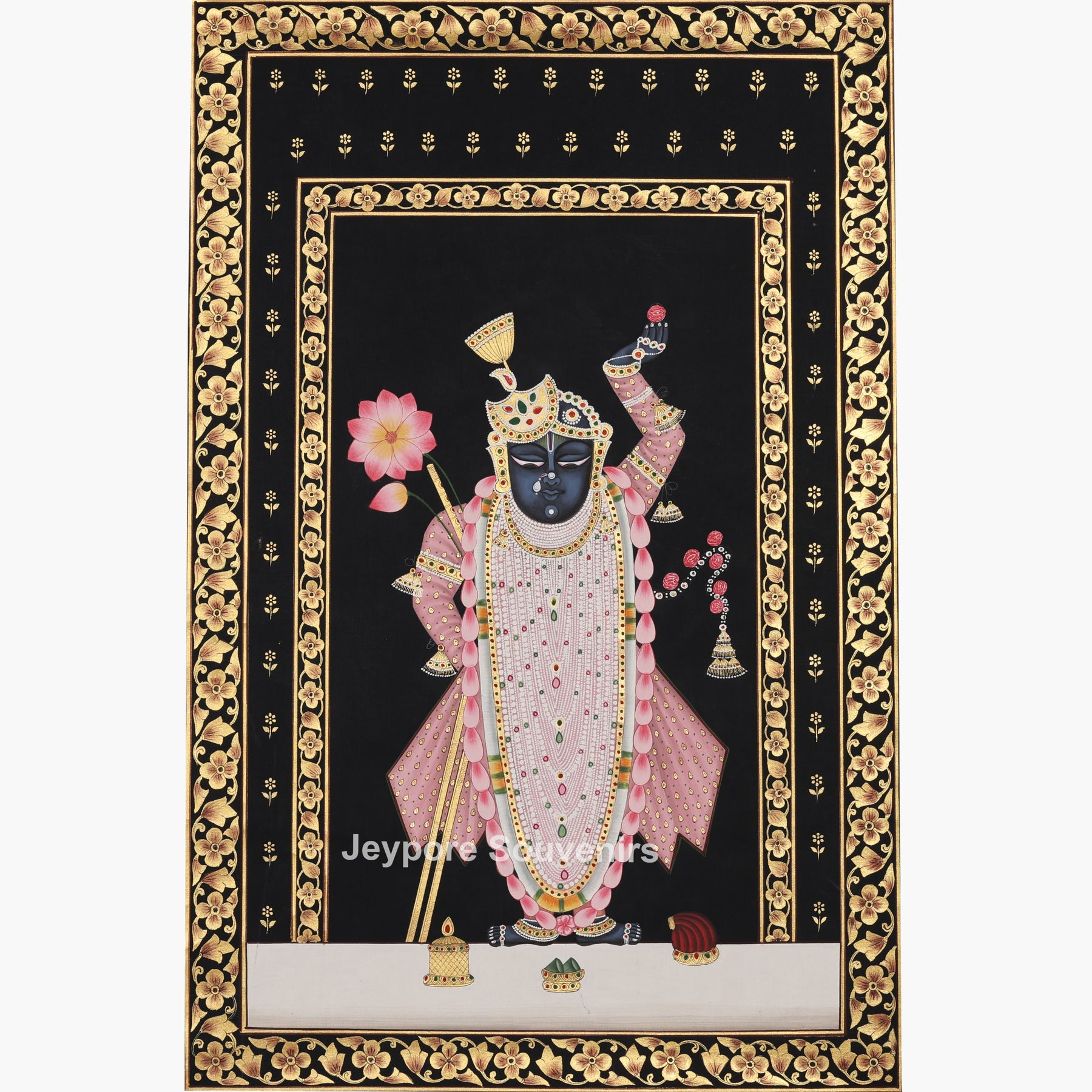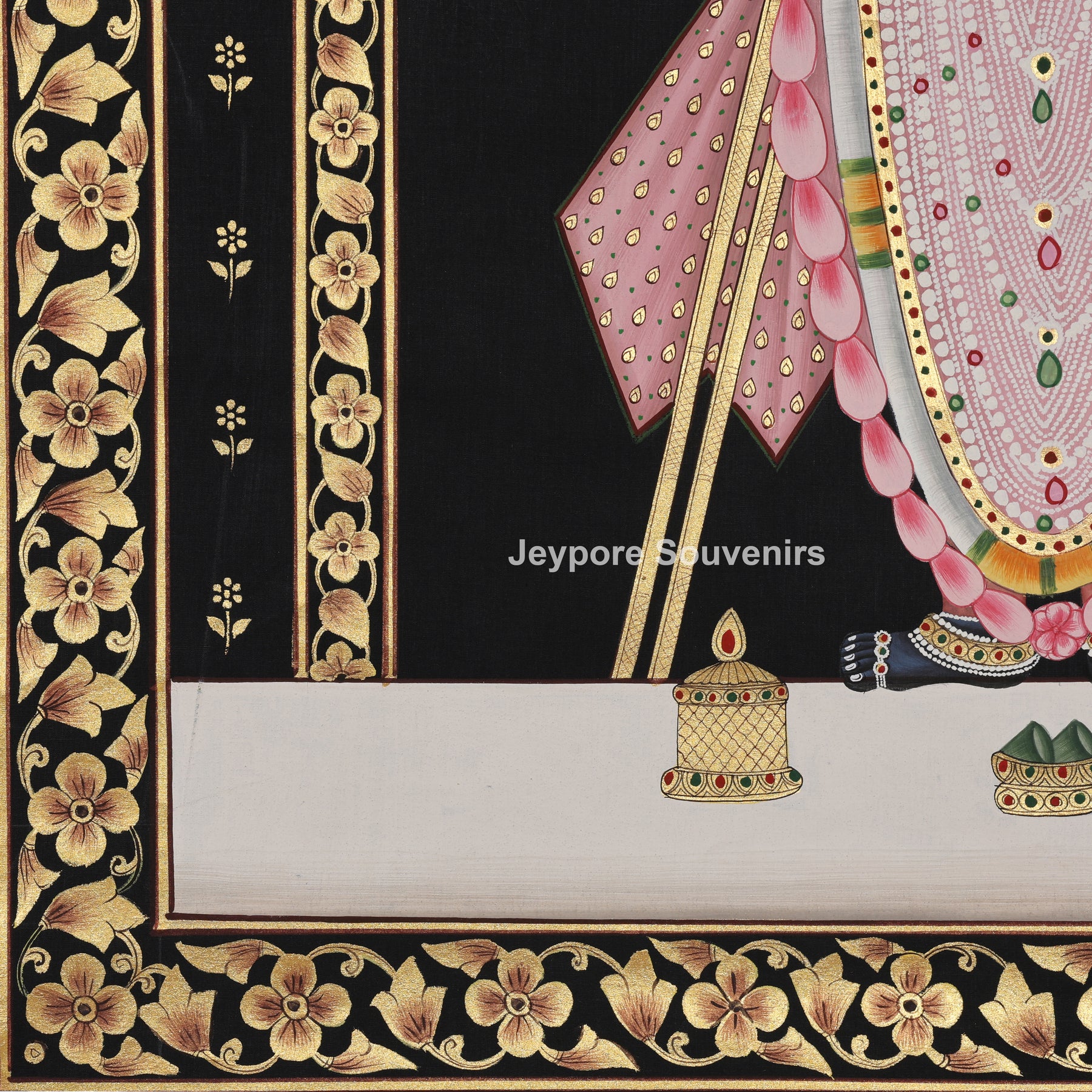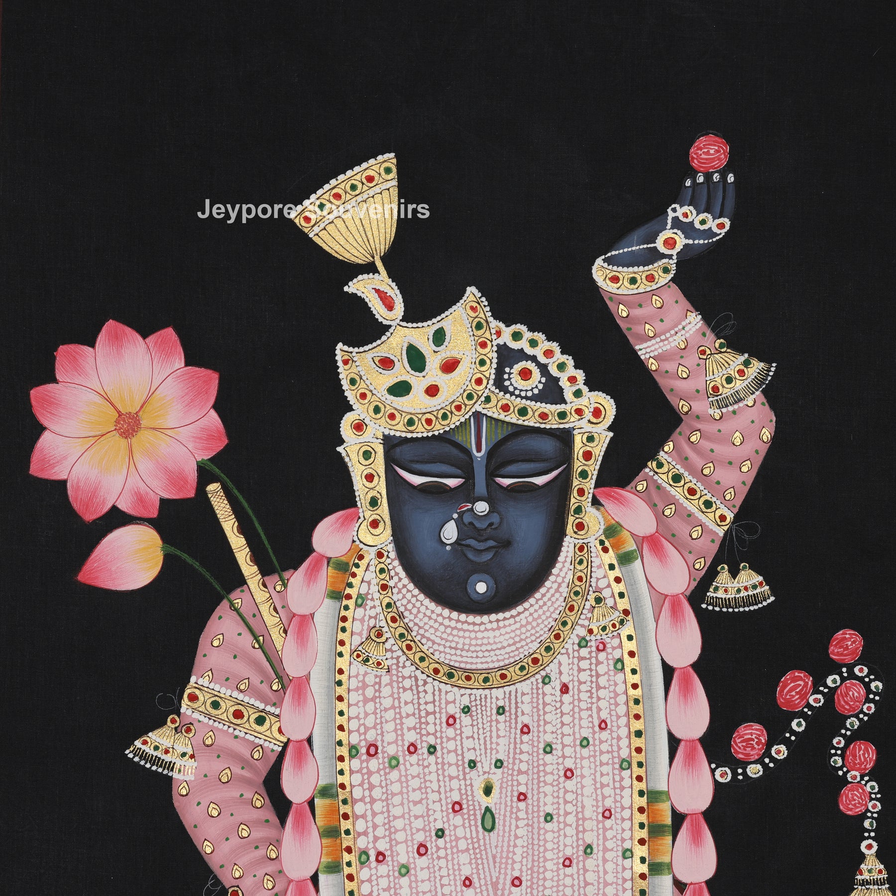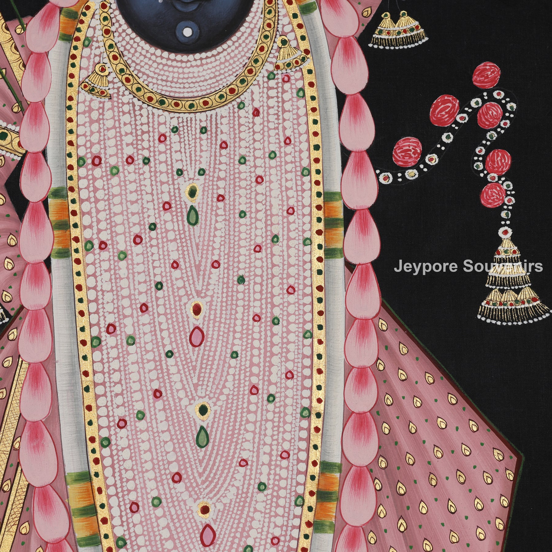 This refined Pichwai painting portrays Shrinathji, the divine child form of Lord Krishna, adorned in an elegant pink ceremonial attire, symbolizing grace, devotion, and festivity. Set against a deep black background, the painting features Shrinathji holding a lotus, with delicately rendered ornaments, pearl garlands, and sacred accessories that reflect the rich traditions of art.