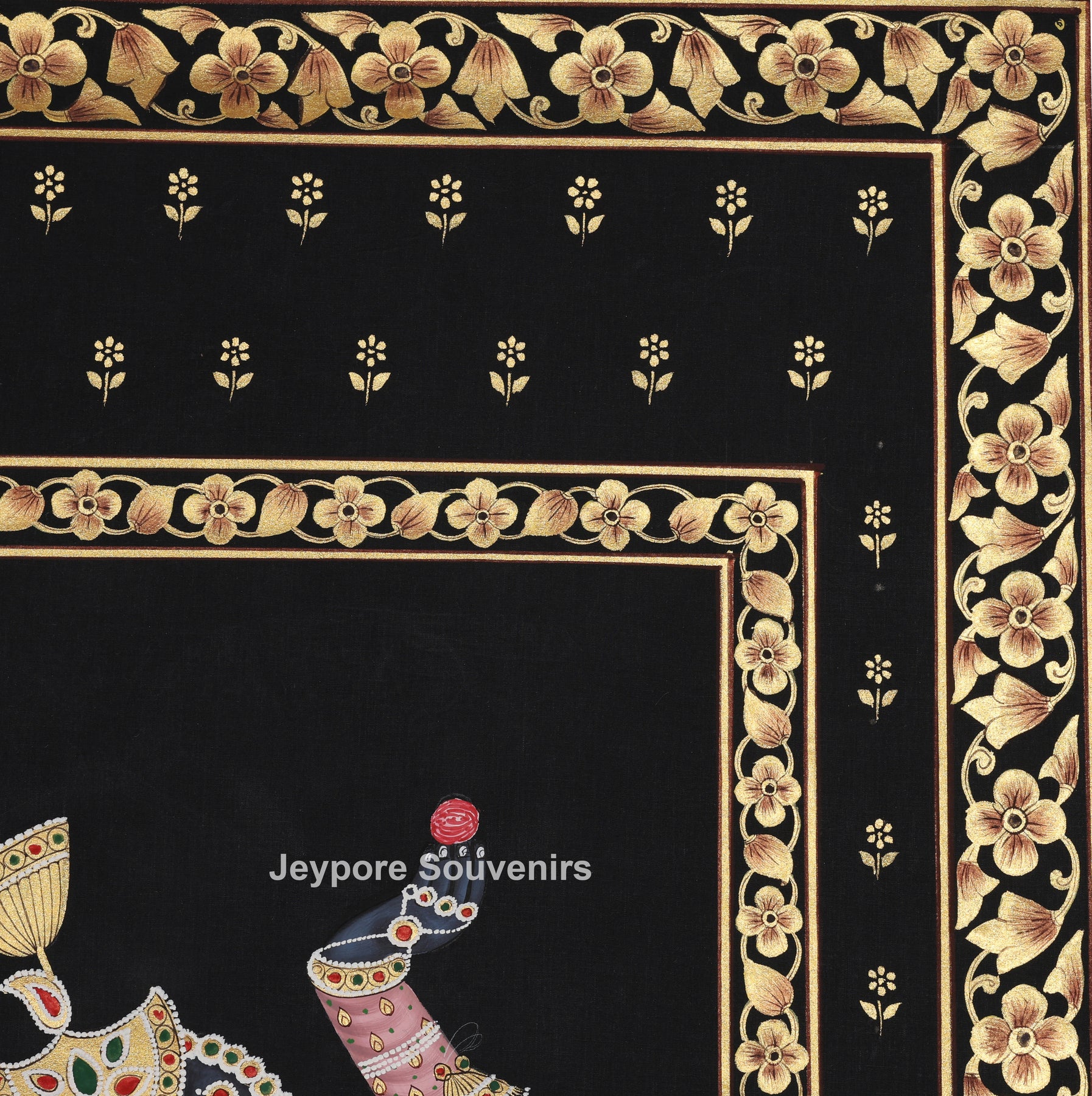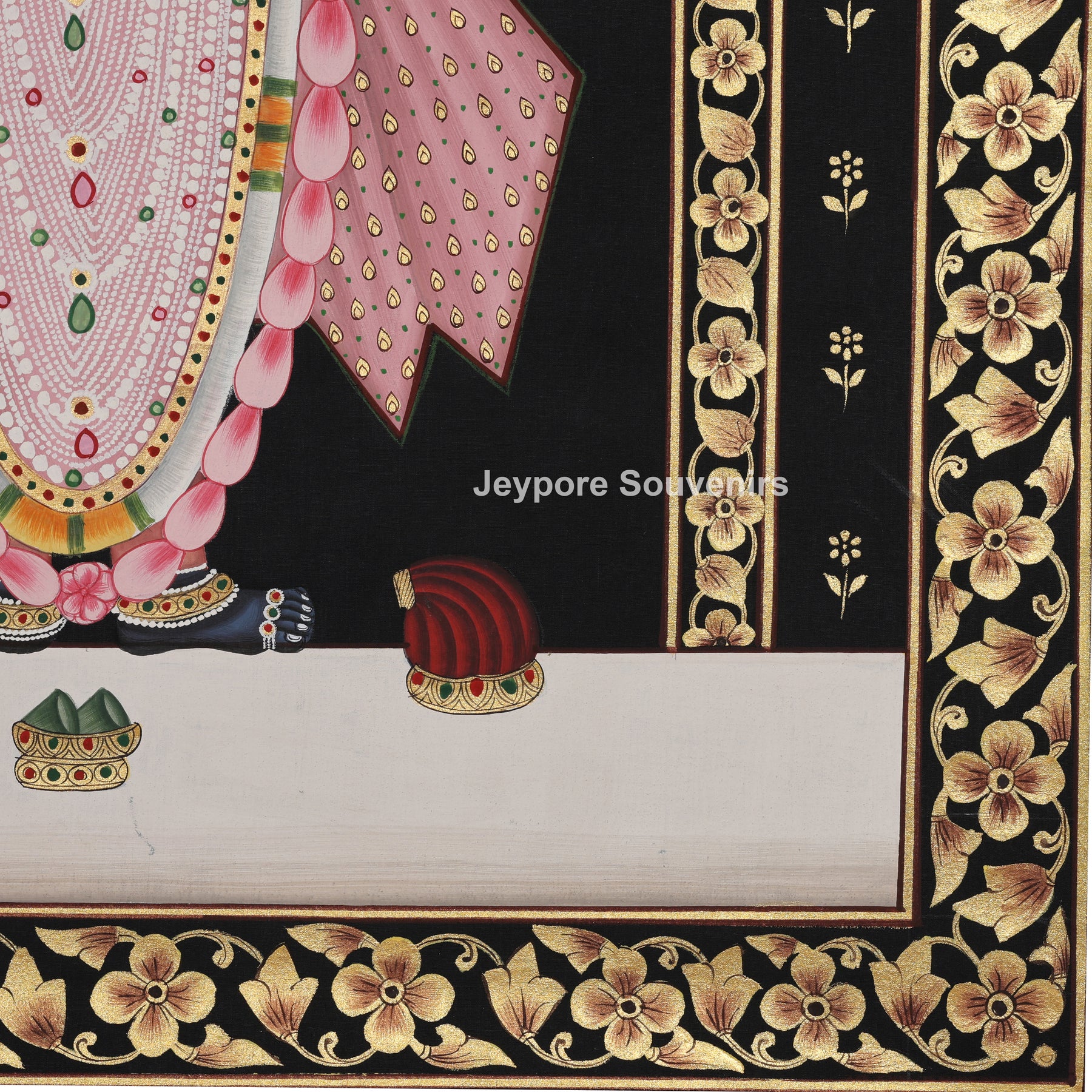The painting is enclosed within an intricately hand-painted floral border in gold tones, enhancing its royal and devotional presence. Every element—from the facial expression to the textile patterns—demonstrates exceptional craftsmanship, making this painting a timeless spiritual centerpiece for your space.