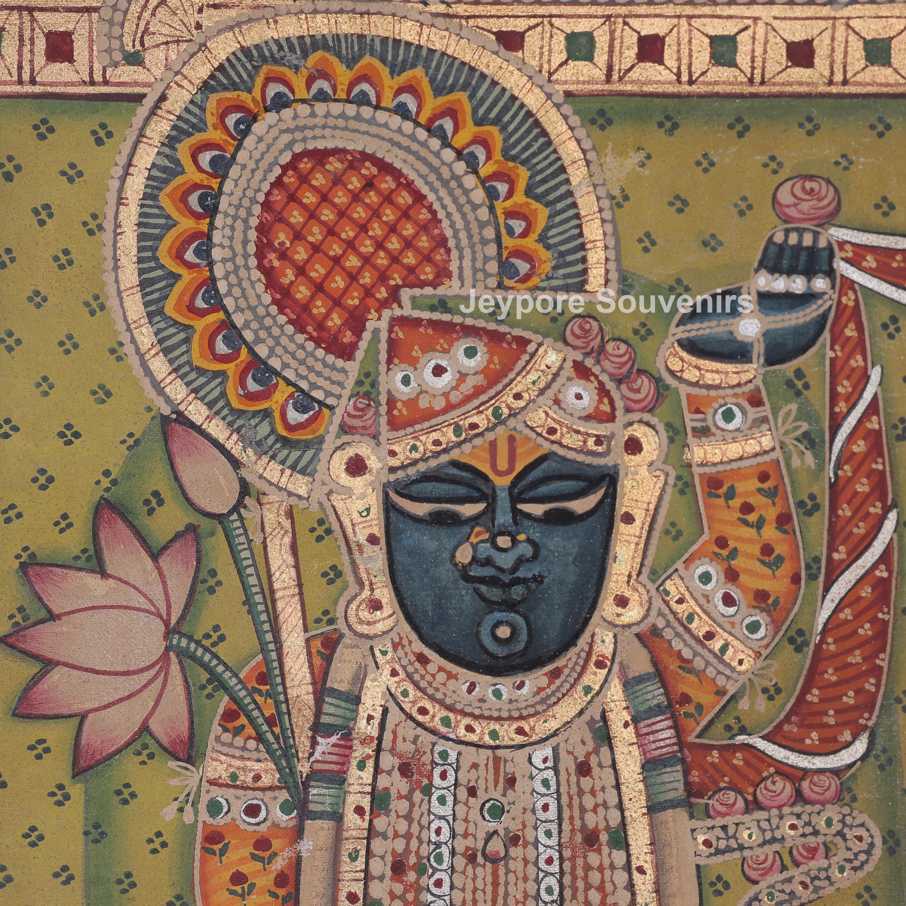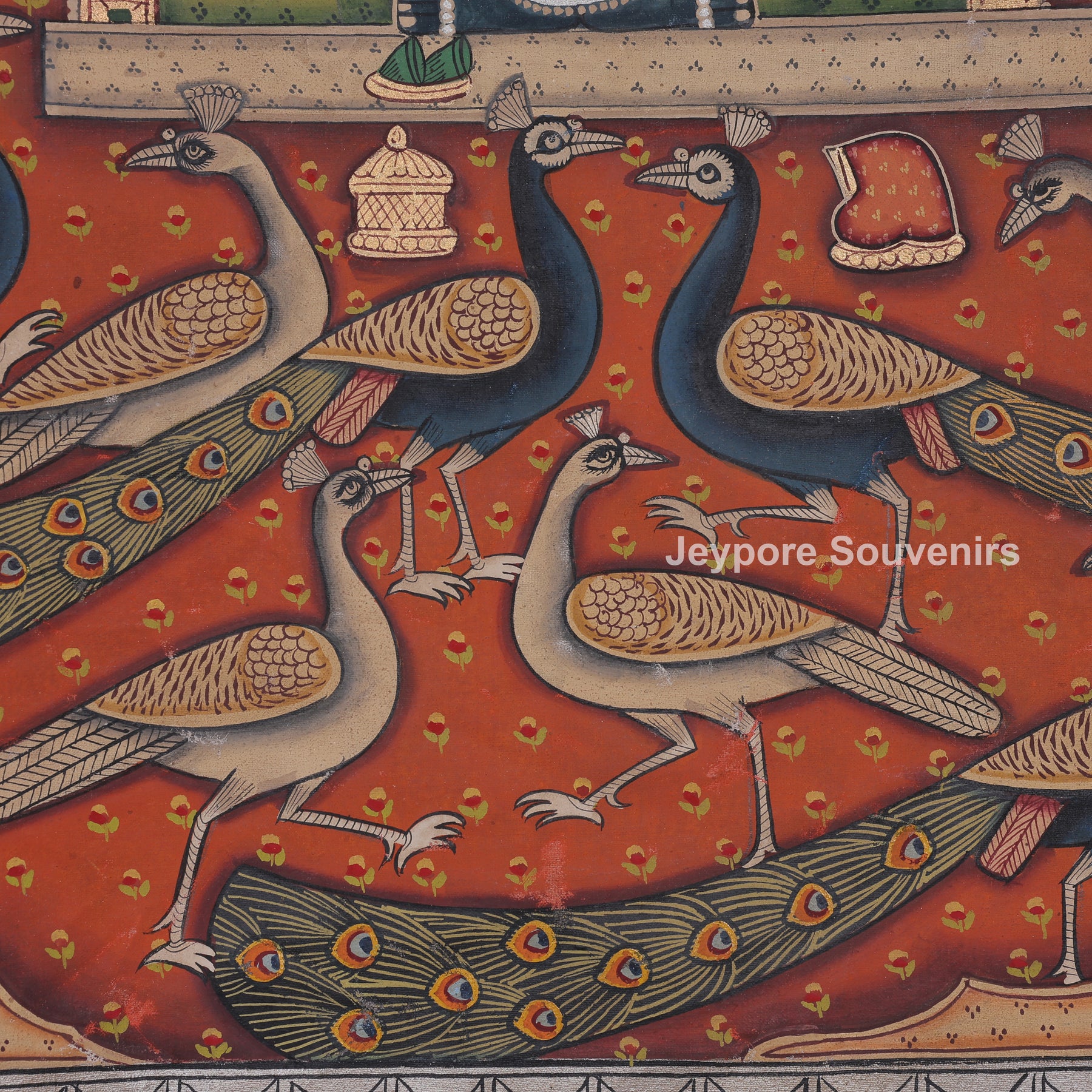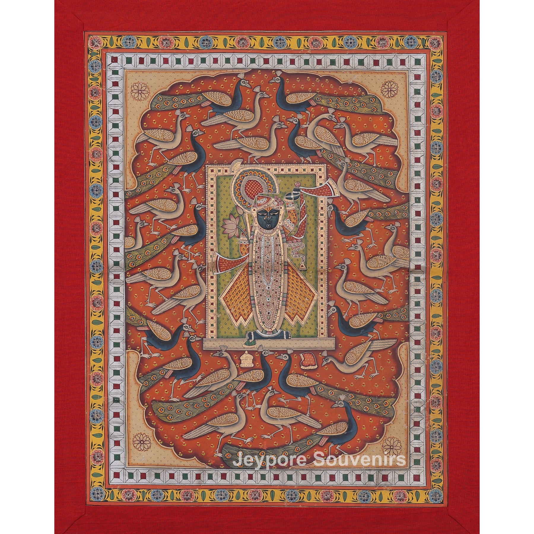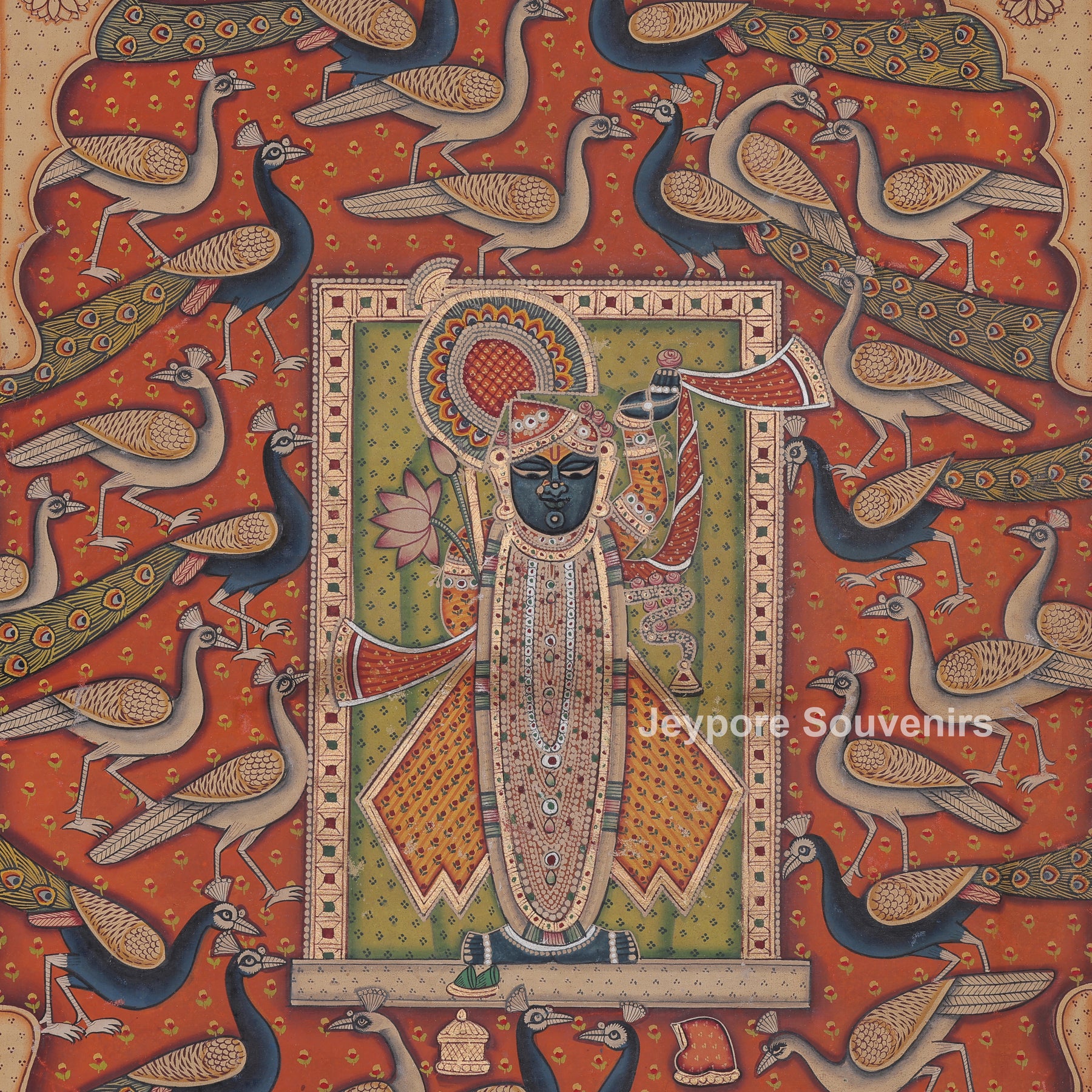 This pichwai painting depicts a meticulously detailed scene featuring a divine figure shrinathji serenely at the center. The figure is elaborately adorned in customary clothing, featuring stacked jewelry and positioning one hand elegantly. The demeanor is tranquil and serene, conveying a feeling of dedication and tranquility. Encircling the main figure are numerous peacocks, depicted in various stances as if they are gracefully dancing or moving softly around. The background is filled with their elongated feathers and graceful forms, establishing rhythm and harmony in the arrangement. The cozy backdrop hue is adorned with tiny designs that enhance depth and richness. Accentuating its classic appearance. The picture conveys harmony, beauty, dedication, and a celebration of nature via intricate hand-painted.