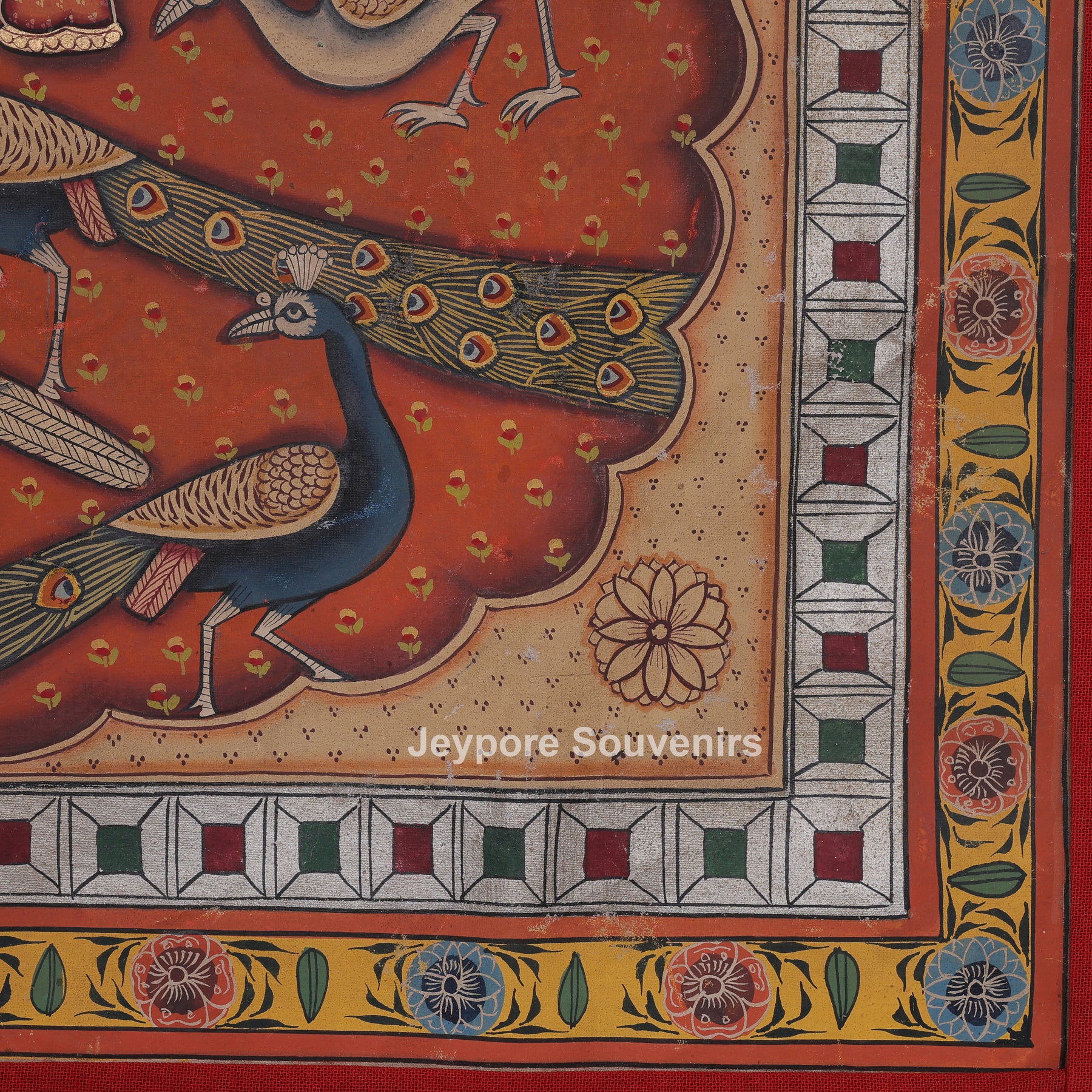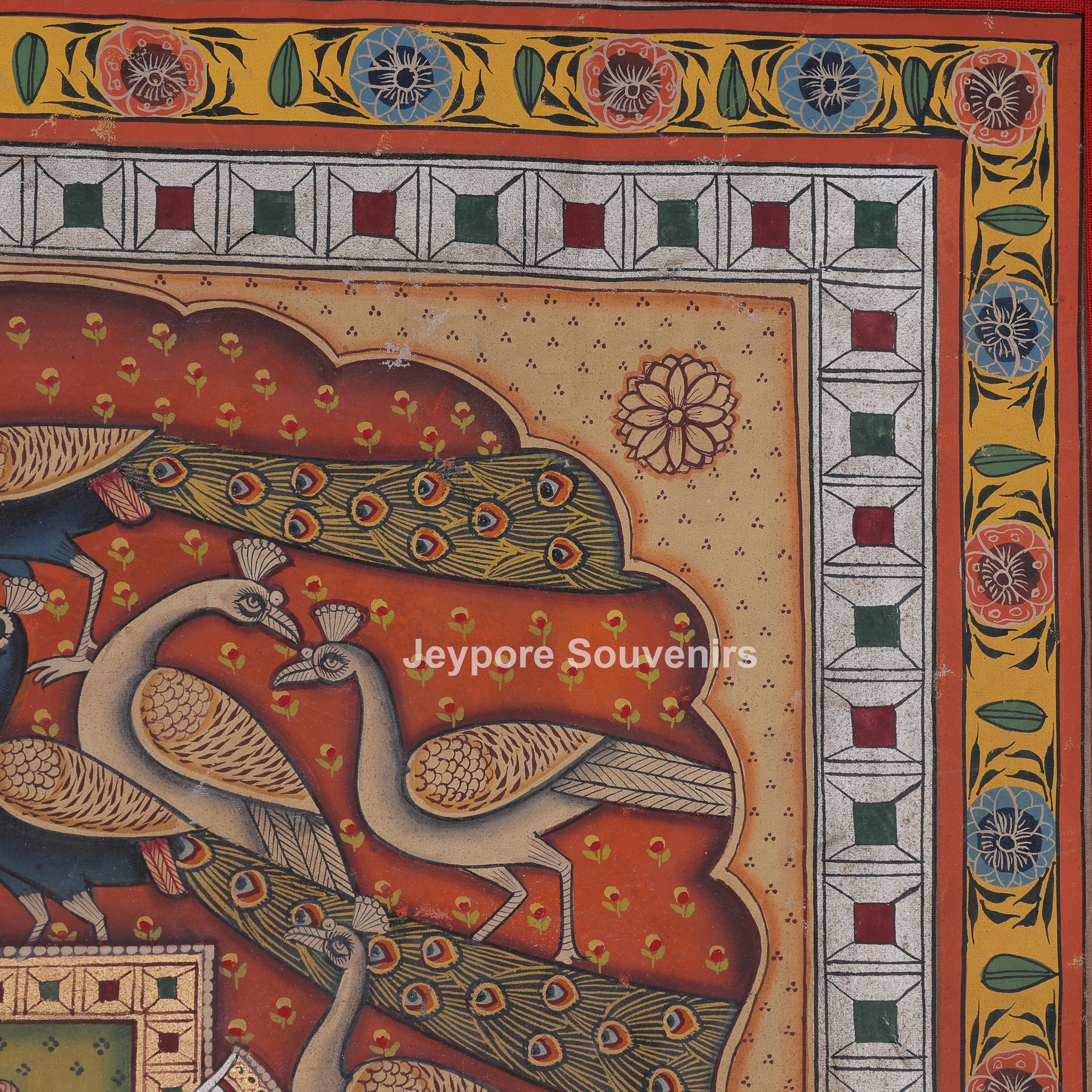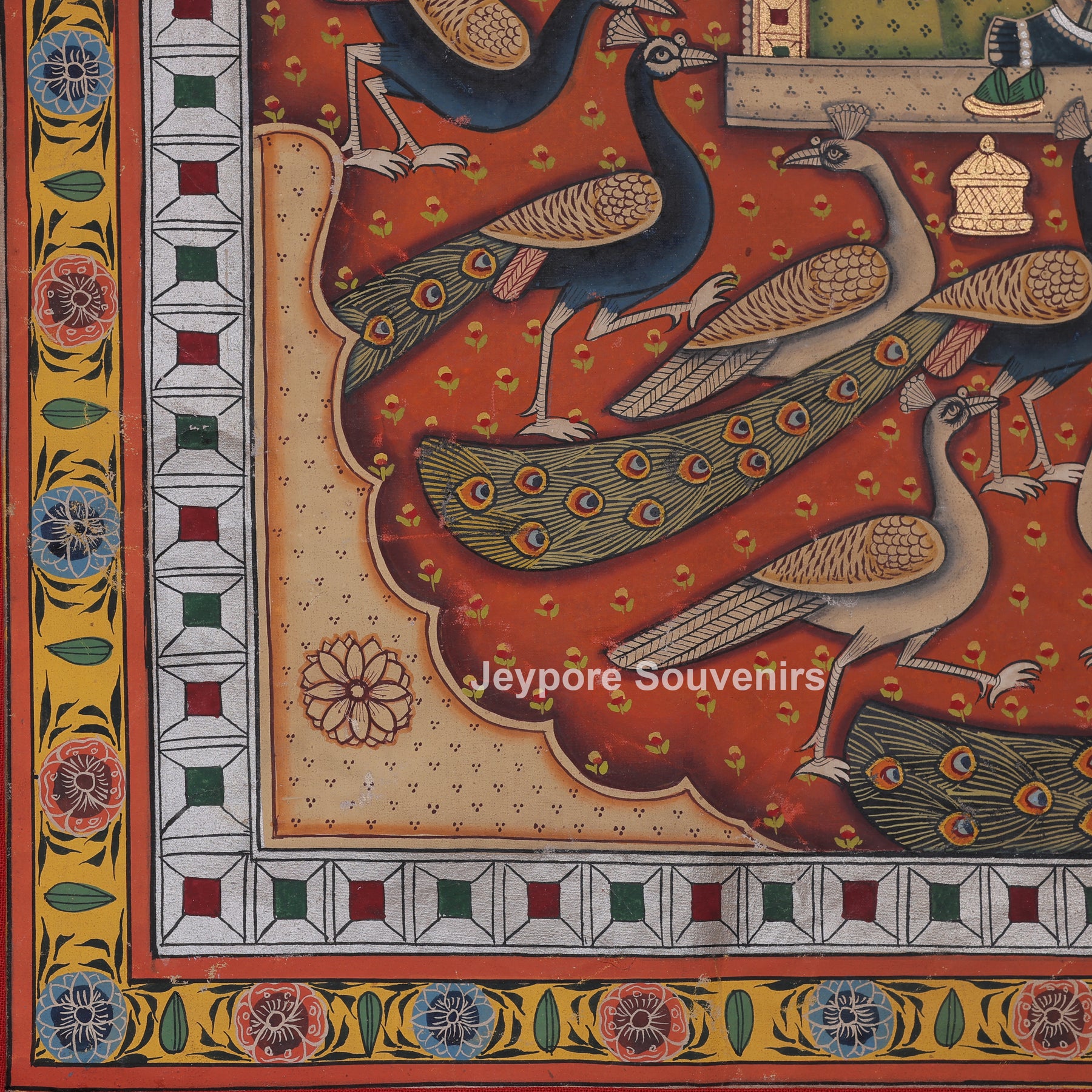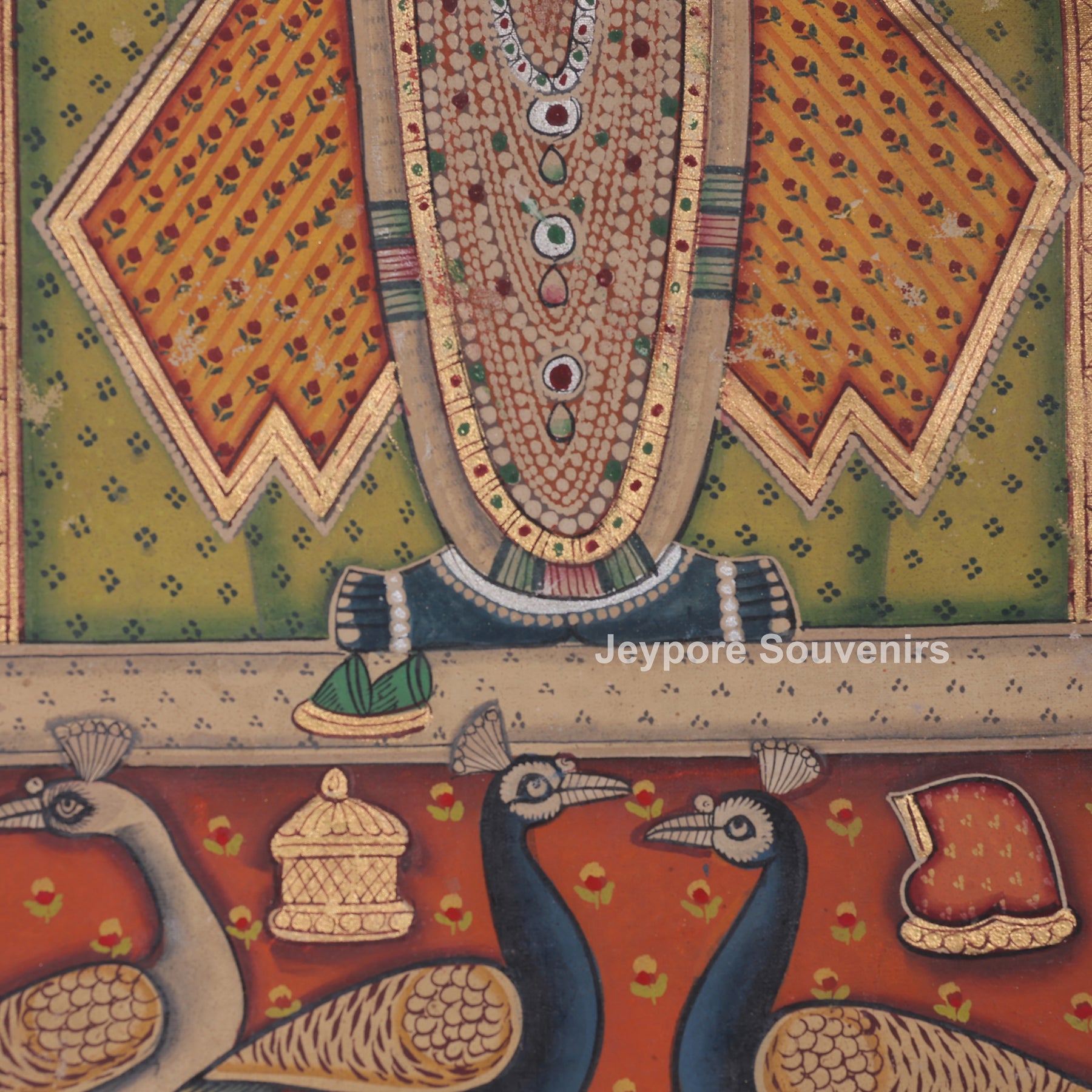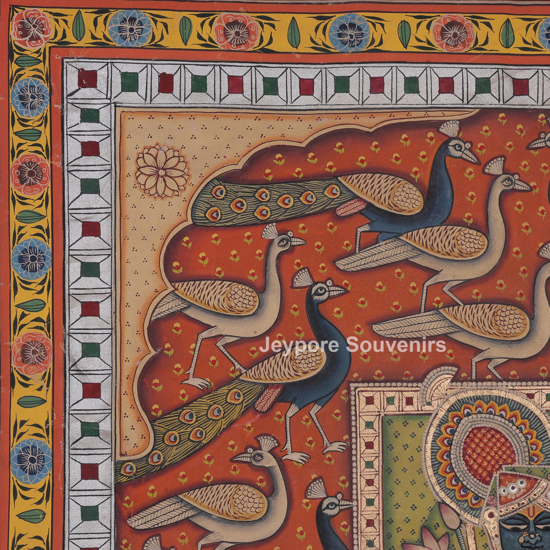 This pichwai painting depicts a meticulously detailed scene featuring a divine figure shrinathji serenely at the center. The figure is elaborately adorned in customary clothing, featuring stacked jewelry and positioning one hand elegantly. The demeanor is tranquil and serene, conveying a feeling of dedication and tranquility. Encircling the main figure are numerous peacocks, depicted in various stances as if they are gracefully dancing or moving softly around. The background is filled with their elongated feathers and graceful forms, establishing rhythm and harmony in the arrangement. The cozy backdrop hue is adorned with tiny designs that enhance depth and richness. Accentuating its classic appearance. The picture conveys harmony, beauty, dedication, and a celebration of nature via intricate hand-painted.
