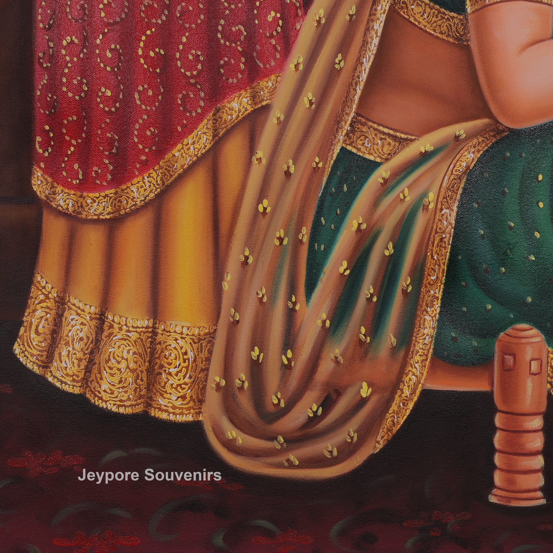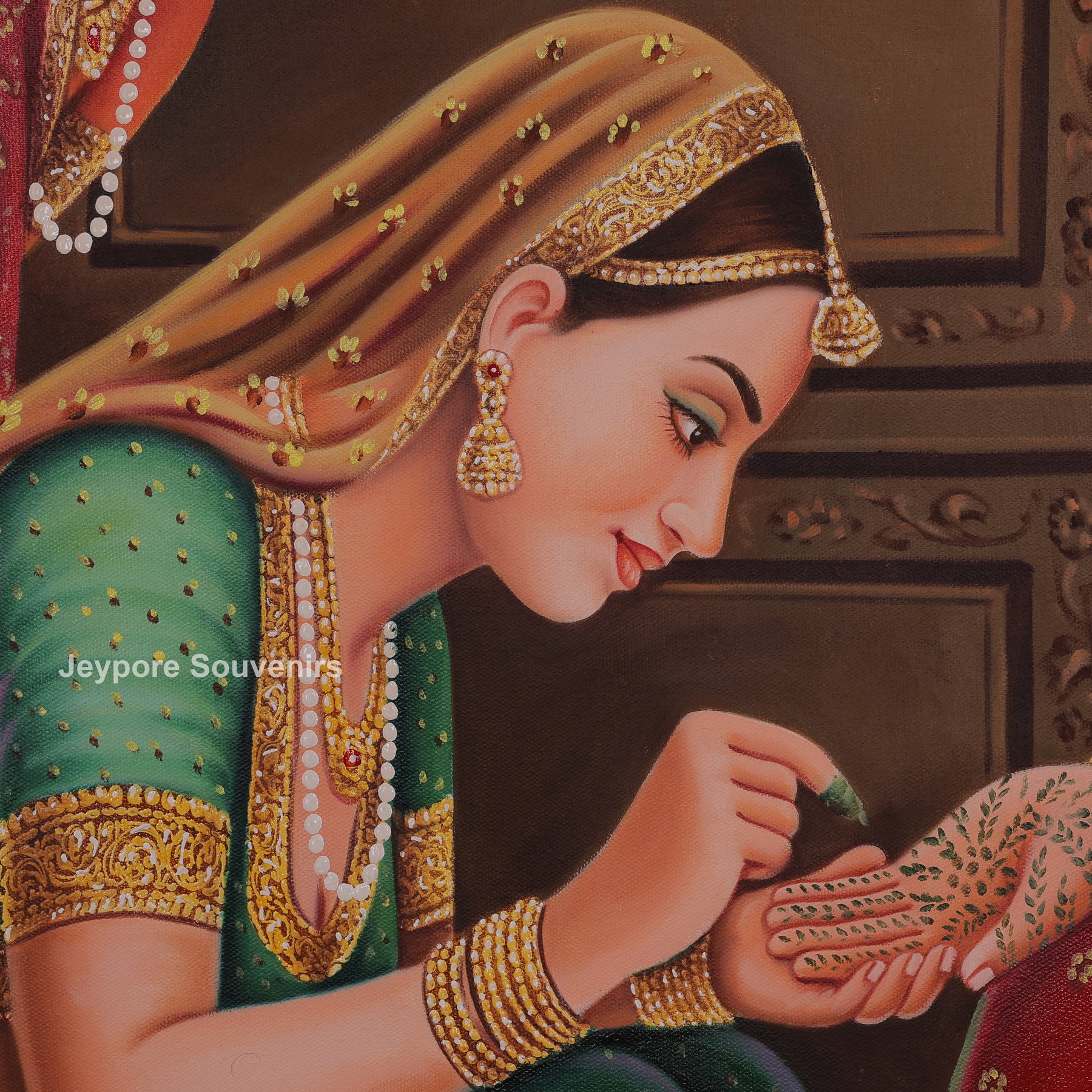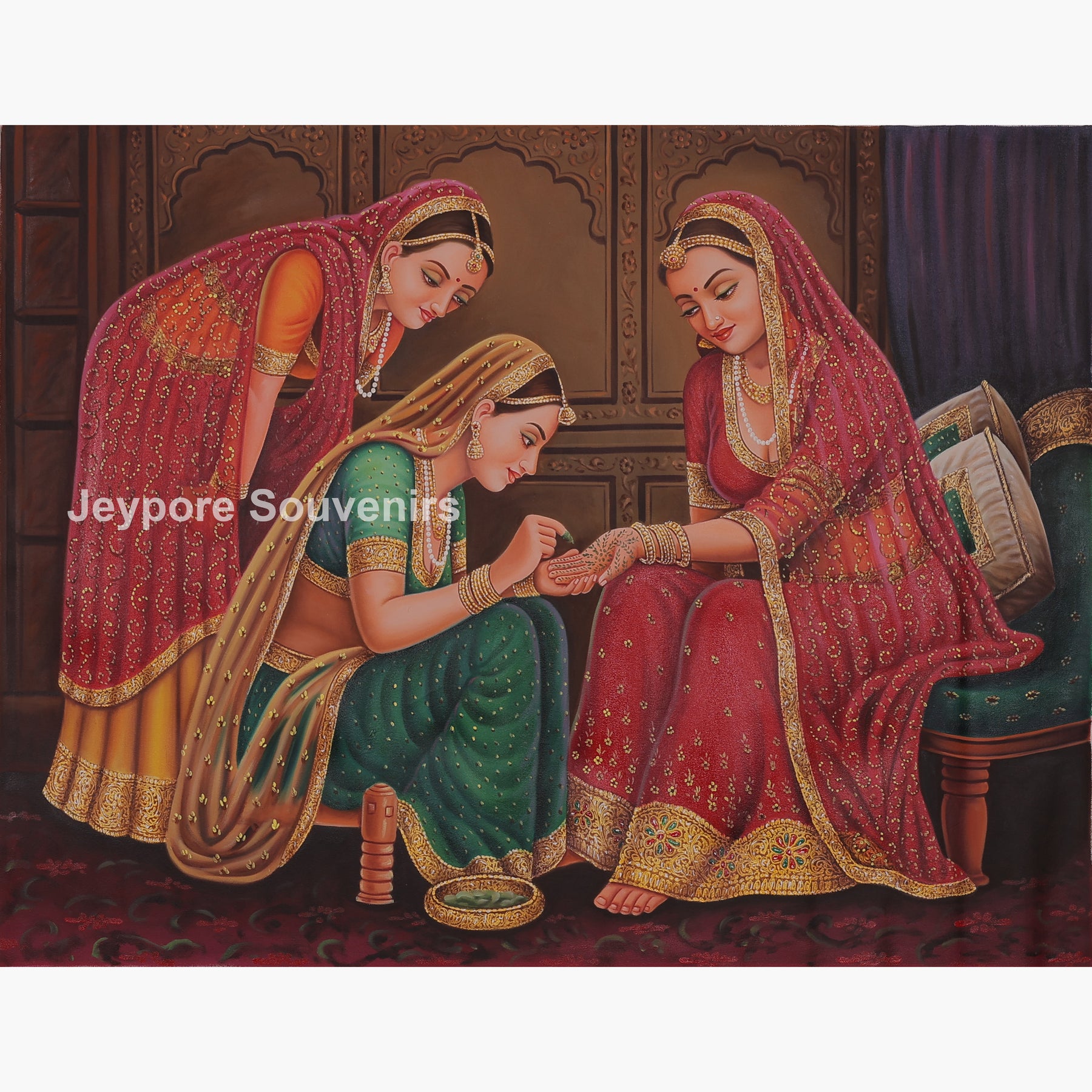 This canvas painting shows three women dressed in beautiful traditional clothing sharing a calm and intimate moment indoors. One woman is seated comfortably while another carefully applies mehendi designs to her palm, focusing closely on the details. The third woman stands nearby, leaning in to observe the process with interest and warmth. All three wear richly colored sarees with fine patterns, along with traditional jewelry that adds elegance to the scene. Small bowls and tools placed near them suggest the mehendi preparation ritual. The expressions on their faces are gentle and relaxed, showing trust, care, and companionship. The carved wall panels and soft furnishings in the background create a homely and royal atmosphere. The painting a peaceful moment of bonding, tradition, and shared cultural practice among women.