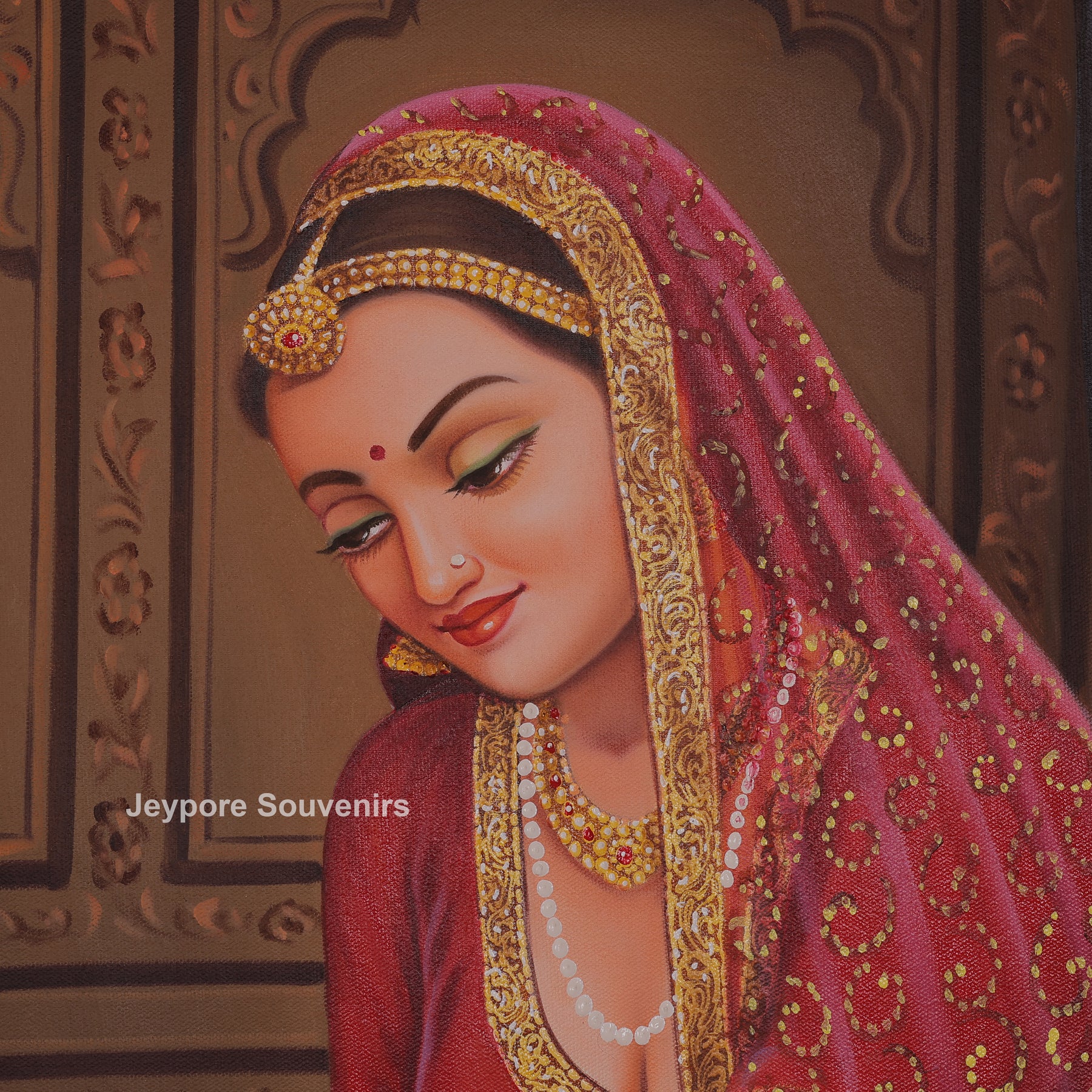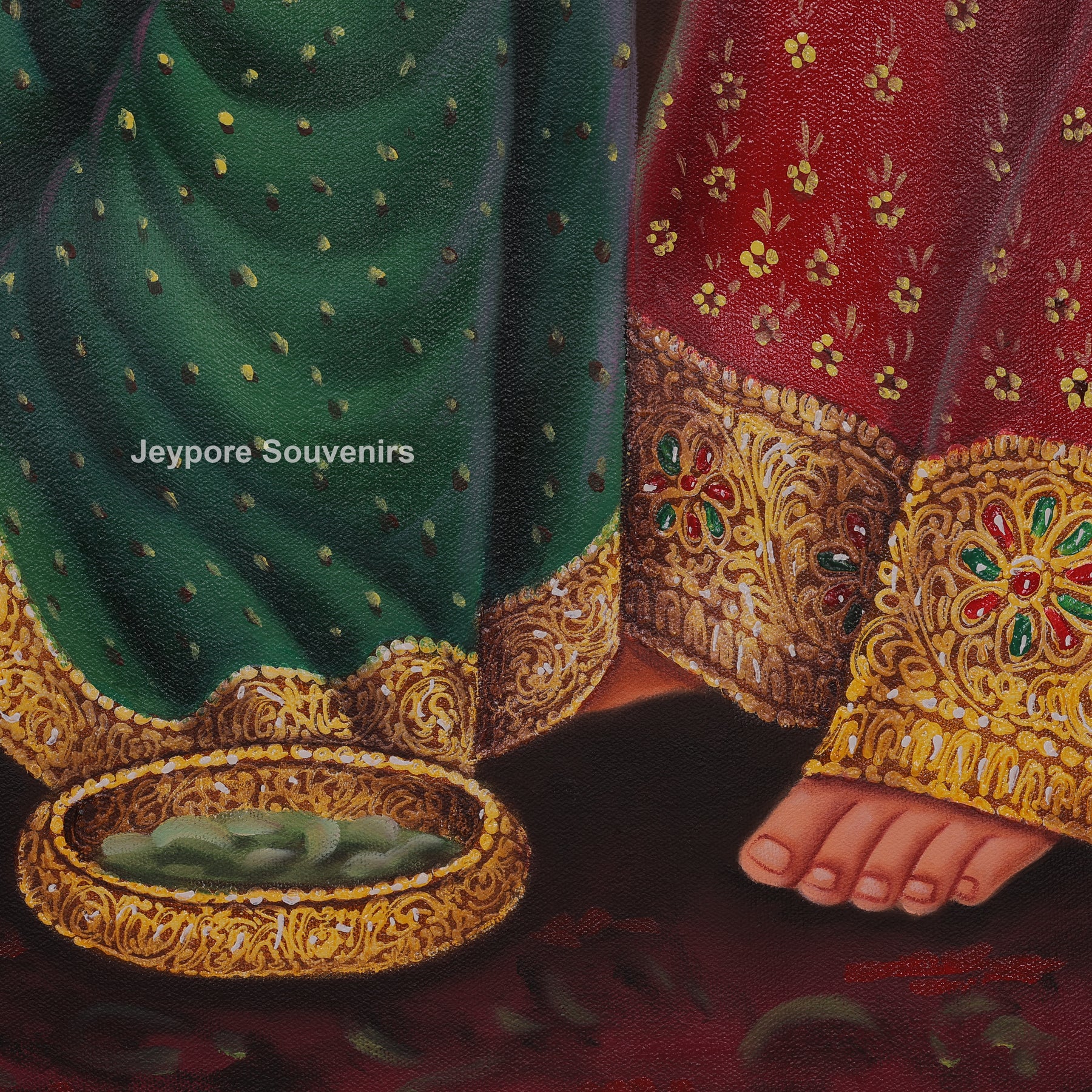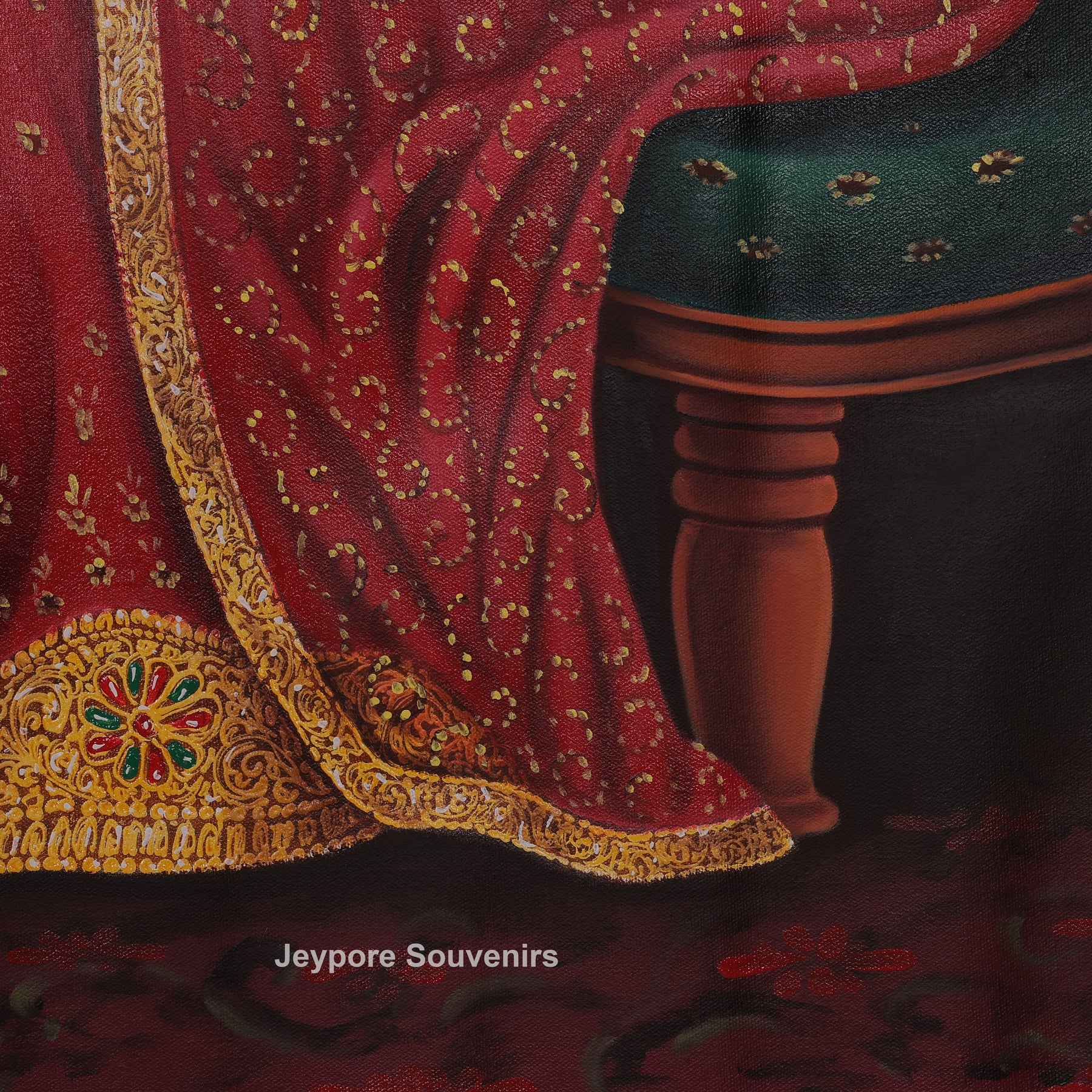 This canvas painting shows three women dressed in beautiful traditional clothing sharing a calm and intimate moment indoors. One woman is seated comfortably while another carefully applies mehendi designs to her palm, focusing closely on the details. The third woman stands nearby, leaning in to observe the process with interest and warmth. All three wear richly colored sarees with fine patterns, along with traditional jewelry that adds elegance to the scene. Small bowls and tools placed near them suggest the mehendi preparation ritual. The expressions on their faces are gentle and relaxed, showing trust, care, and companionship. The carved wall panels and soft furnishings in the background create a homely and royal atmosphere. The painting a peaceful moment of bonding, tradition, and shared cultural practice among women.
