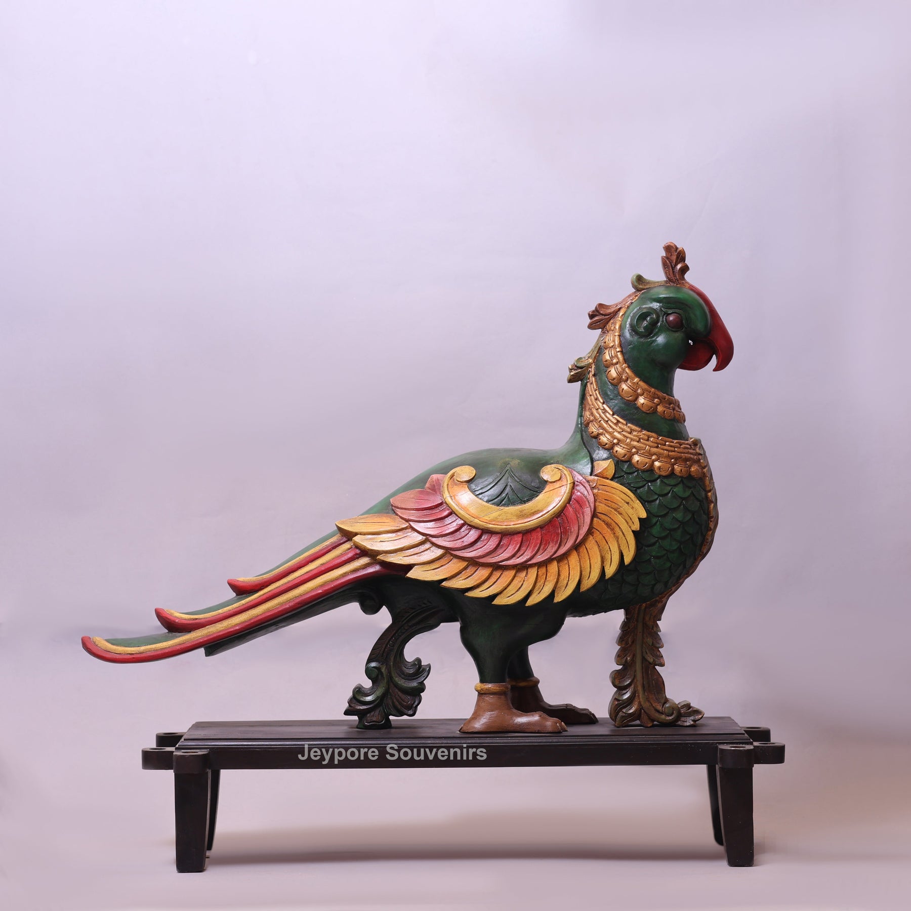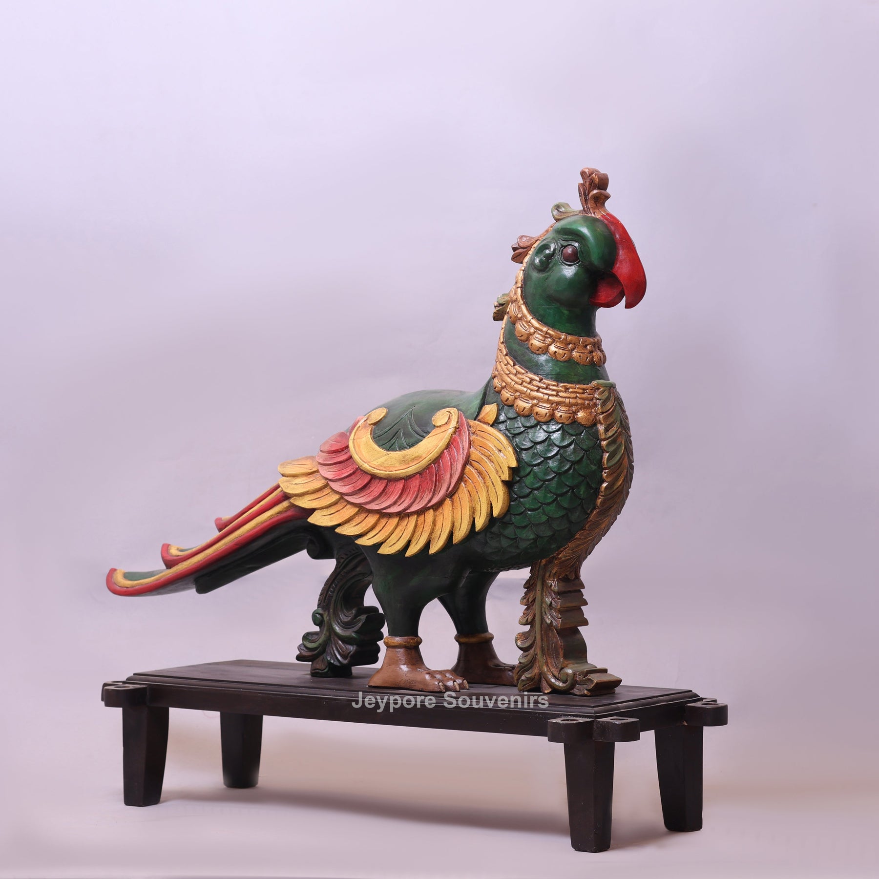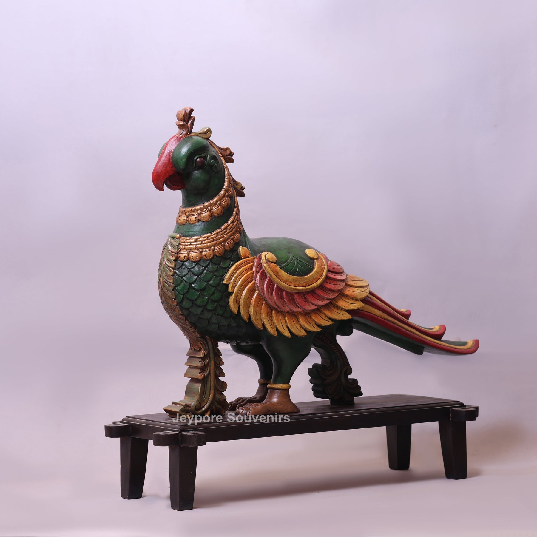 The Annapakshi, also known as the Hamsa, is a mythical celestial bird deeply revered in Indian mythology. Often described as having the body and beak of a swan with the plumage of a peacock, it is believed to symbolize divine beauty, purity of the soul, and spiritual enlightenment. Traditionally, the Anna Pakshi is also known as the vahana (vehicle) of Goddess Saraswati, the goddess of wisdom, art, and knowledge. This magnificent Handcrafted Wooden Parrot vahan (anna pakshi) Statue is a stunning representation of traditional Rajasthani artistry.
