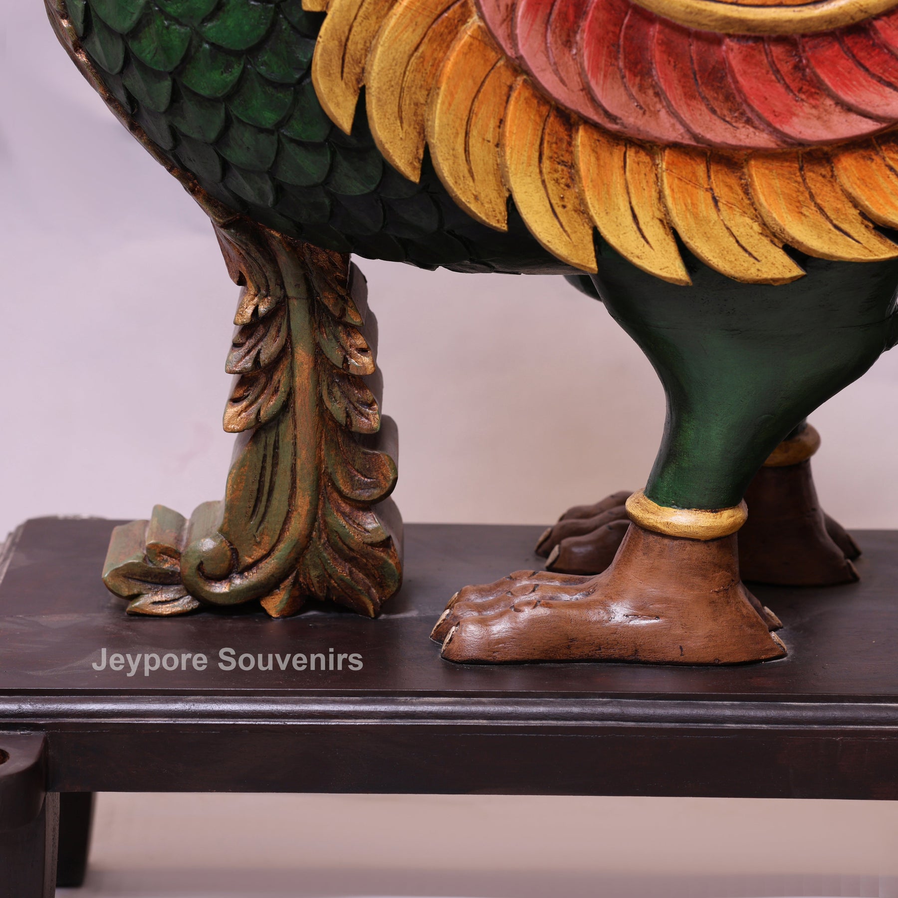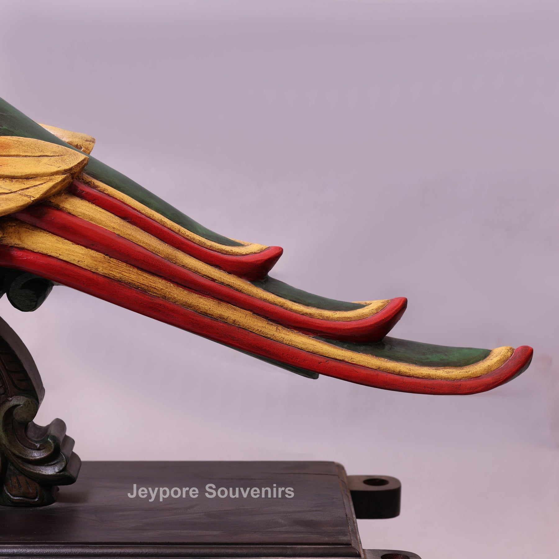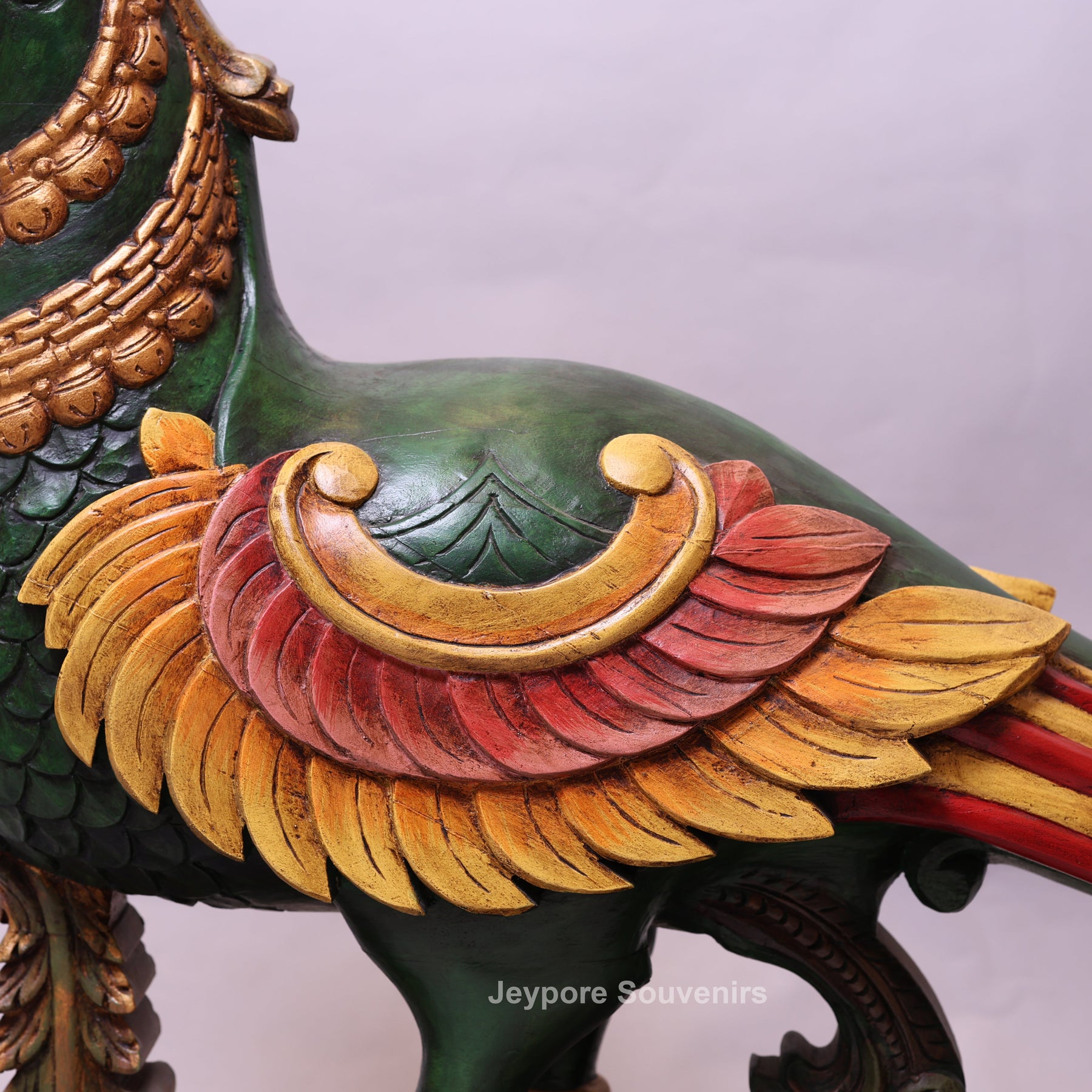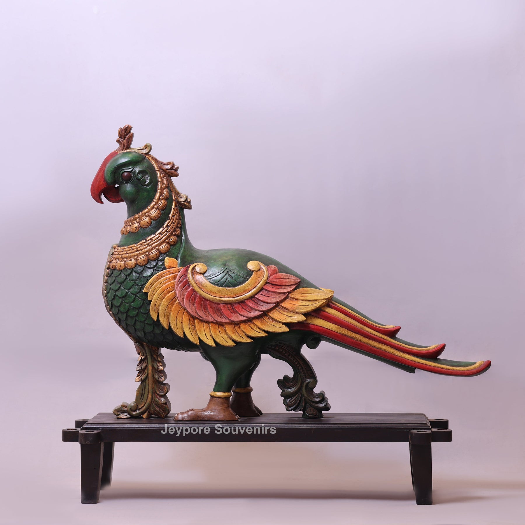 The Annapakshi, also known as the Hamsa, is a mythical celestial bird deeply revered in Indian mythology. Often described as having the body and beak of a swan with the plumage of a peacock, it is believed to symbolize divine beauty, purity of the soul, and spiritual enlightenment. Traditionally, the Anna Pakshi is also known as the vahana (vehicle) of Goddess Saraswati, the goddess of wisdom, art, and knowledge. This magnificent Handcrafted Wooden Parrot vahan (anna pakshi) Statue is a stunning representation of traditional Rajasthani artistry.