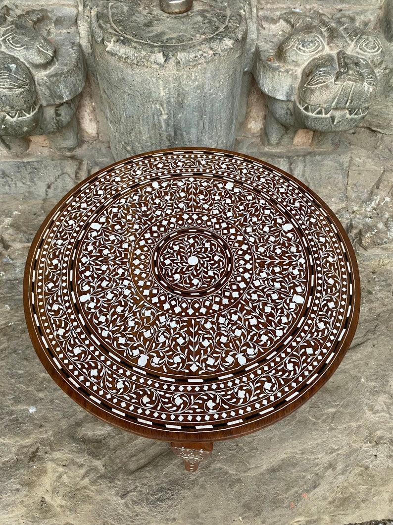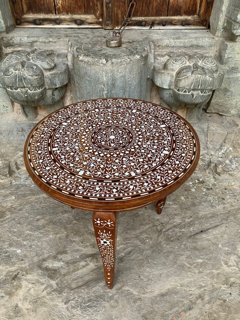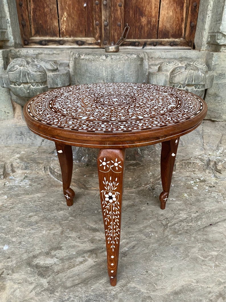 This Unique Circular Coffee table which is hand carved with Inlay work reflects the Indian craft in its true form. The legs of this wooden coffee table are detachable, so it becomes very east to carry this anywhere.