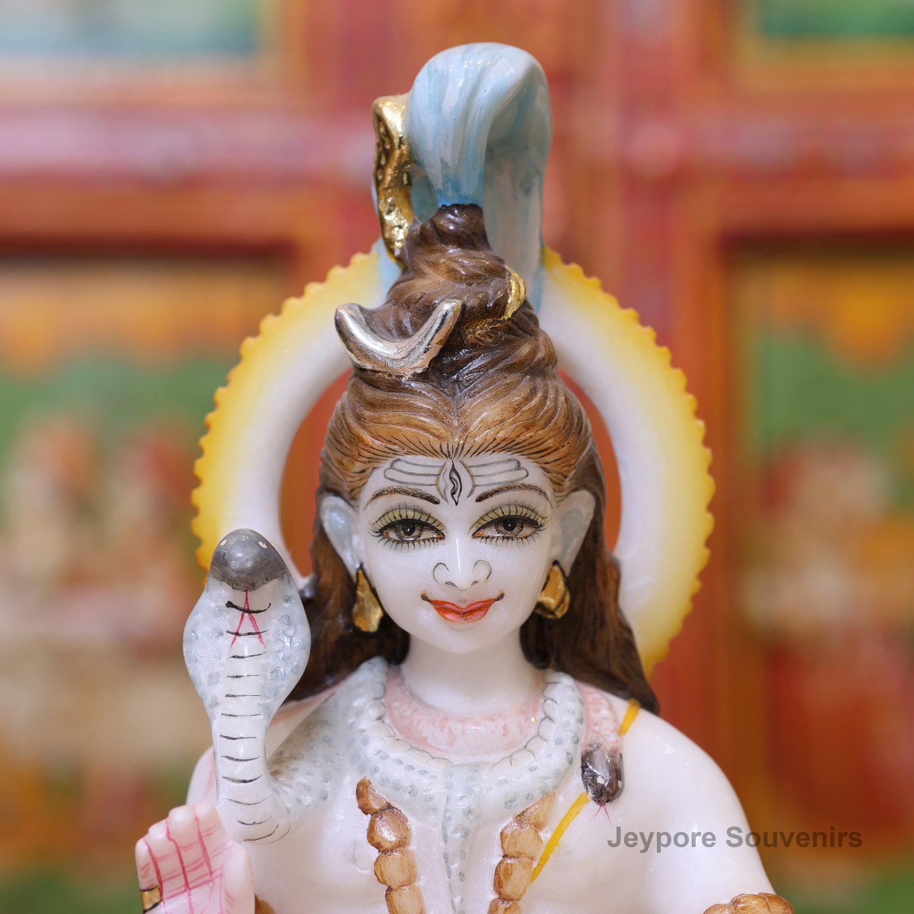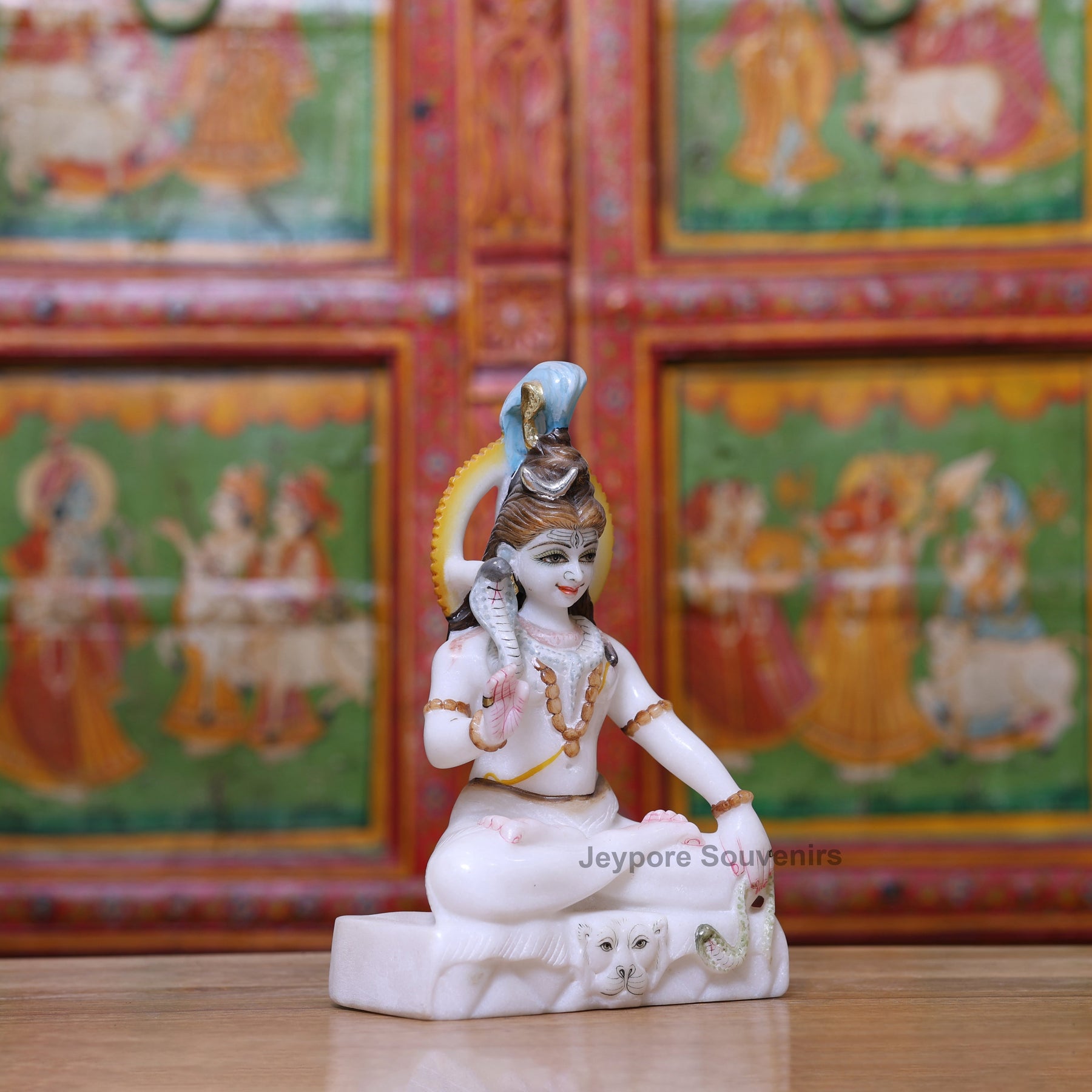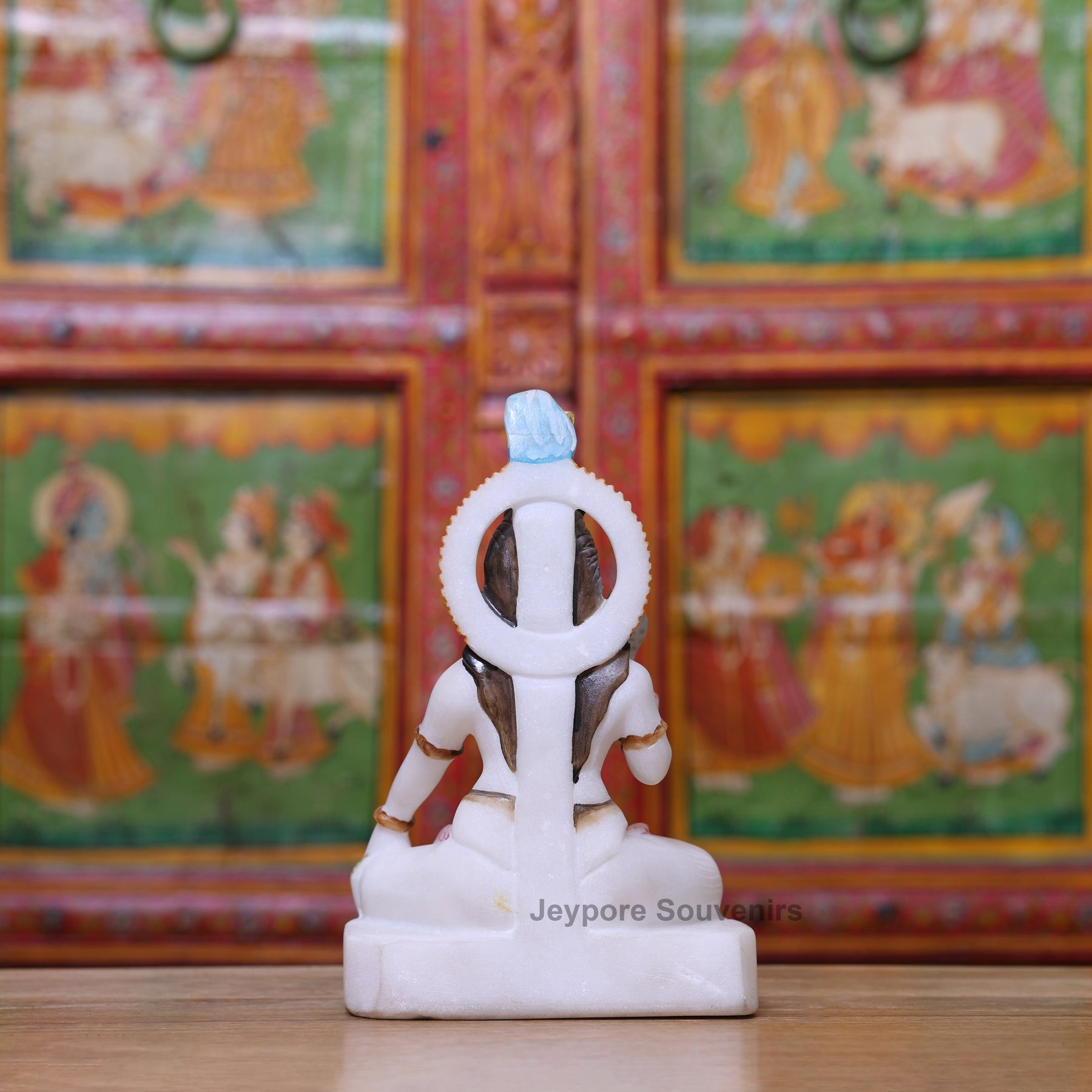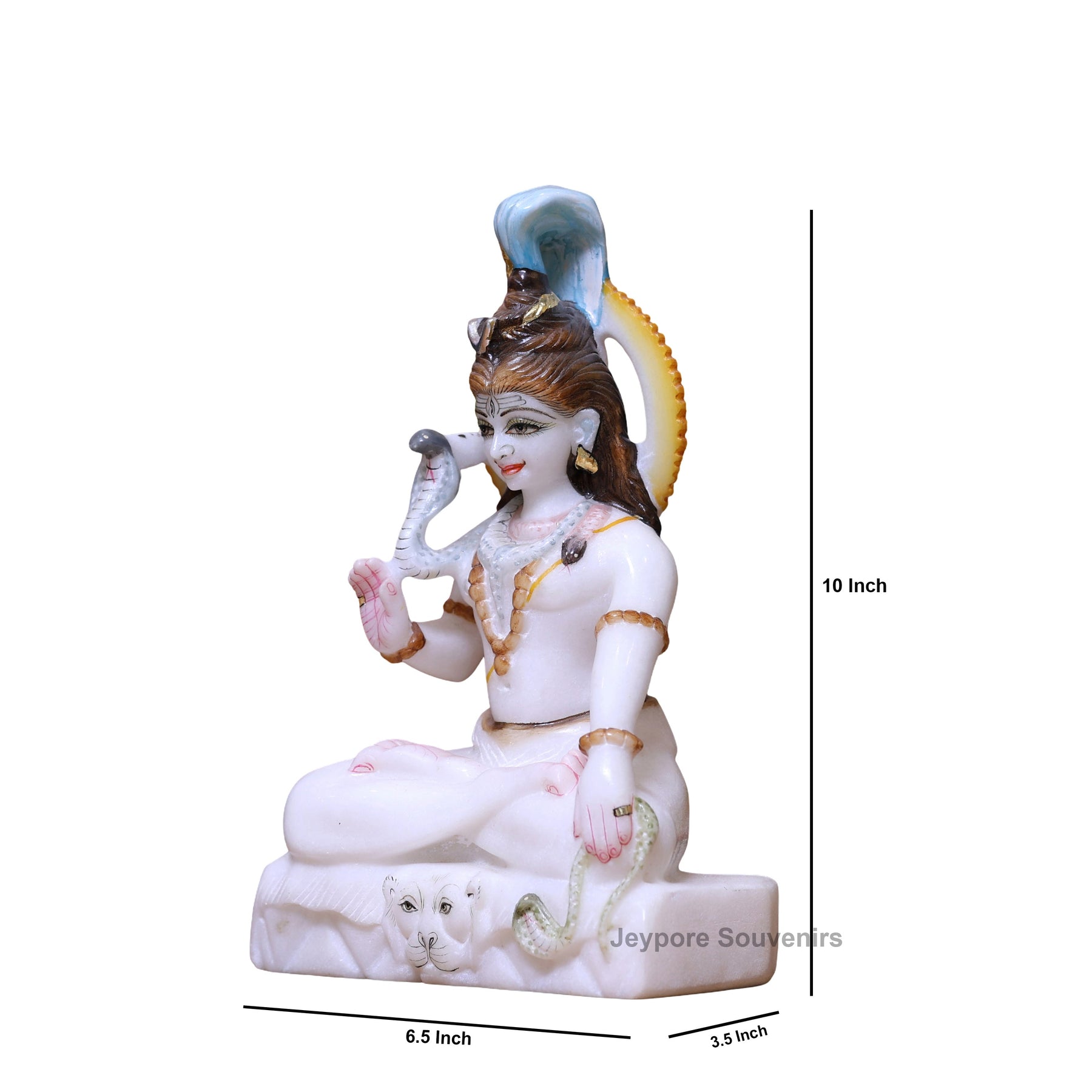 Explore the elegance of 10 inches Pure White Marble Lord Shiva Statue is an exquisite piece of devotion and artistry. It is meticulously handcrafted by jeypore souvenirs expert artisans. Carved from pure marble, the statue depicts Lord Shiva in a peaceful meditative pose, adorned with his signature attributes the snake (symbolizing fearlessness), the crescent moon, and the sacred Ganga flowing from his matted hair.