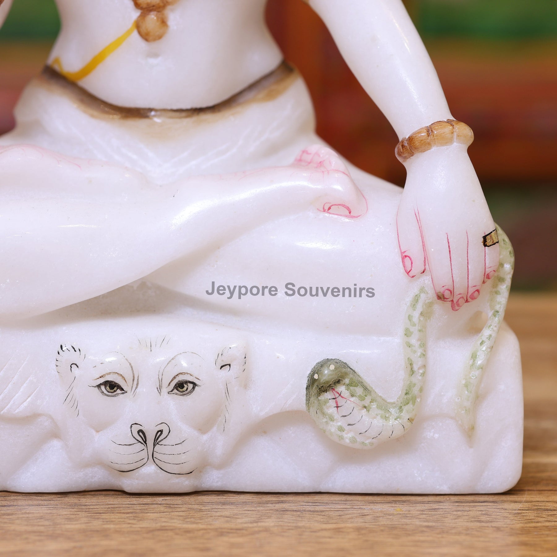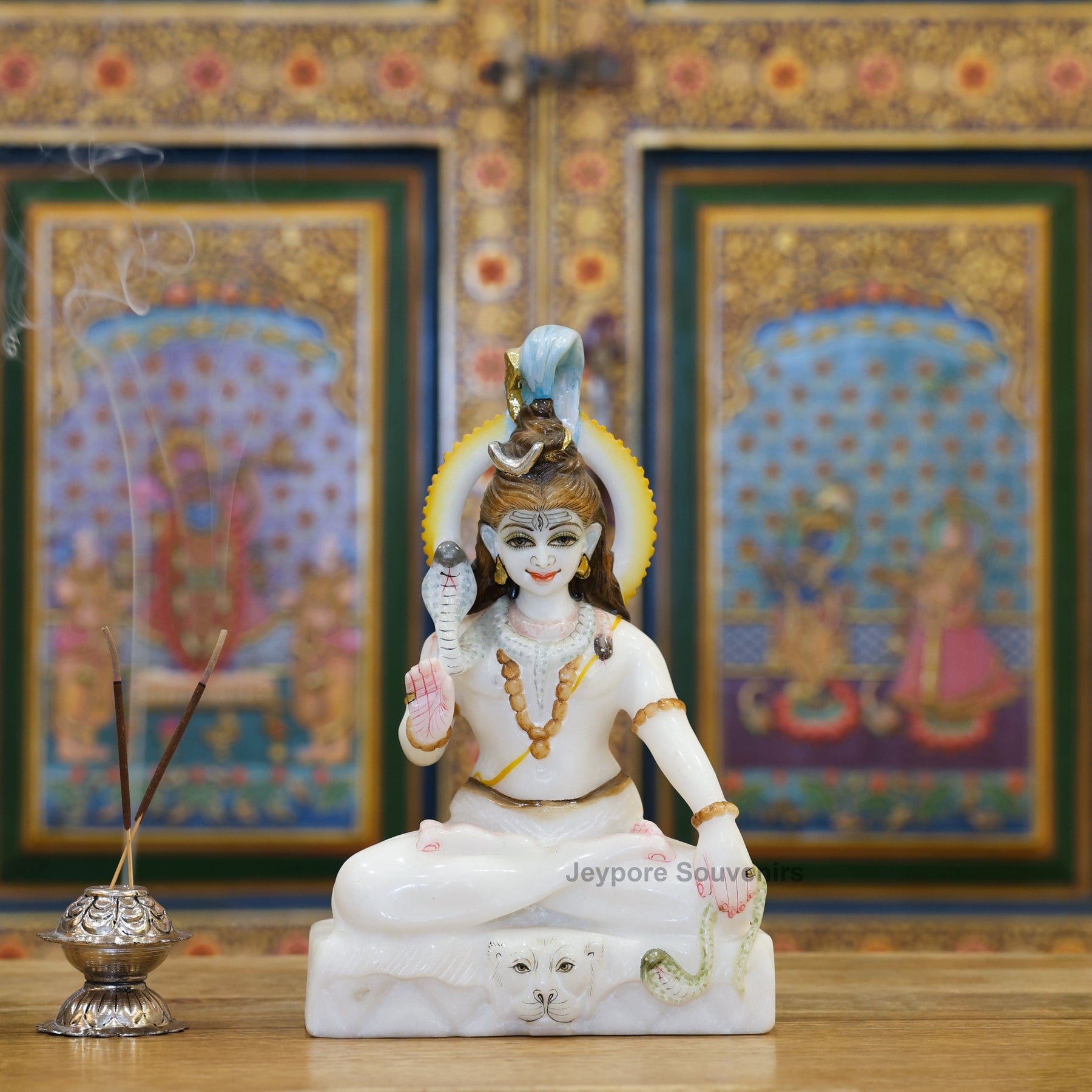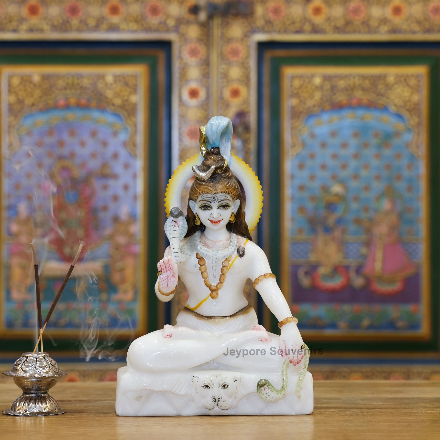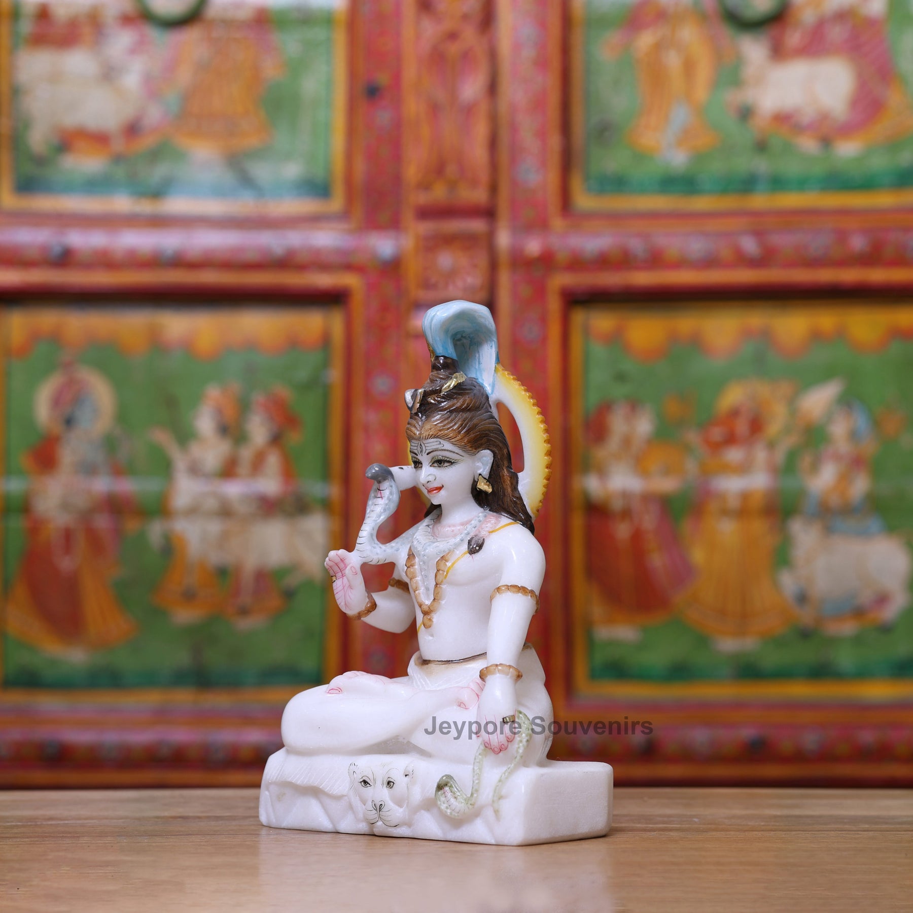 Explore the elegance of 10 inches Pure White Marble Lord Shiva Statue is an exquisite piece of devotion and artistry. It is meticulously handcrafted by jeypore souvenirs expert artisans. Carved from pure marble, the statue depicts Lord Shiva in a peaceful meditative pose, adorned with his signature attributes the snake (symbolizing fearlessness), the crescent moon, and the sacred Ganga flowing from his matted hair.
