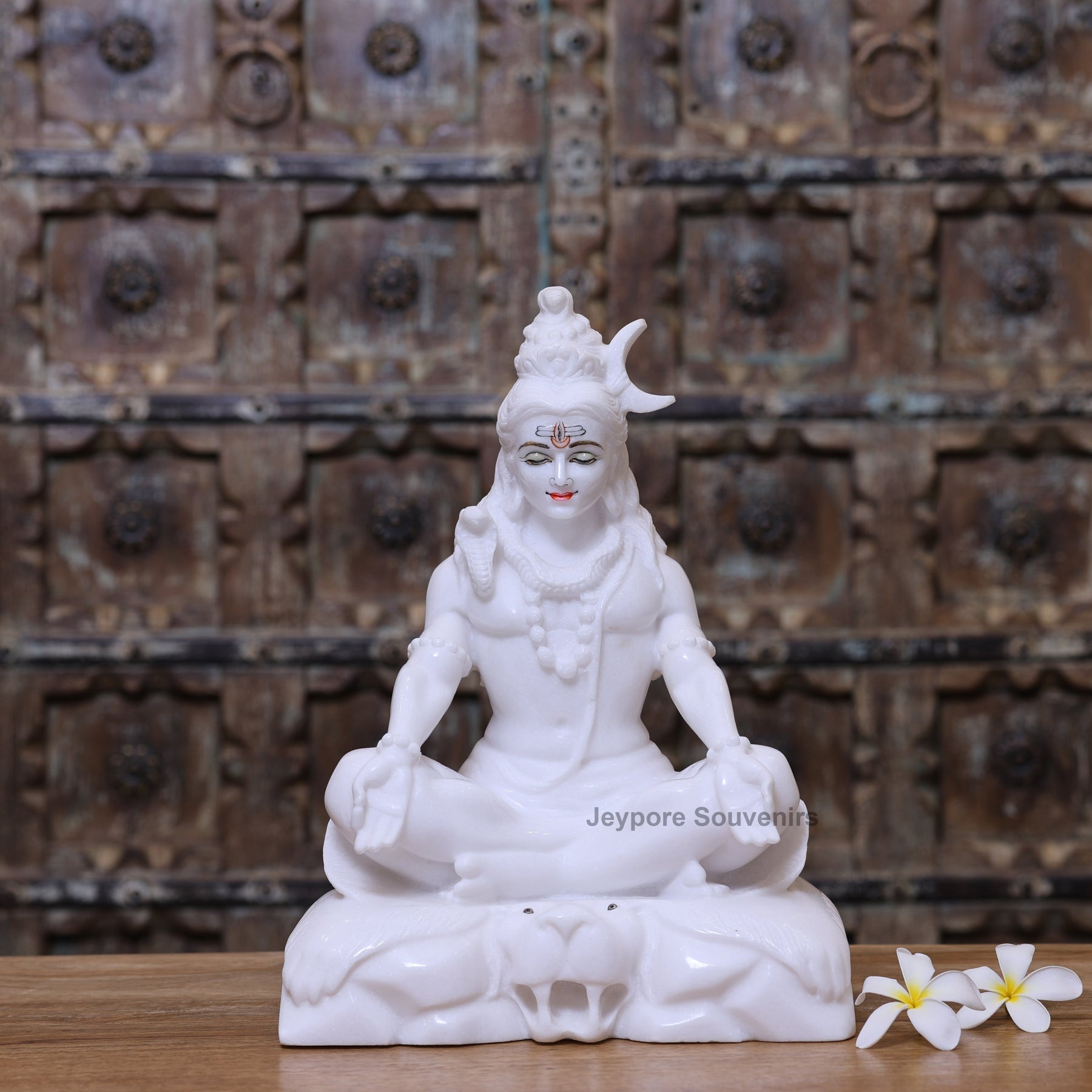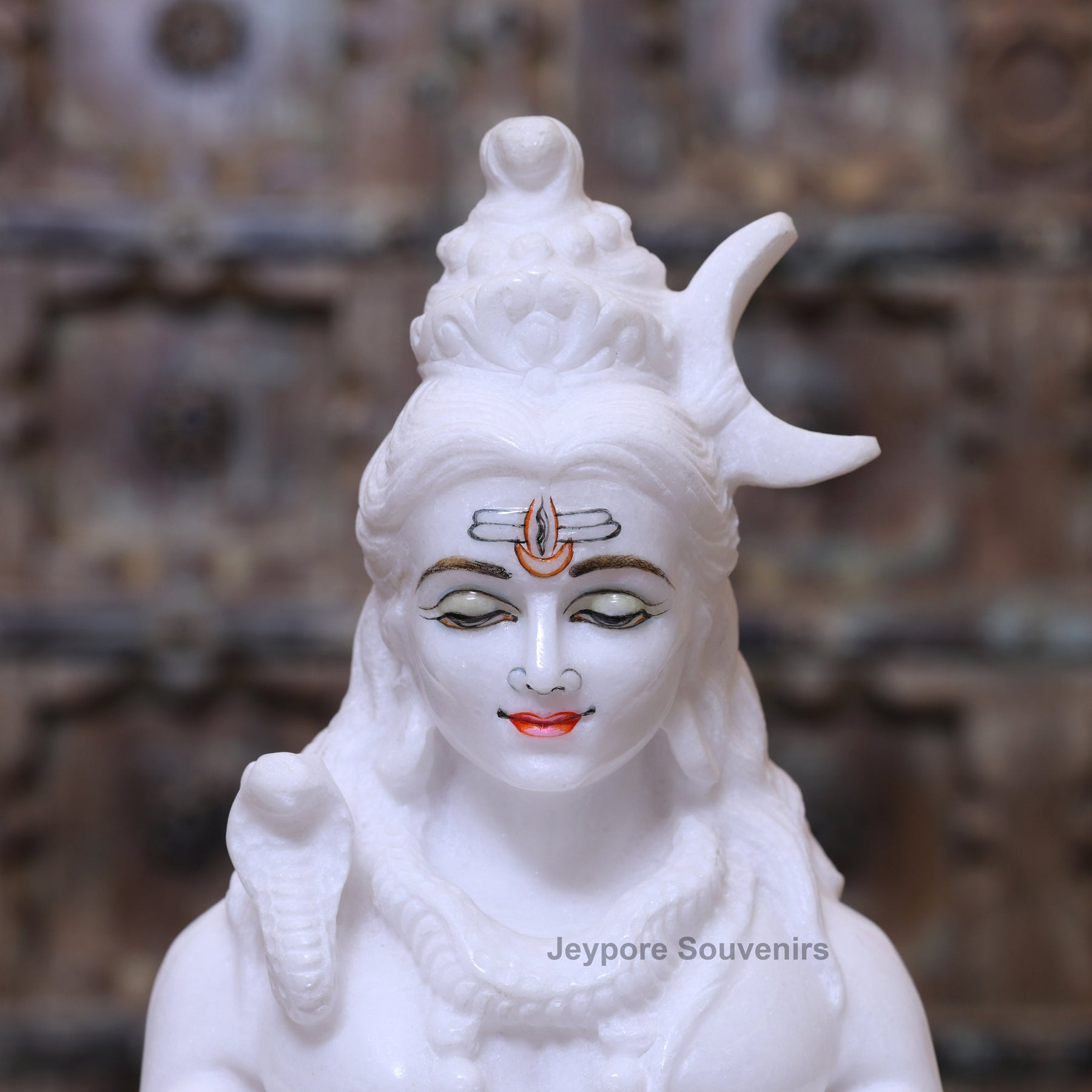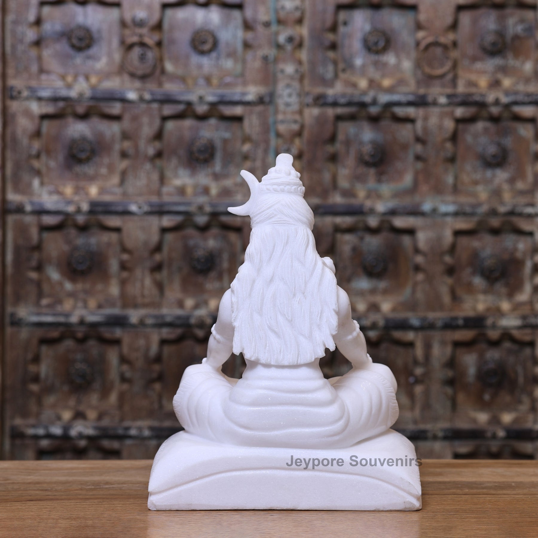 Bring divine serenity into your space with this handcrafted 15-inch Lord Shiva marble statue from Jeypore Souvenirs. Meticulously carved from a single block of pure Makrana marble. This Shiv Murti showcases a meditative posture, symbolizing calmness, detachment, and inner balance. The smooth white finish represents purity and peace, while the intricate hand-painted features reflect traditional artistry from Jaipur’s skilled artisans.