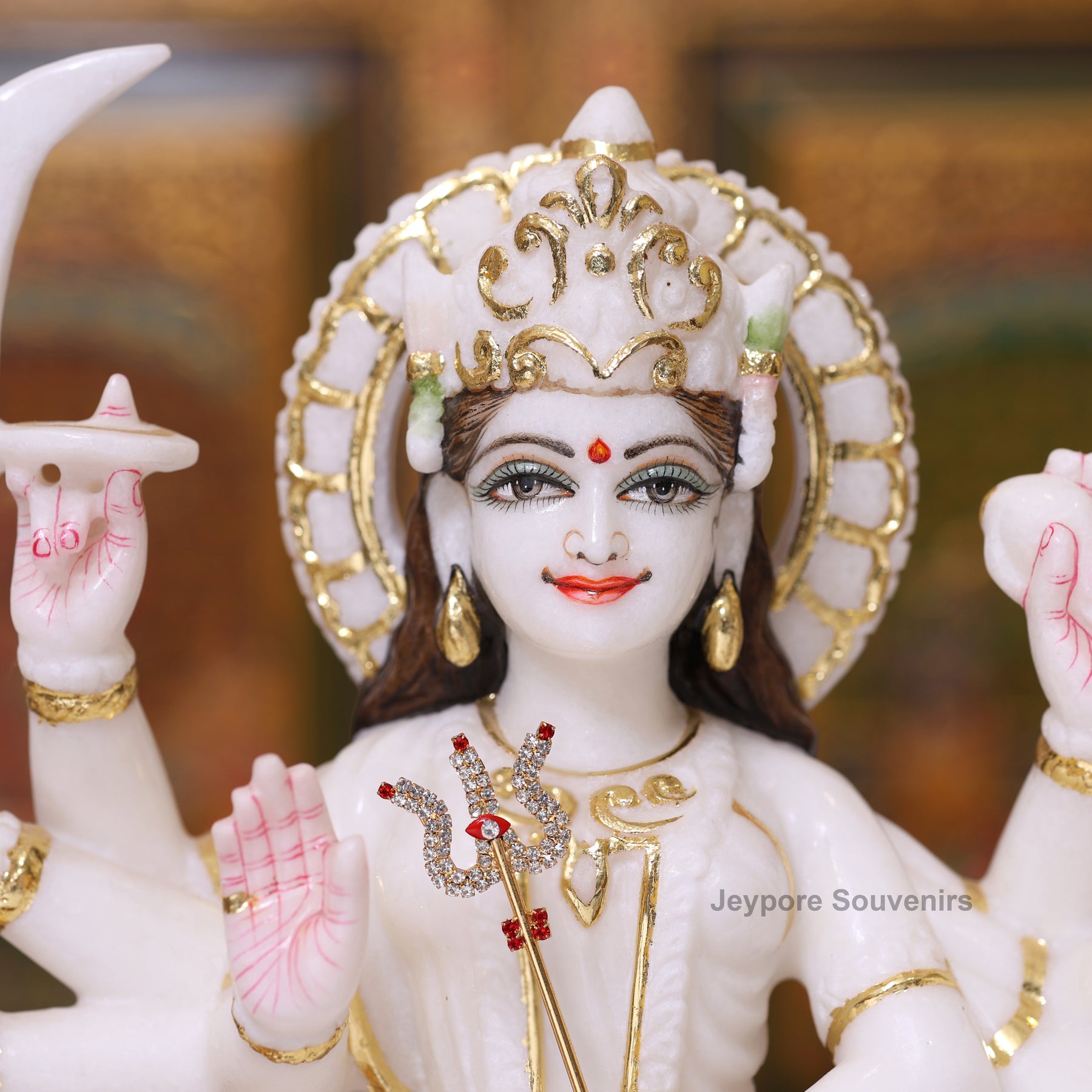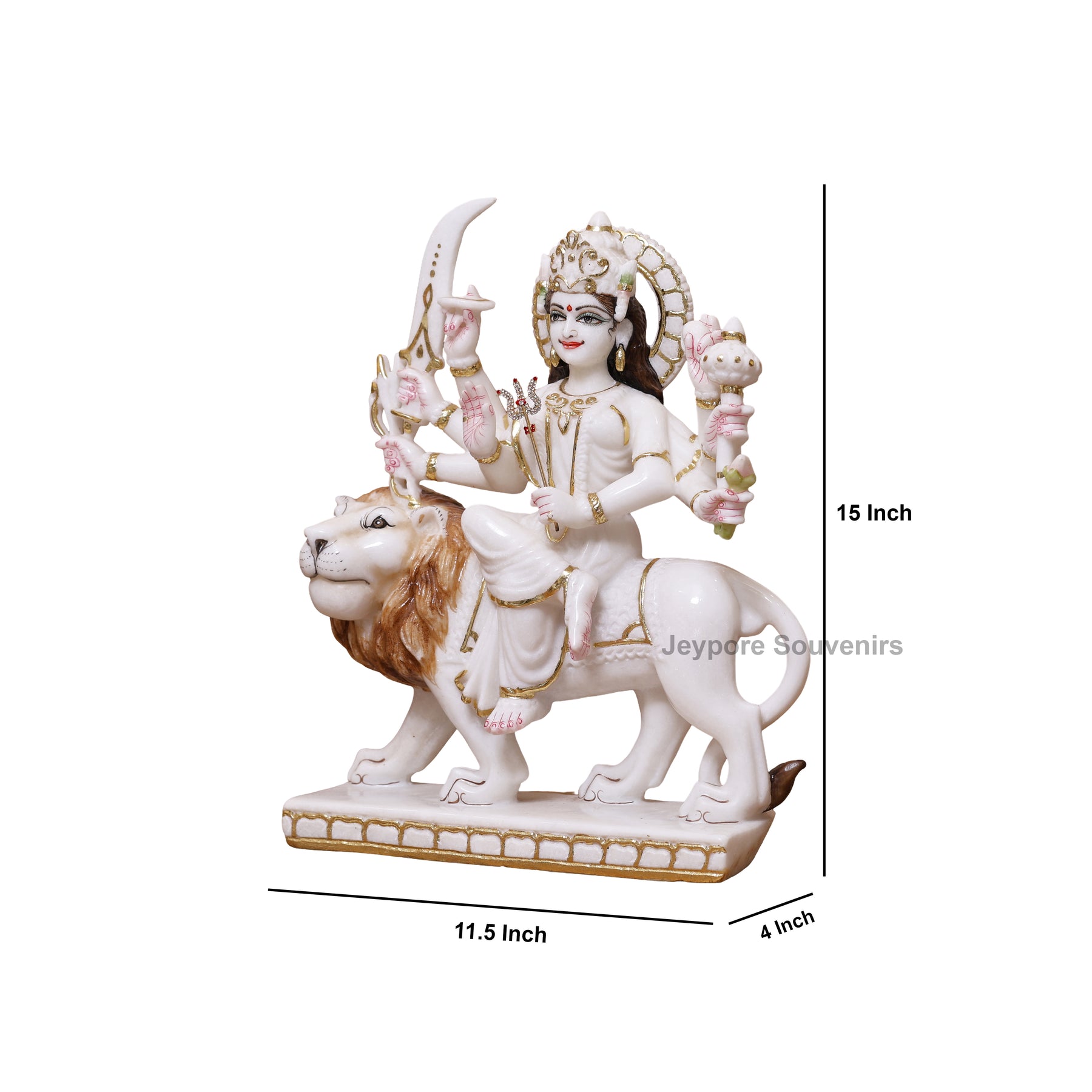 Bring home divine grace with this handcrafted 15-inch Goddess Durga statue, a symbol of courage, protection, and strength. Beautifully sculpted from pure white Makrana marble, this masterpiece depicts Maa Durga seated gracefully on her lion, representing the eternal triumph of good over evil.