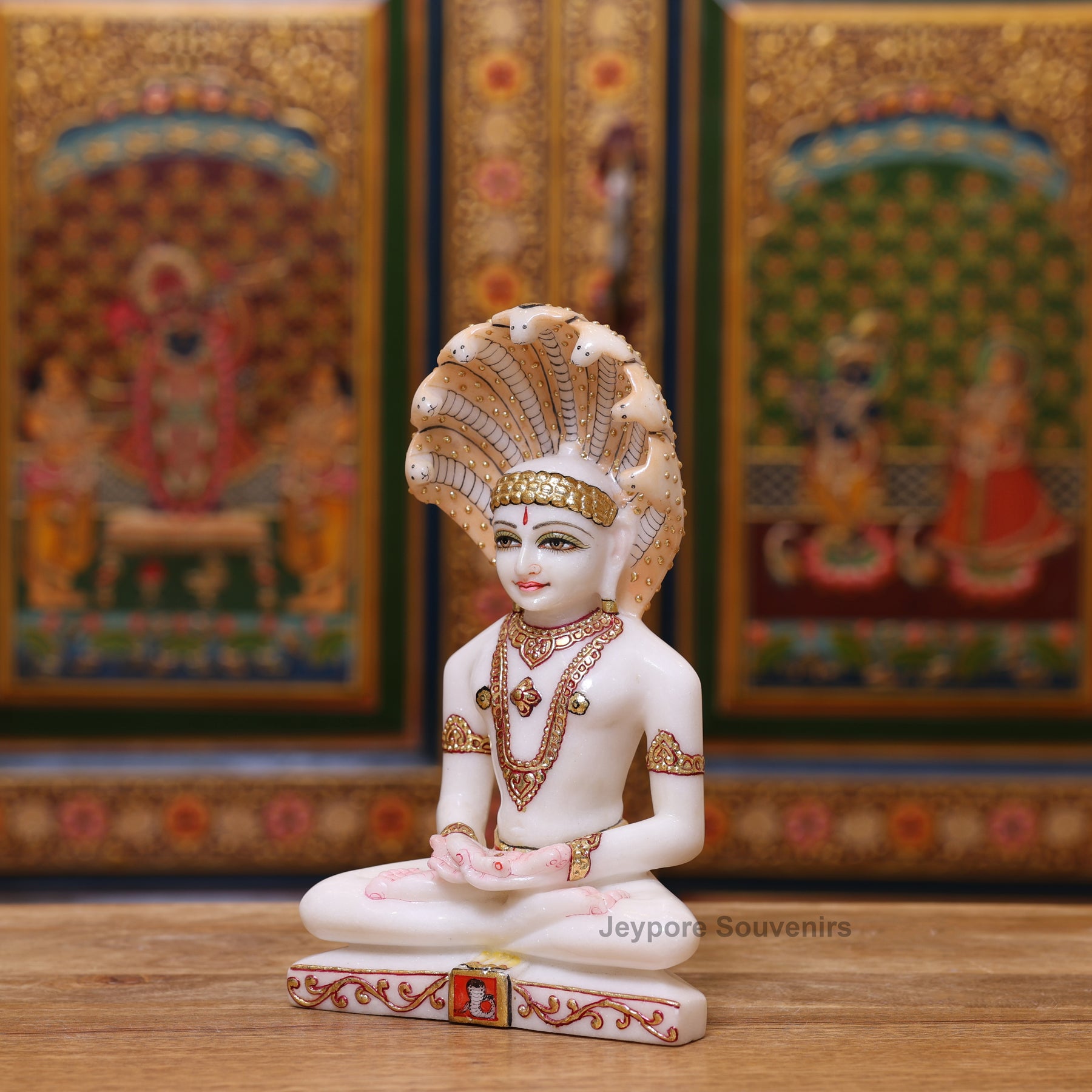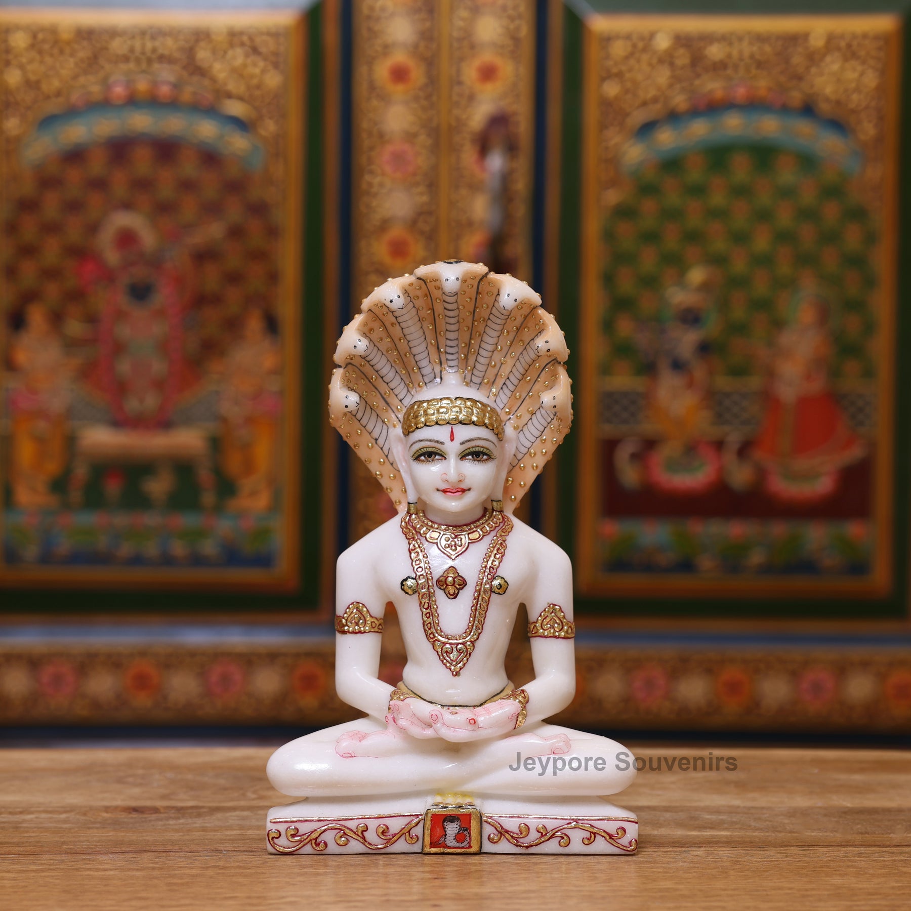 Discover a masterpiece of spiritual artistry with this exquisite Bhagwan Parshvanatha idol, carved from pure white marble with real gold leaf. Parshvanatha, the 23rd Jain Tirthankara, is uniquely identified by the protective canopy of a multi-headed serpent (Dharanendra) above him, symbolizing divine protection during his deepest meditations.