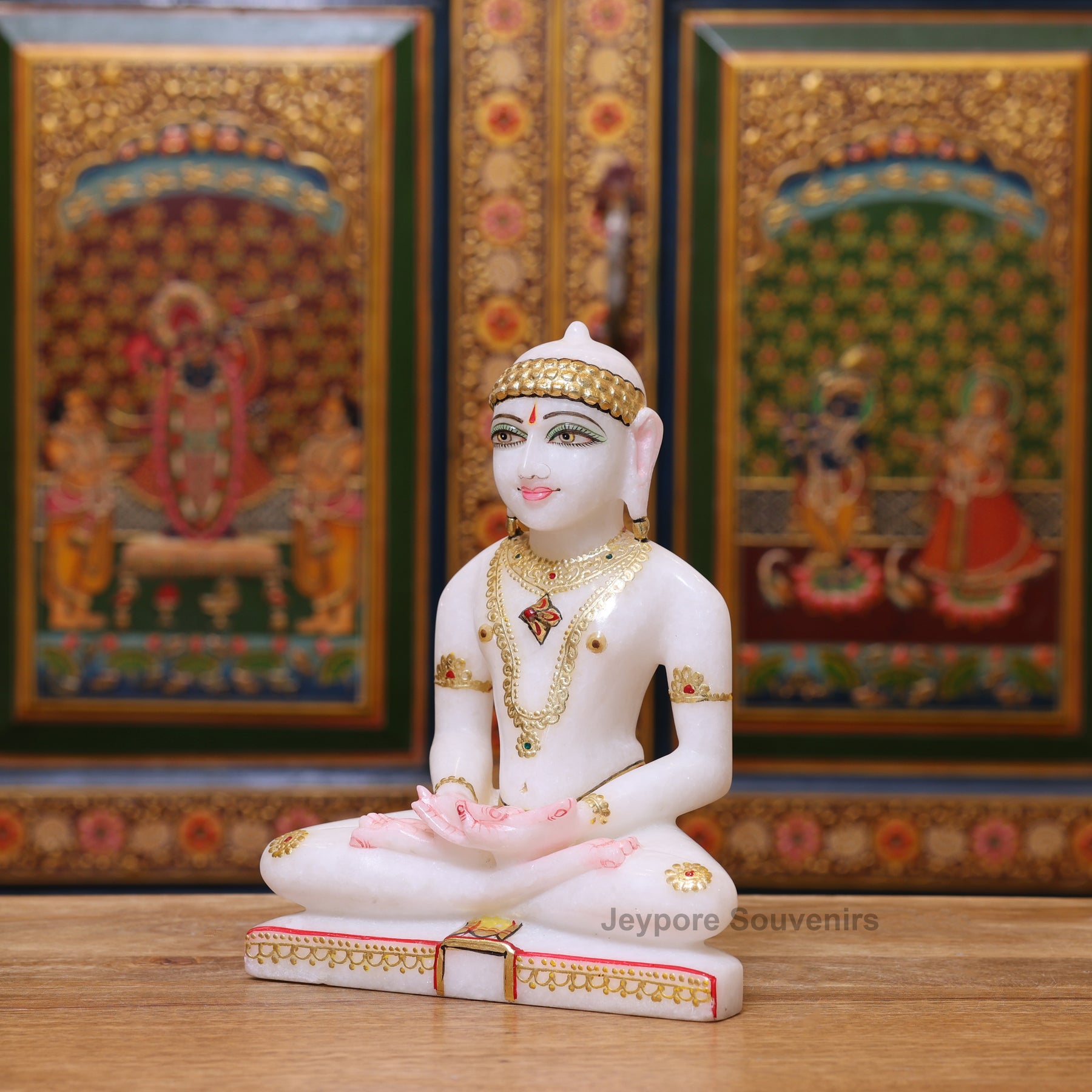 9" Premium Pure White Marble Mahavir Swami Idol for Home Temple | Hand-Painted Tirthankara Statue