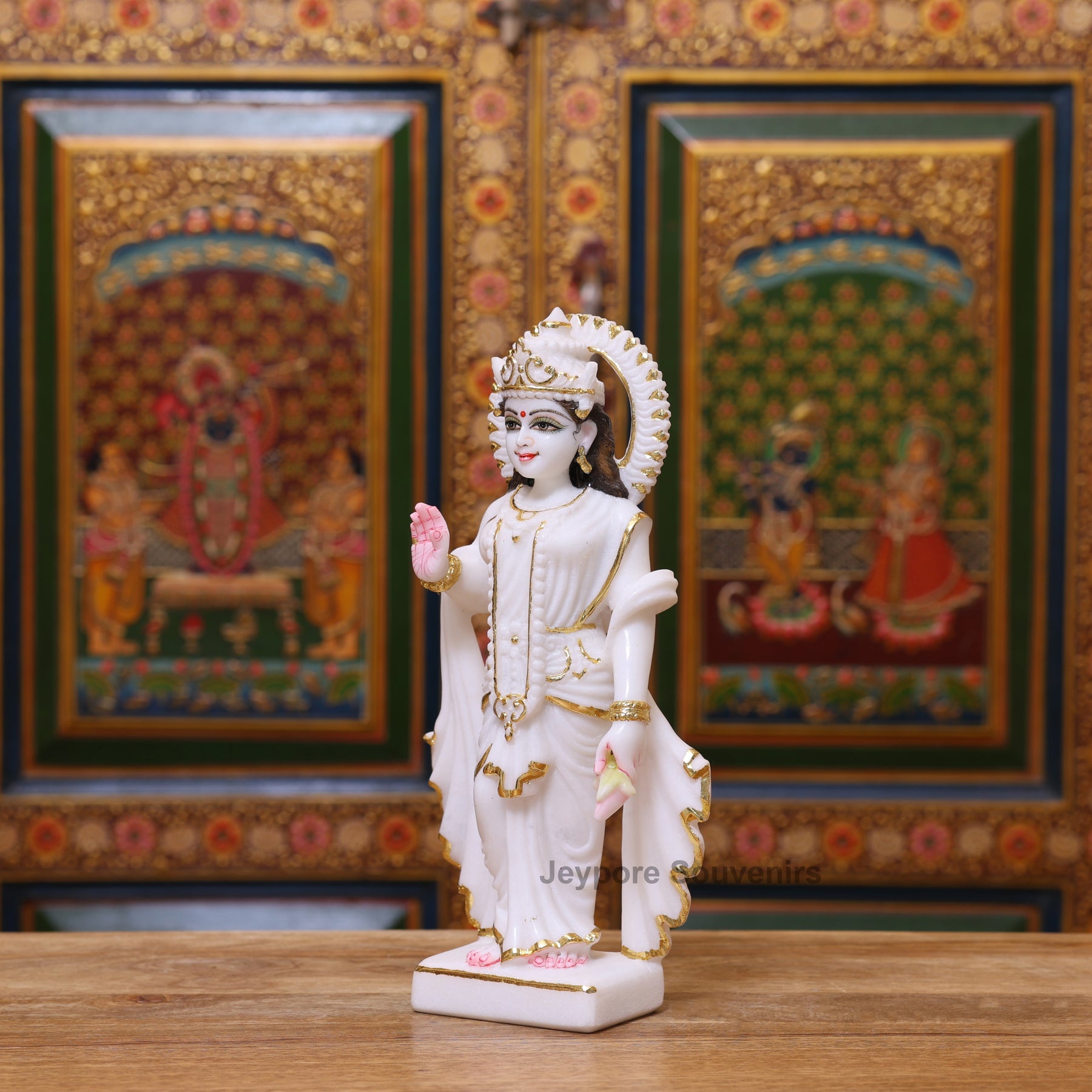 This elegant Lakshmi-Narayan Idol Set is a true reflection of divine beauty and traditional craftsmanship. Expertly handcrafted from pure white marble with real gold leaf, this idol pair features intricate detailing and is beautifully decorated, highlighting the regal aura of Lord Vishnu (Narayan) and Goddess Lakshmi.