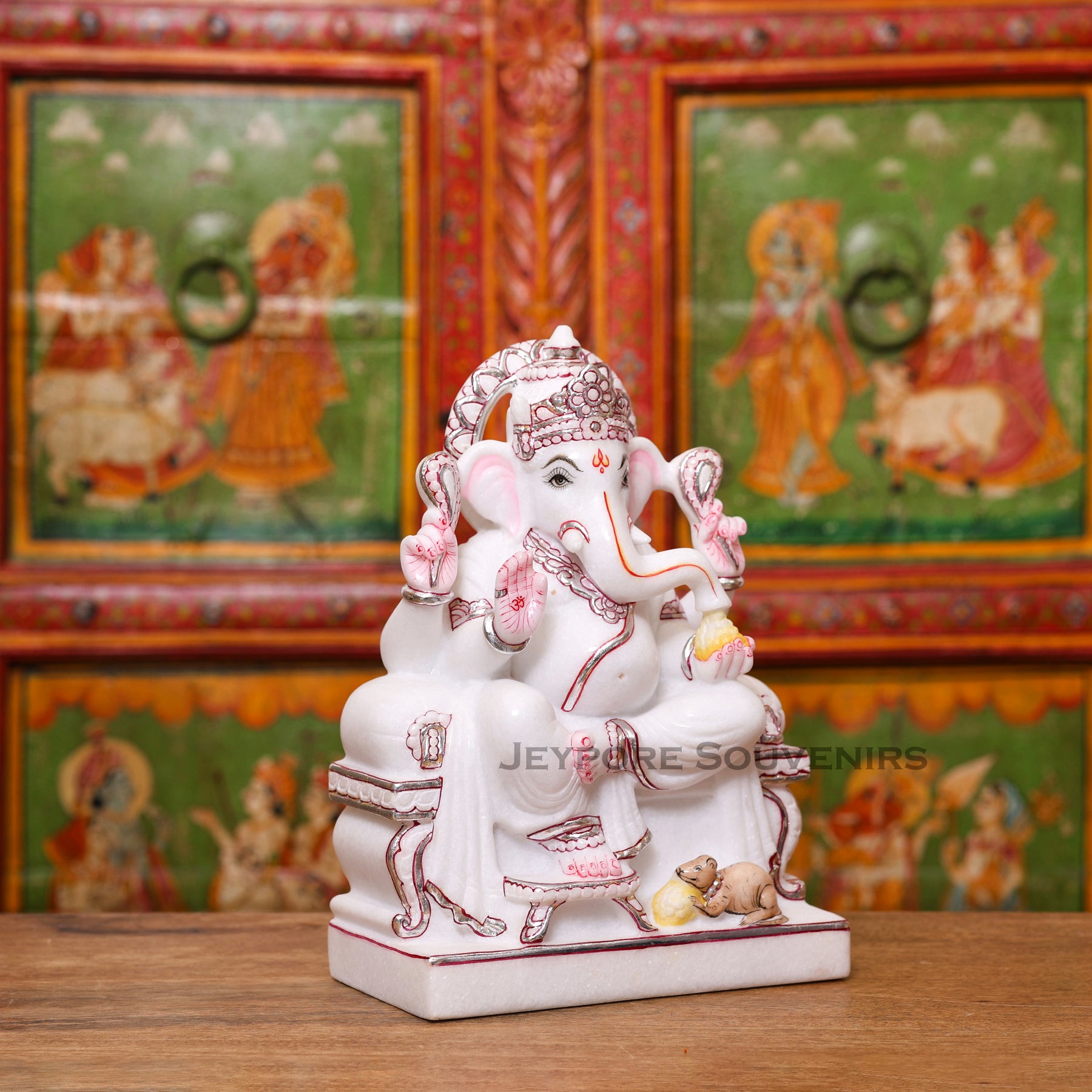 This beautiful idol depicts Lord Ganesha seated gracefully on a traditional throne, accompanied by his symbolic mouse at the base. The design features fine hand-painted details in subtle pink and golden tones, adding elegance and authenticity to the piece.