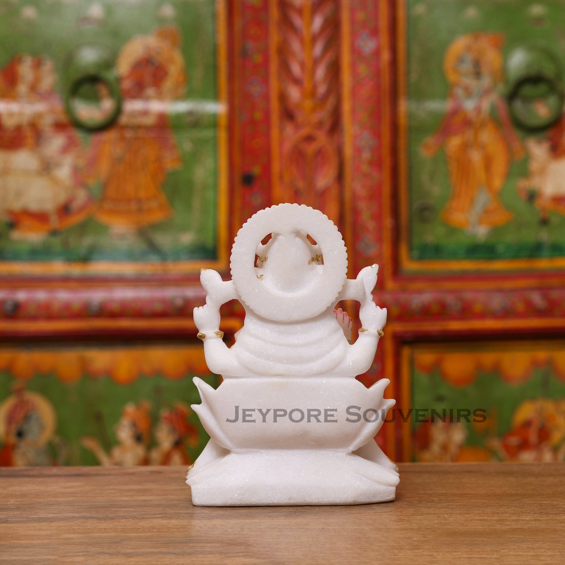 Bring home divine blessings and prosperity with this 8 Inches Pure White Marble Ganesha Idol with Real Gold Leaf Work. Handcrafted by skilled artisans, this Lord Ganesha statue is made from 100% pure white marble and the ornaments of the Ganesha statue are beautifully decorated with real gold leaf, giving it a rich and elegant look.