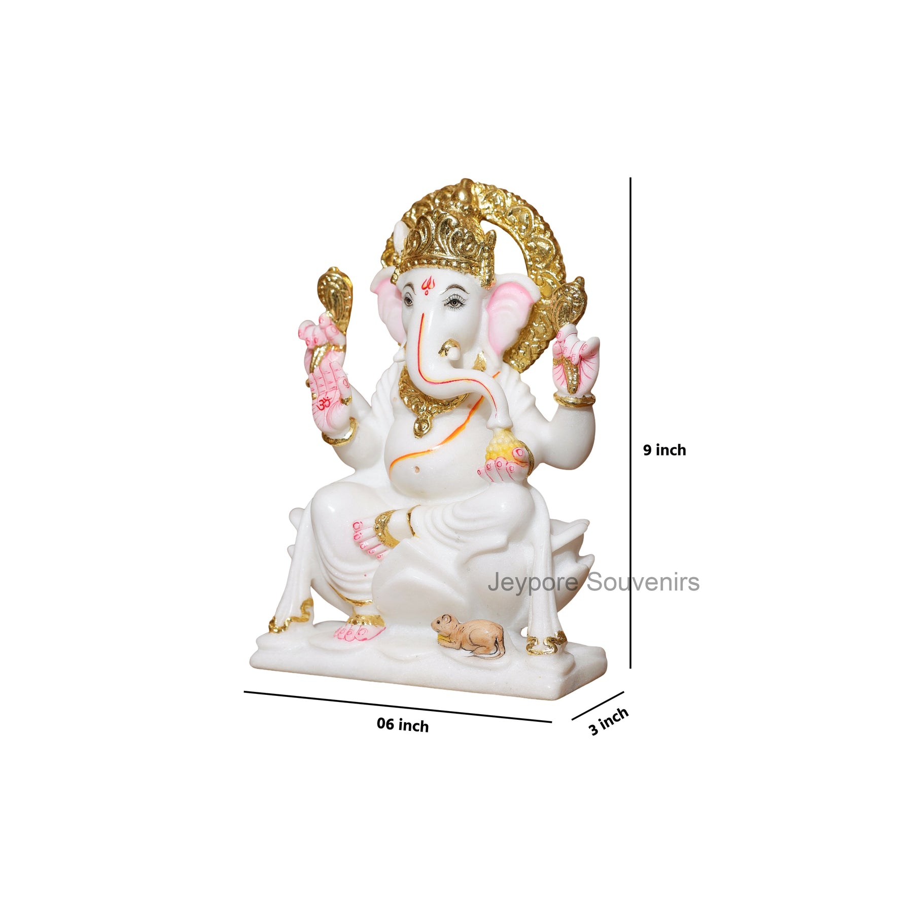 The idol measures 9 inches in height, 6 inches in width, and 3 inches in depth, making it ideal for home temples, living rooms, or as an elegant décor piece for offices and reception areas.