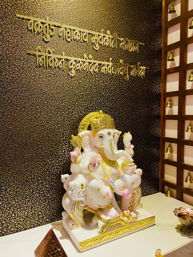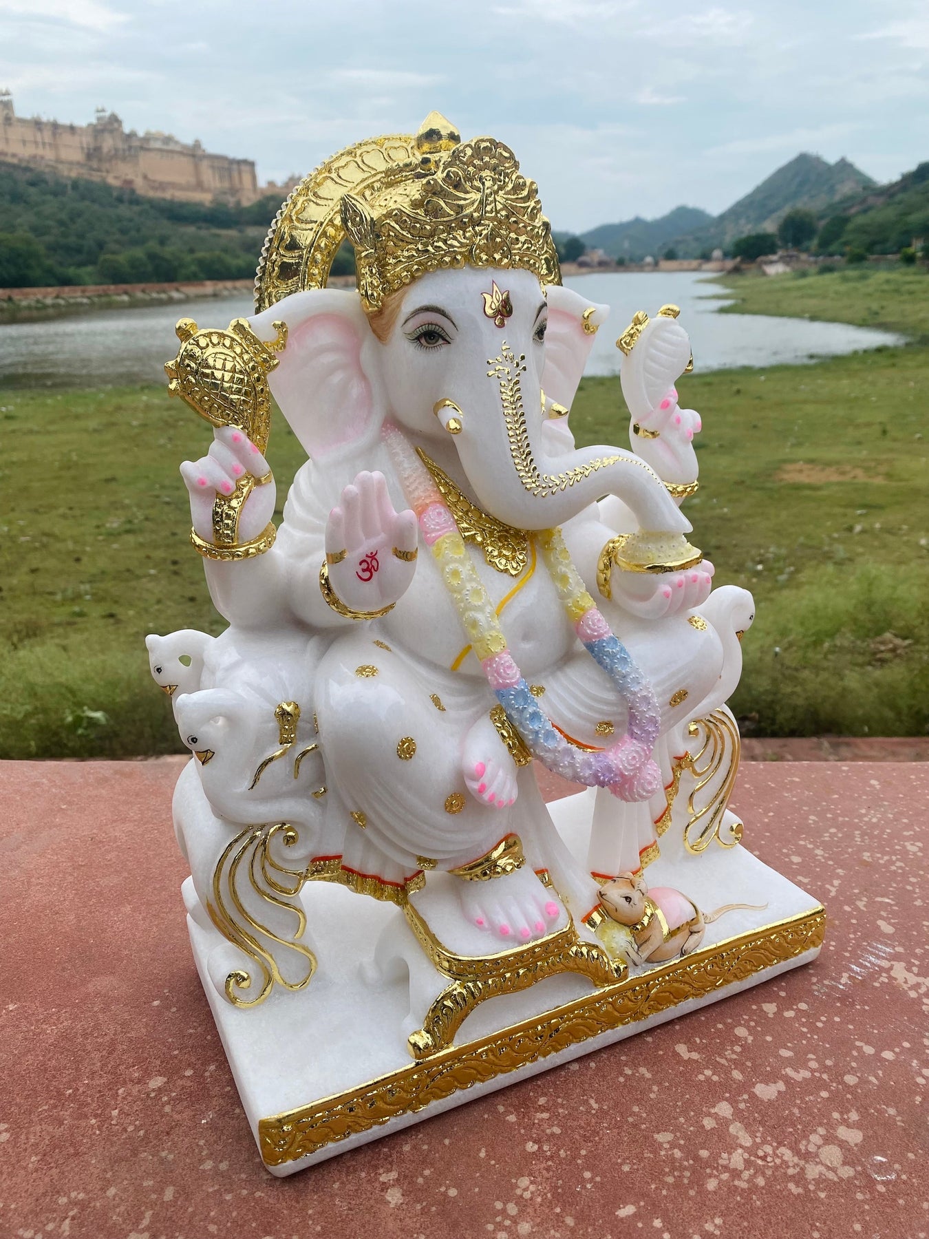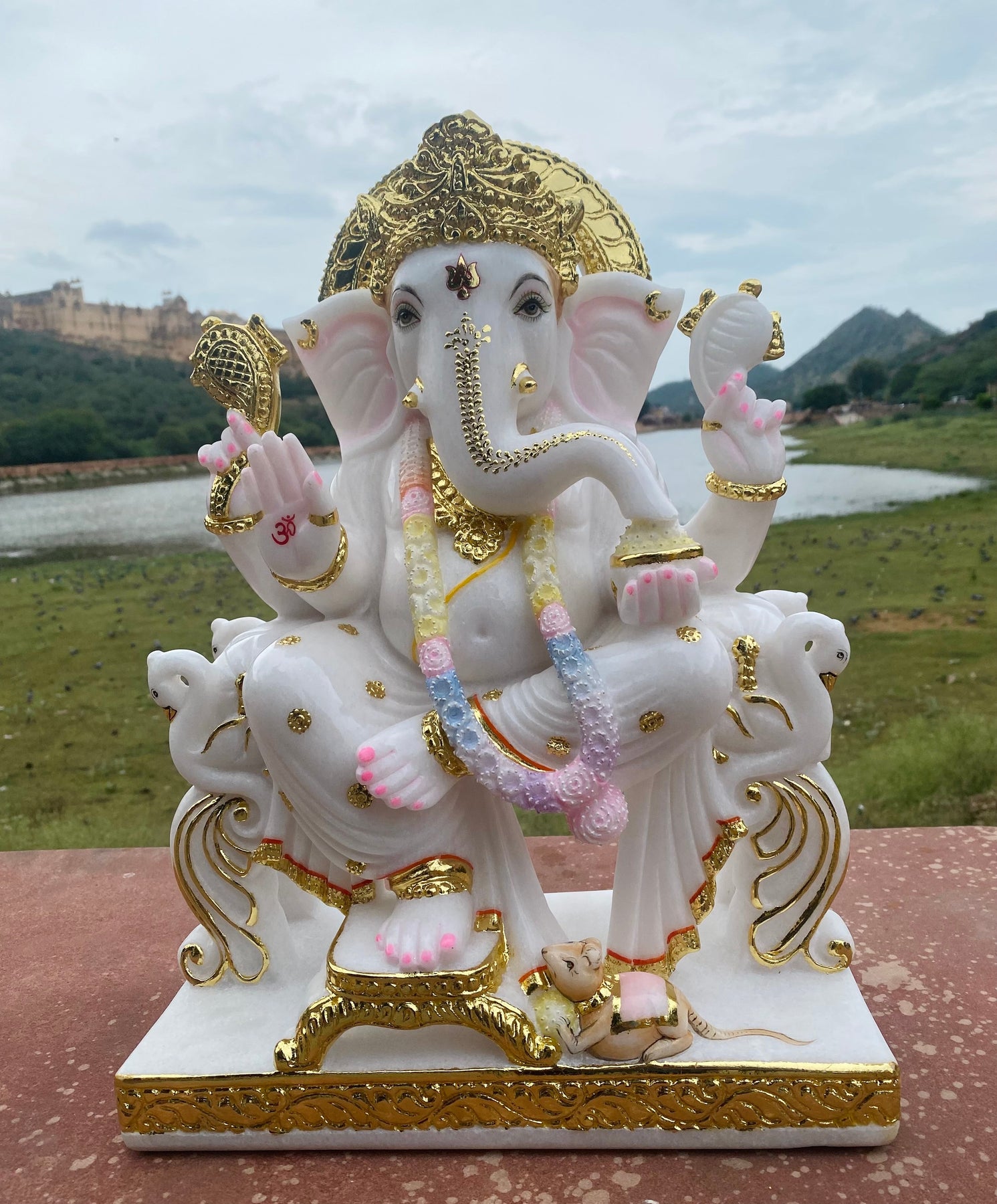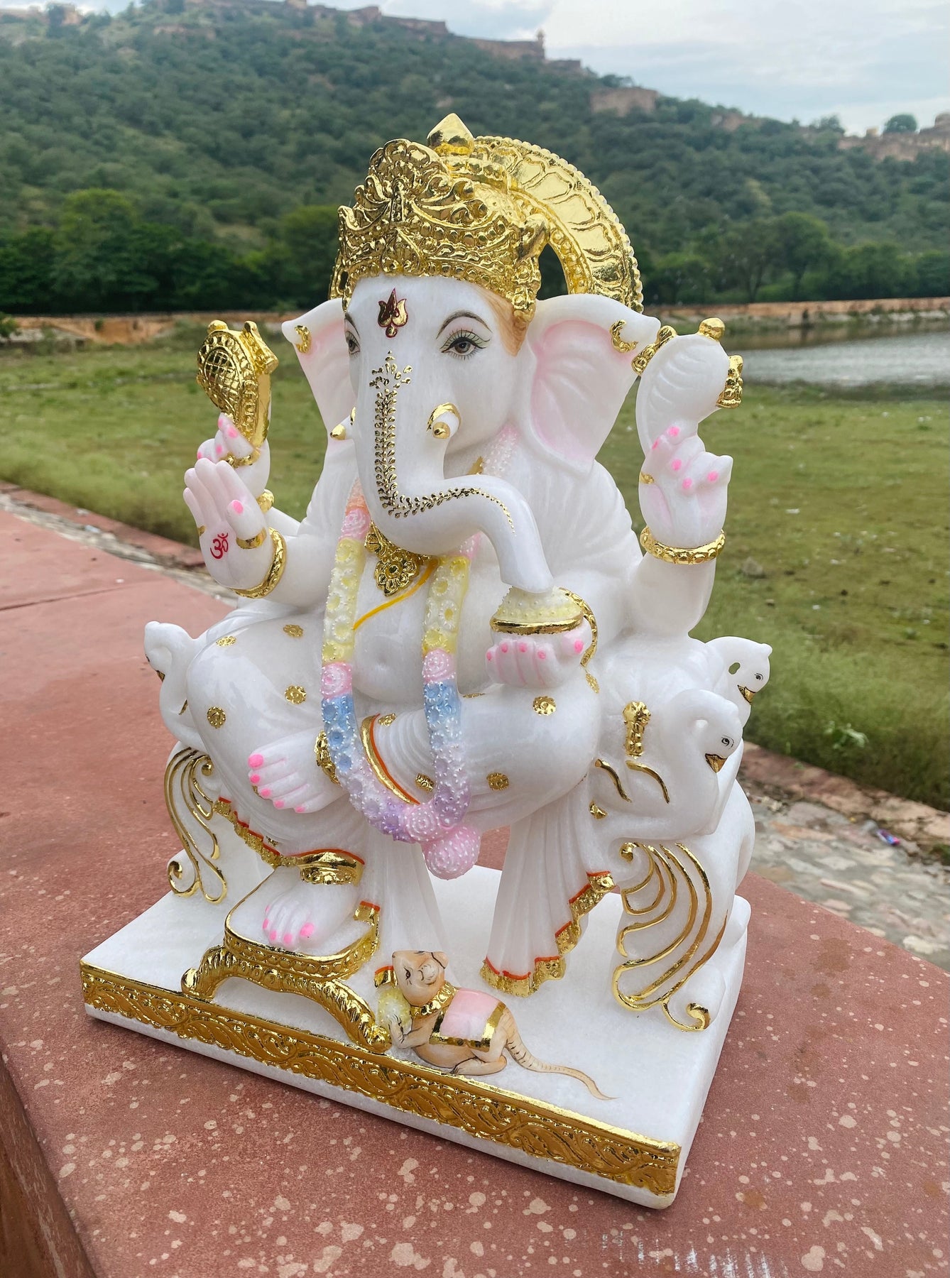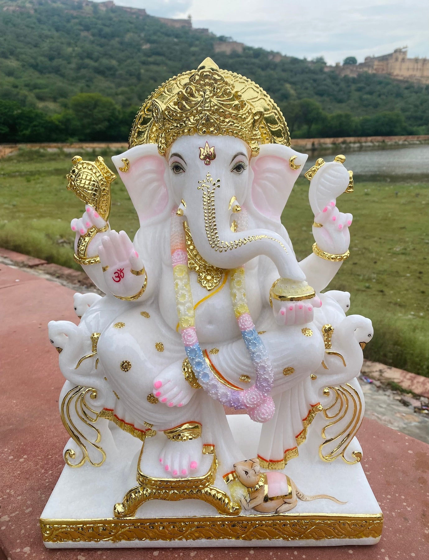 This Beautiful Marble Lord Ganesha Idol is made of Pure White Marble and is intricately hand painted with real Gold Leaf work.