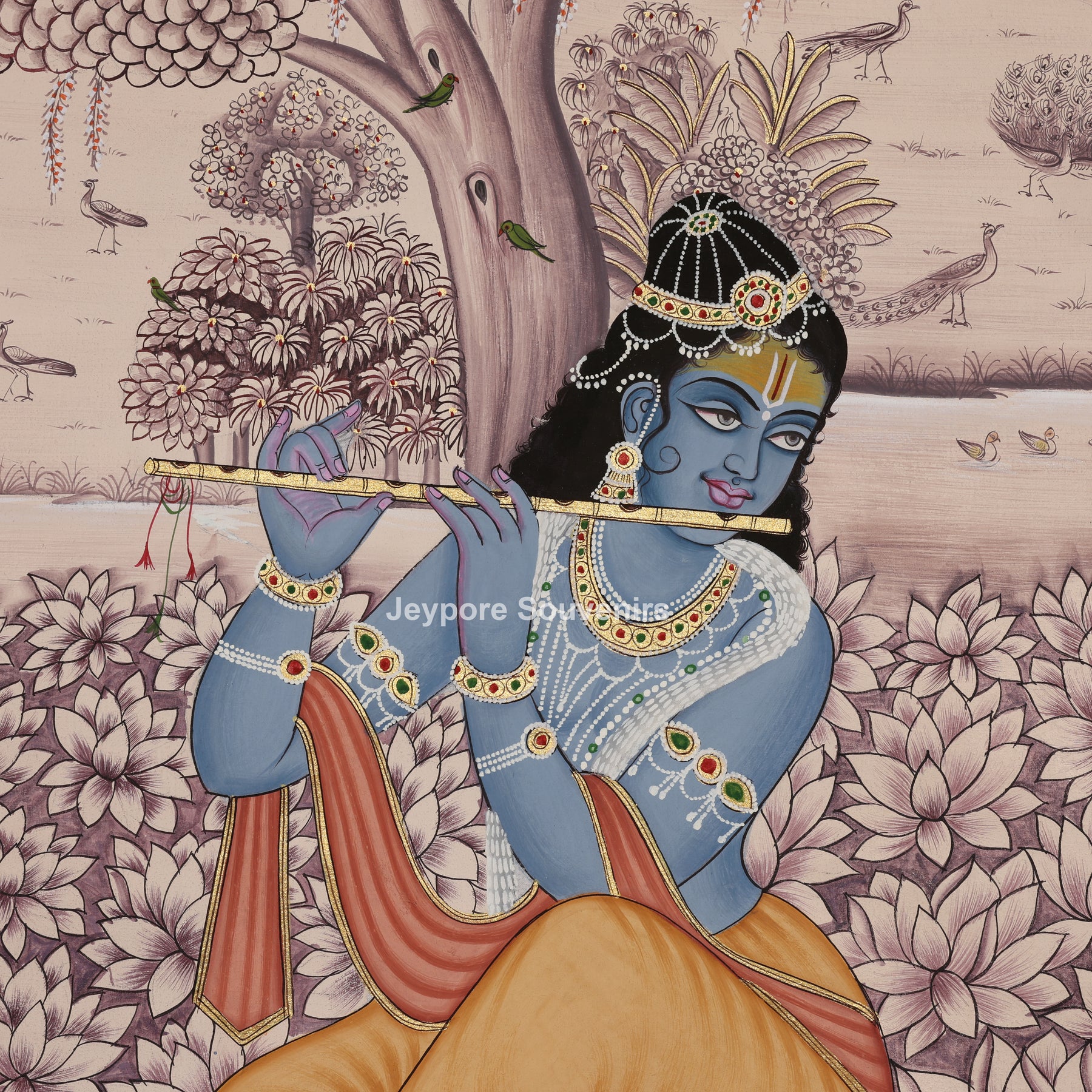 Lord Krishna Playing the Flute in a Lotus Garden –Pichwai Art on Artisan Paper Painting