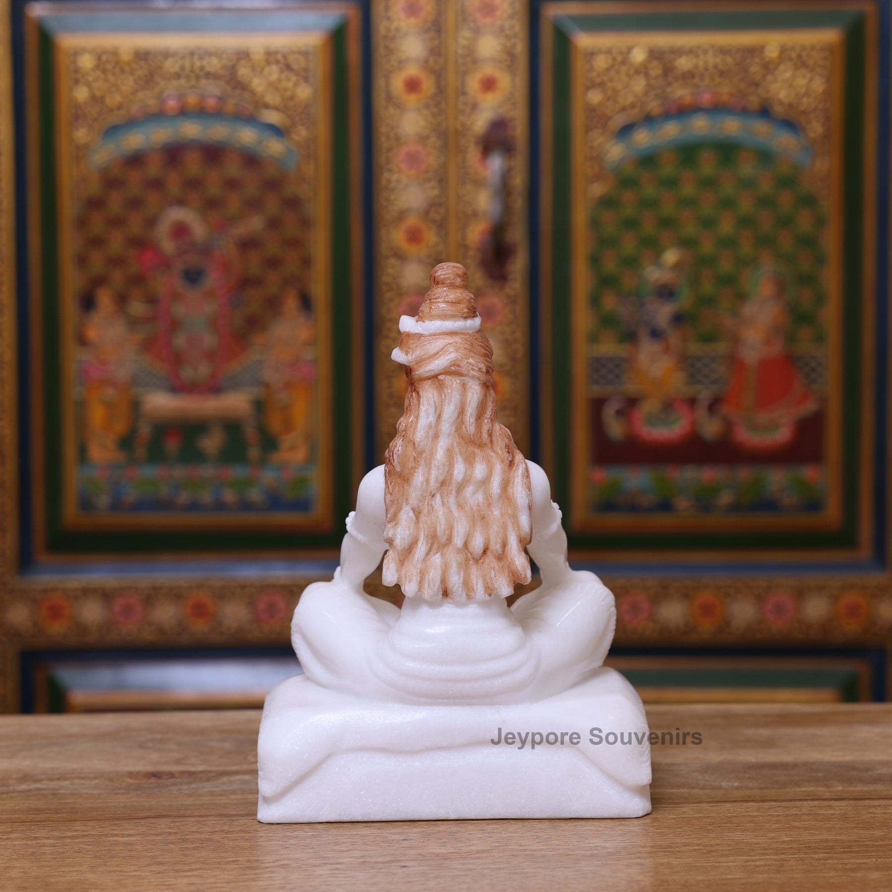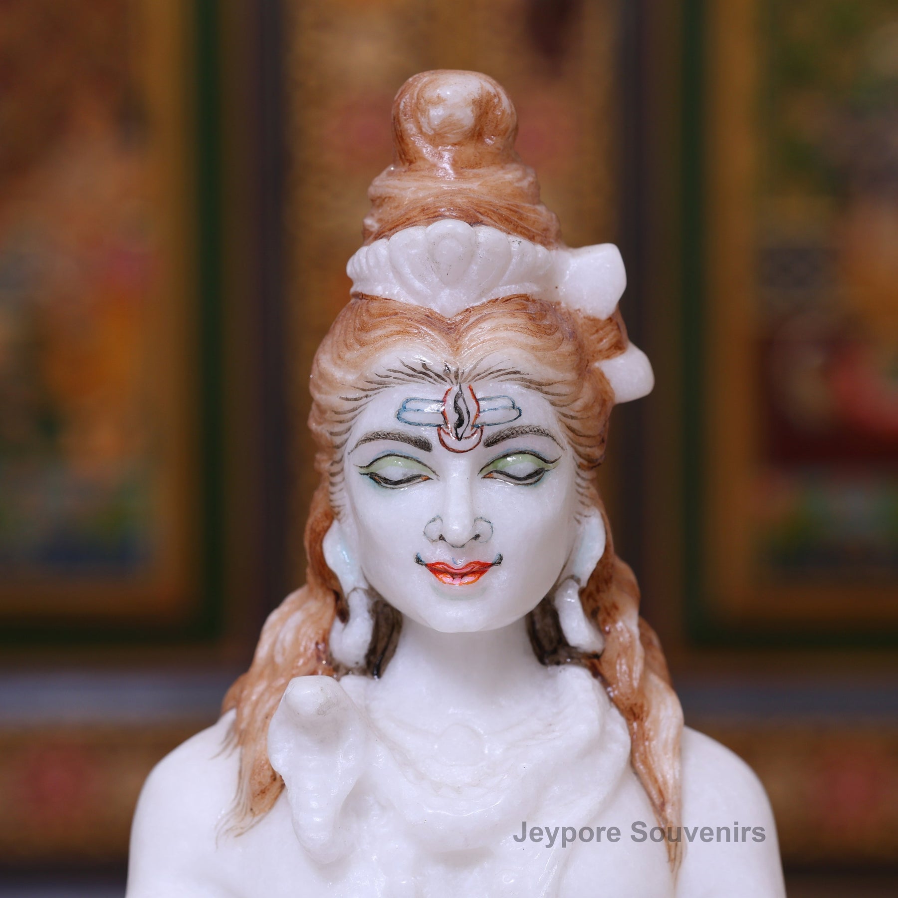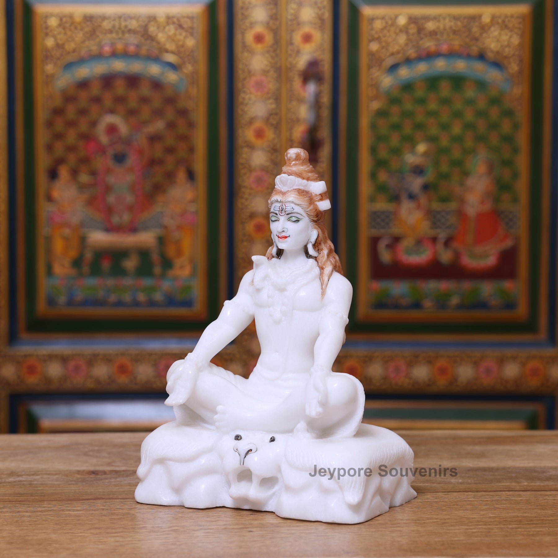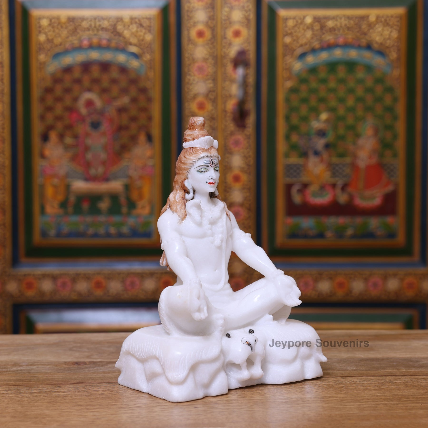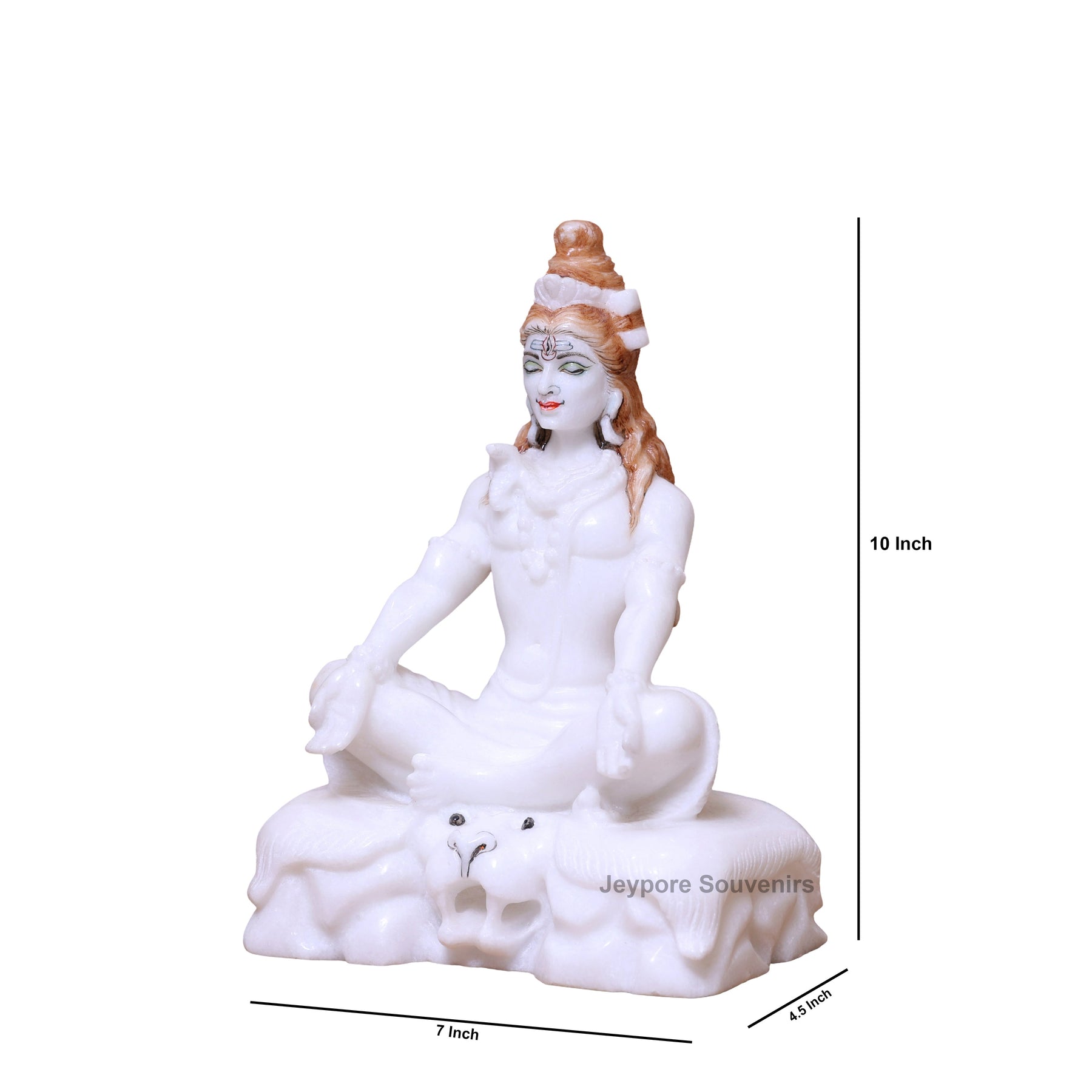 This 10 inches Pure White Marble Lord Shiva Statue is a symbol of serenity and divine power handcrafted by skilled artisans from Jaipur using high-quality white marble, known for its luminous purity and strength. The idol depicts Lord Shiva in a meditative posture, seated calmly on a base featuring Nandi (the sacred bull), representing wisdom, strength, and purity.