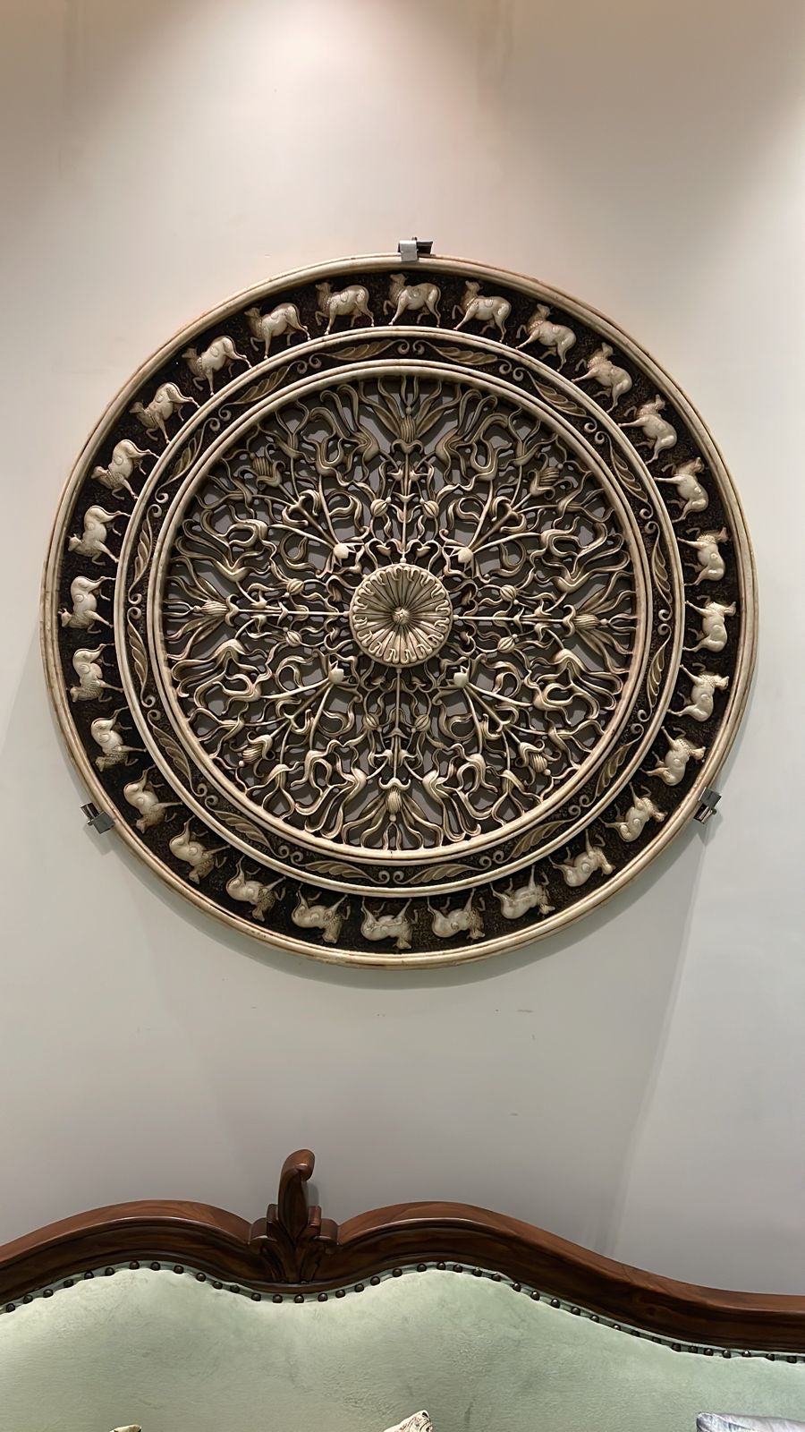 This round hand carved marble panel with antique finish is a statement piece in itself. The panel is flanked with intricately carved cow motifs all around.