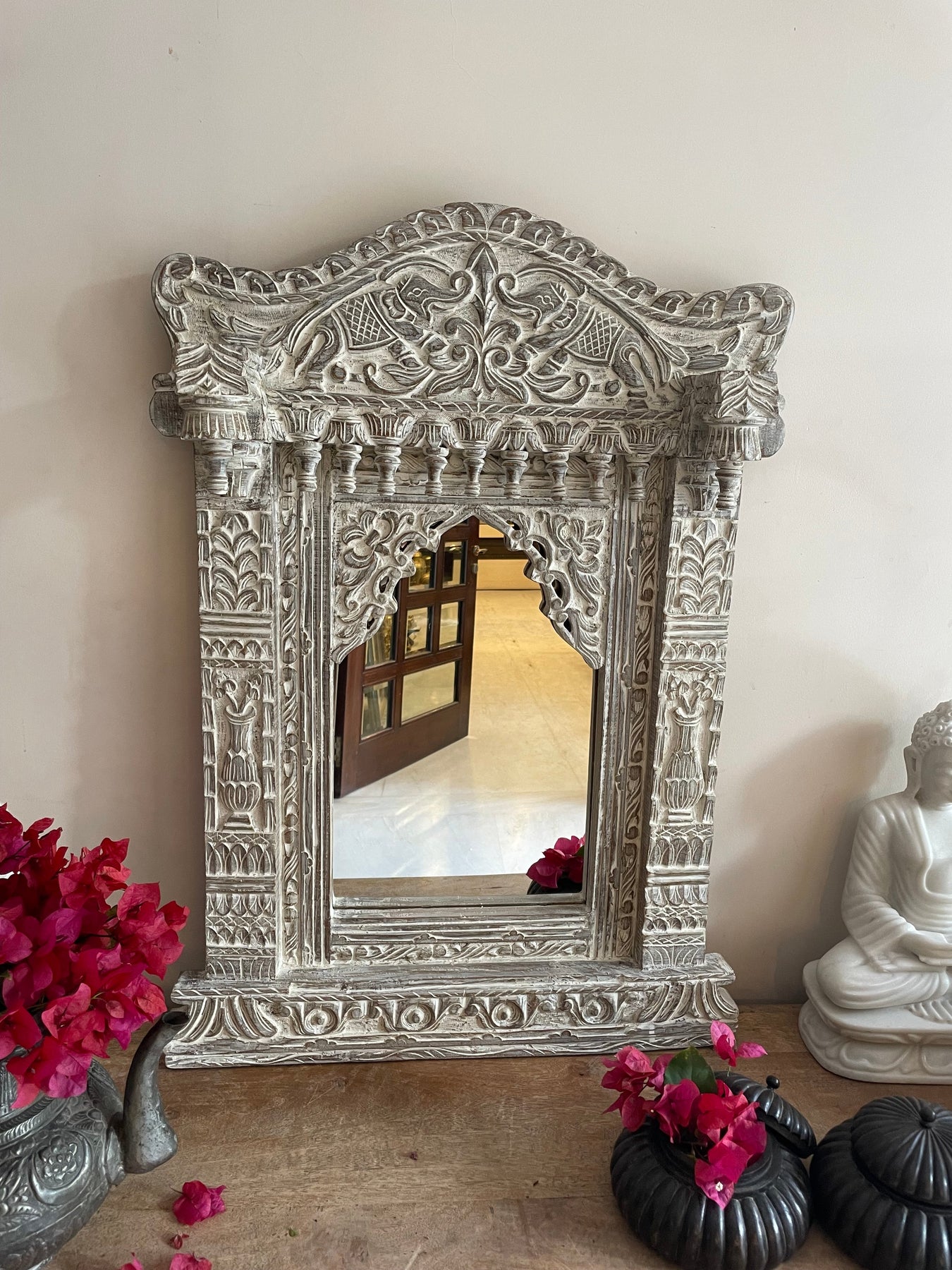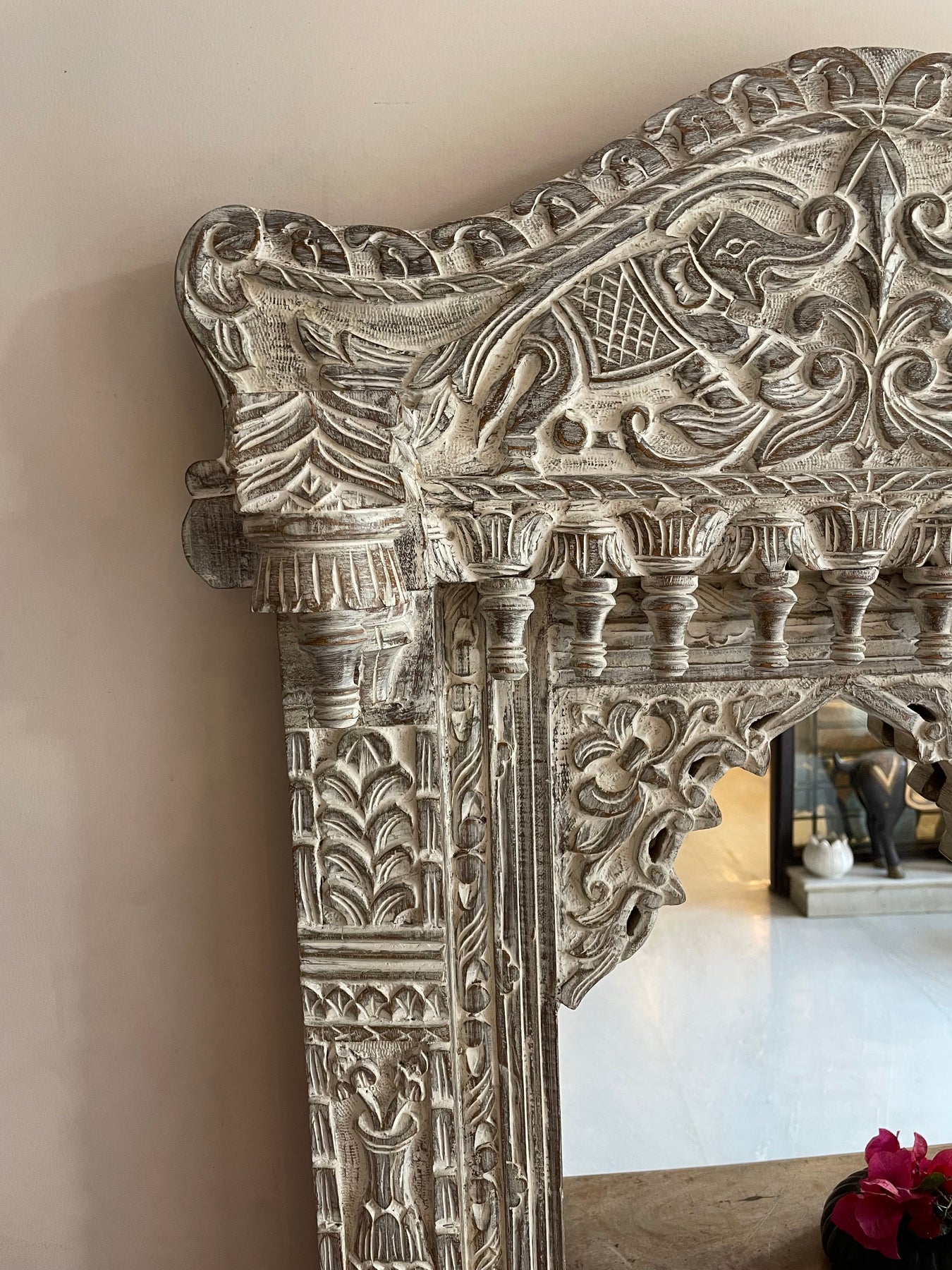 An elegant arch, based on ancient floral motifs is flanked by wooden carved borders and topped with intricate hand carved floral and geometric latticework.