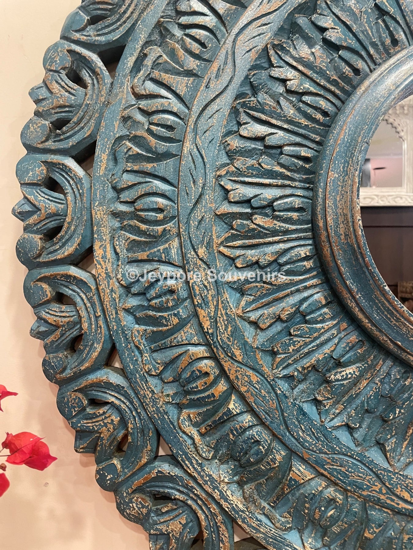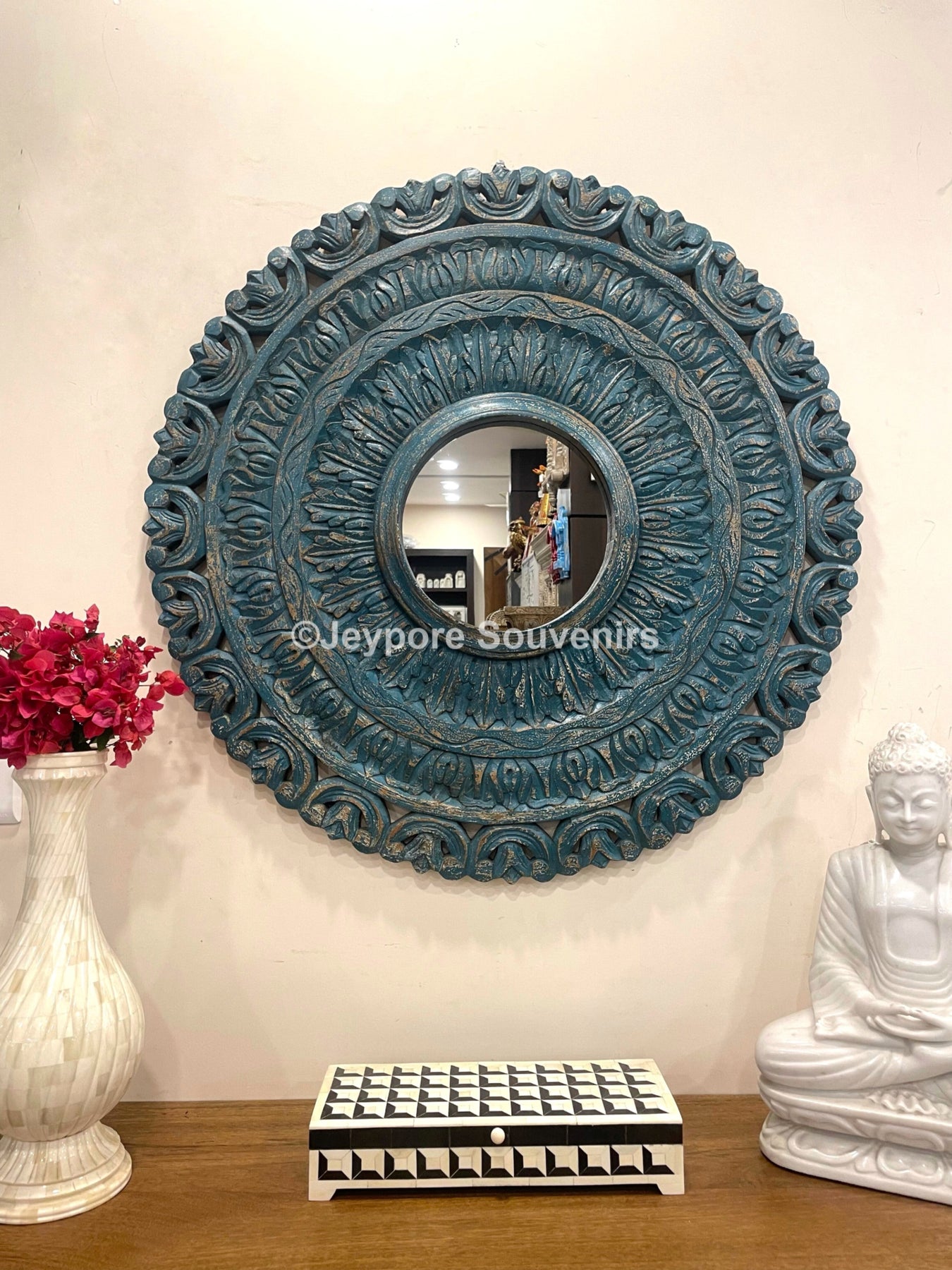 Introducing our beautifully crafted wooden frame with a round mirror that exudes a rustic charm with its distressed finish and intricate carvings. This statement piece adds a touch of elegance and sophistication to any room, from the bedroom to the living room.