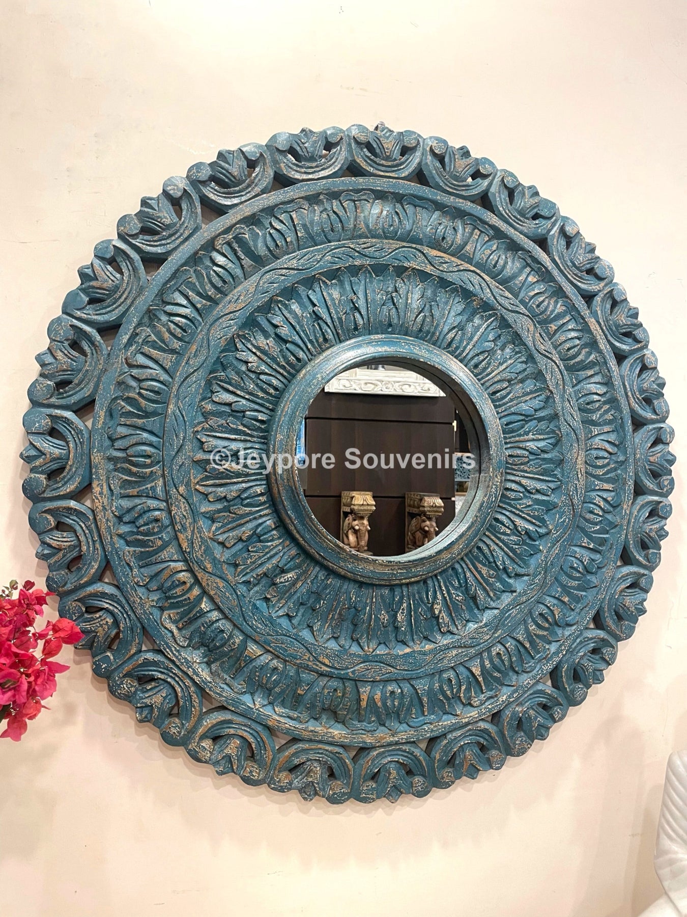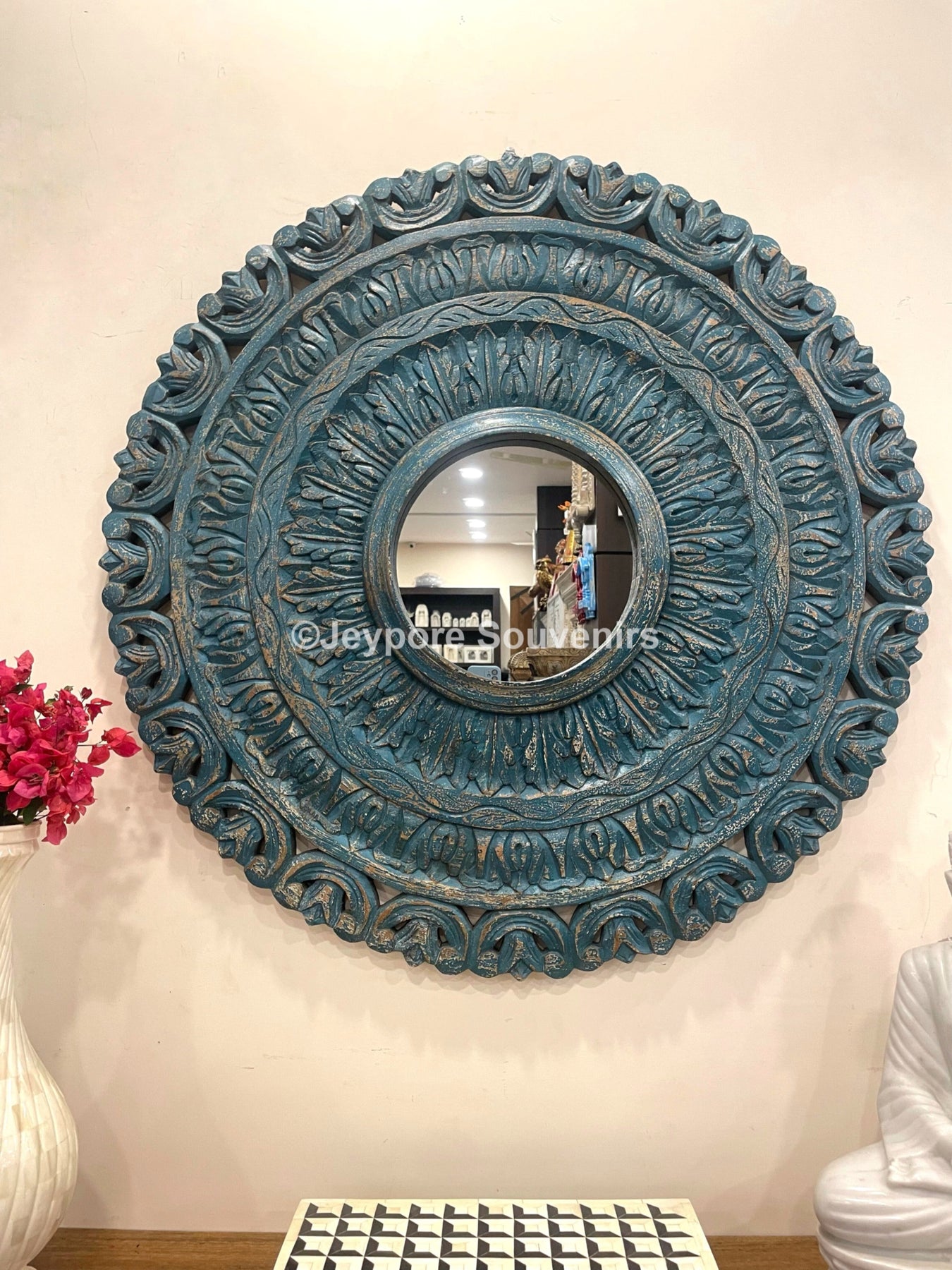 Hand carved Blue colored wooden round wall mirror