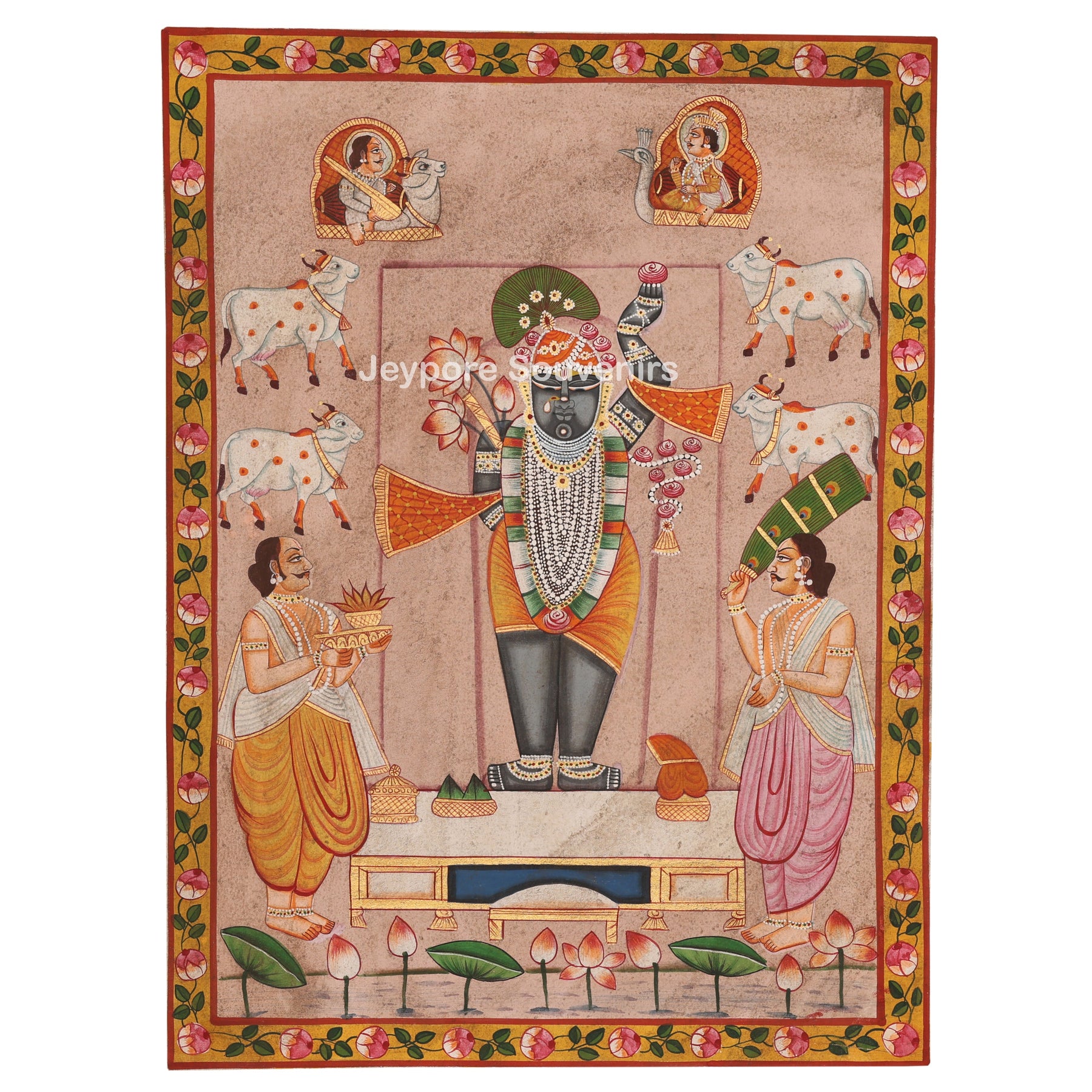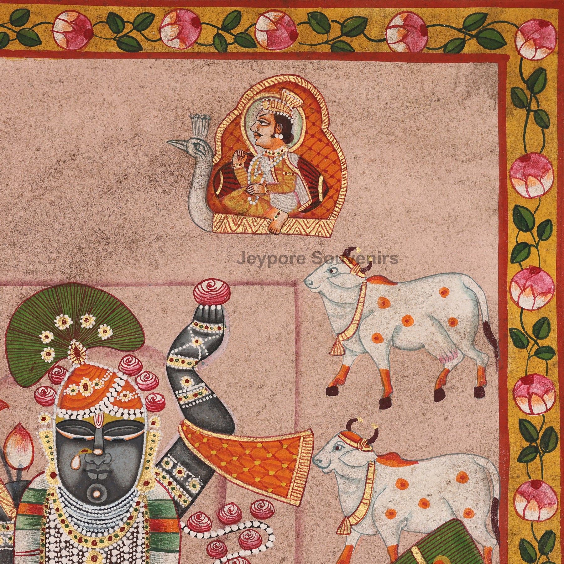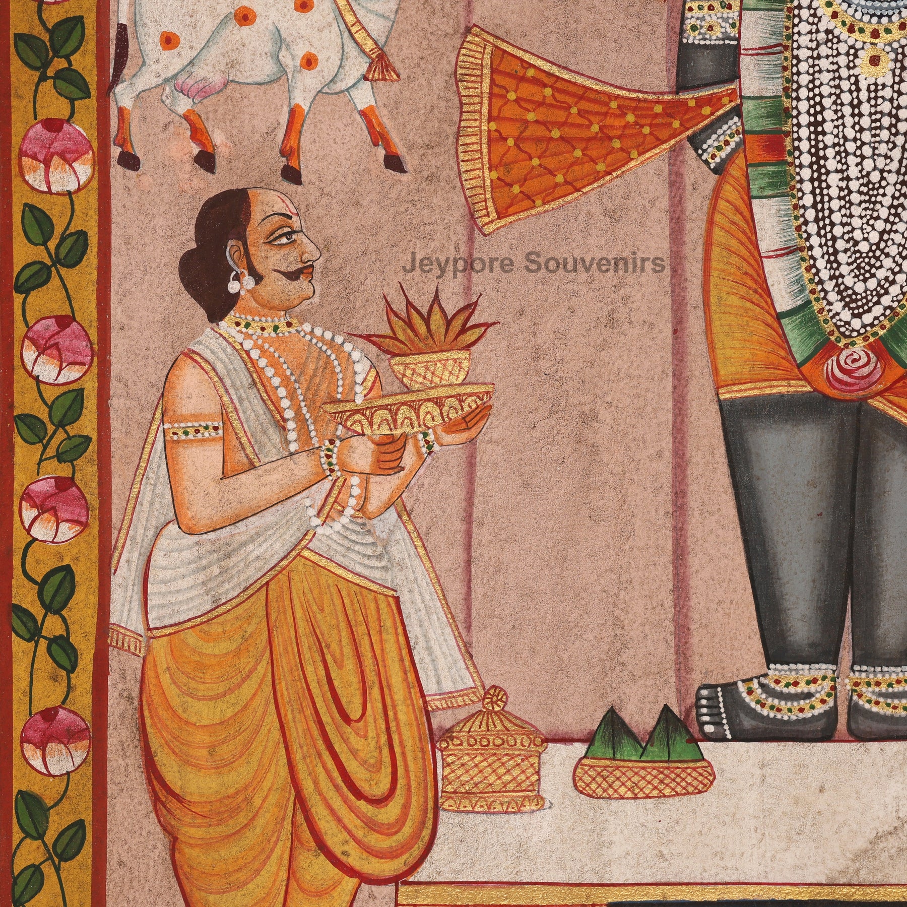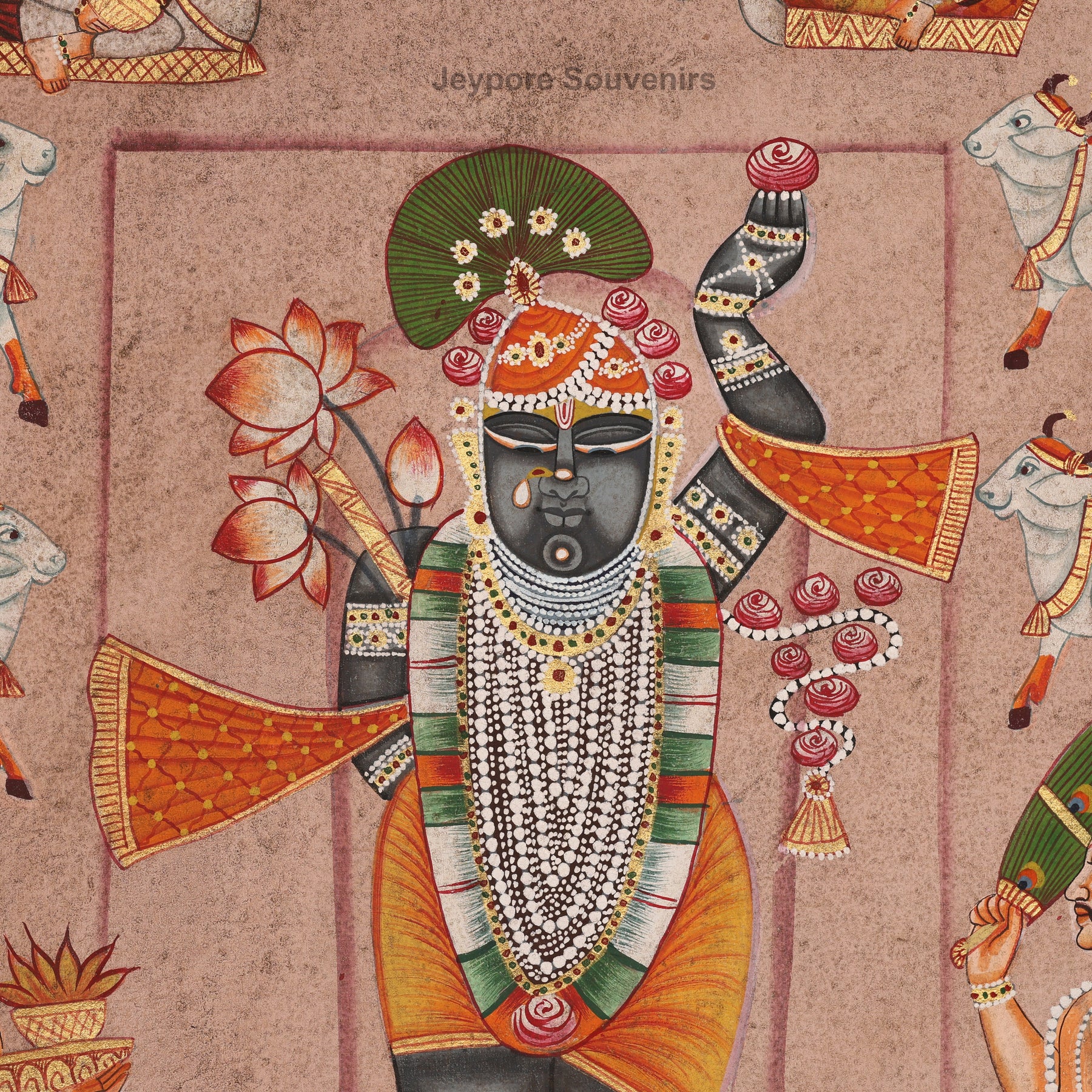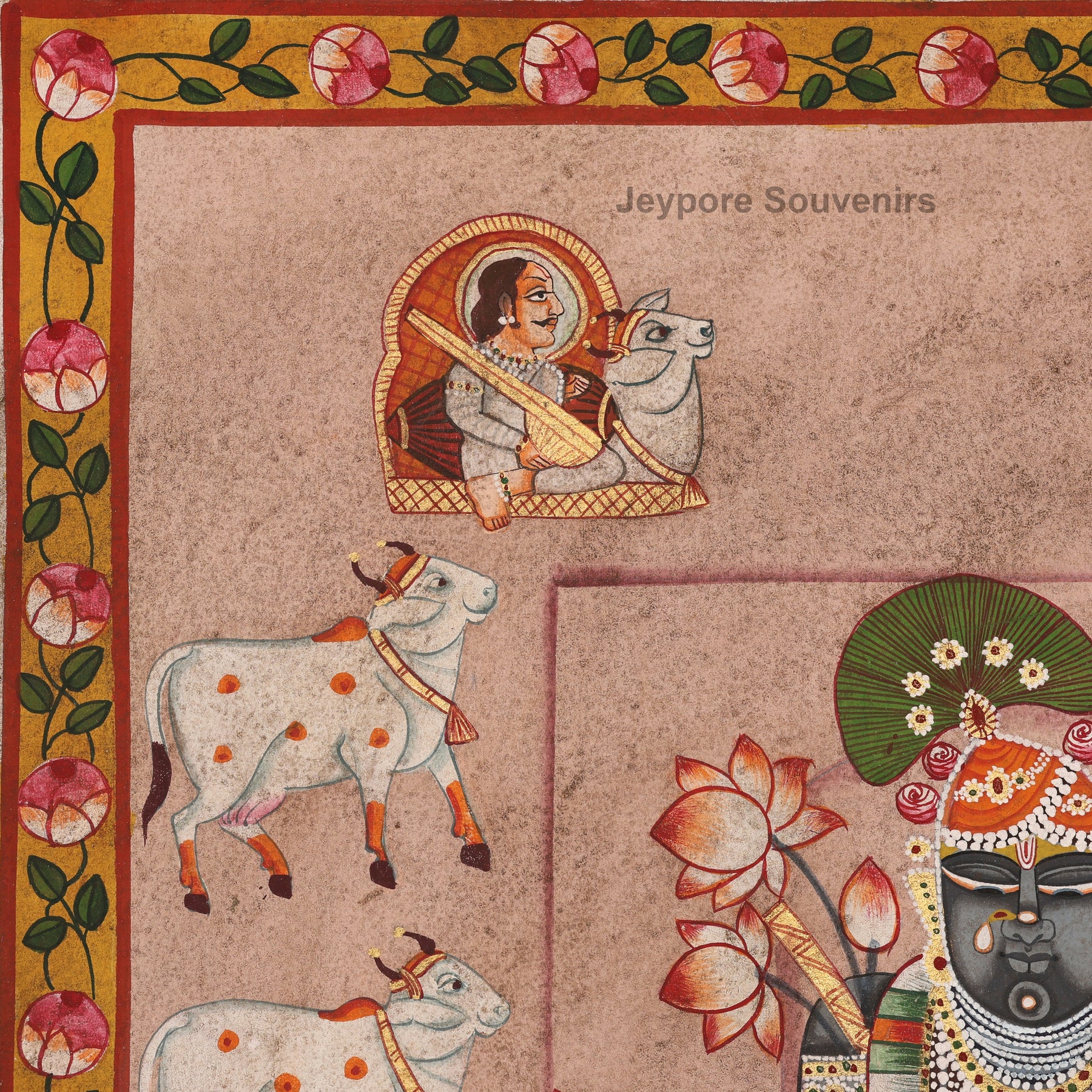 This artwork beautifully captures Lord Shrinathji, a form of Krishna, standing gracefully on a platform surrounded by two devoted Sevaks and four sacred cows—symbolizing love, service, and divine abundance.