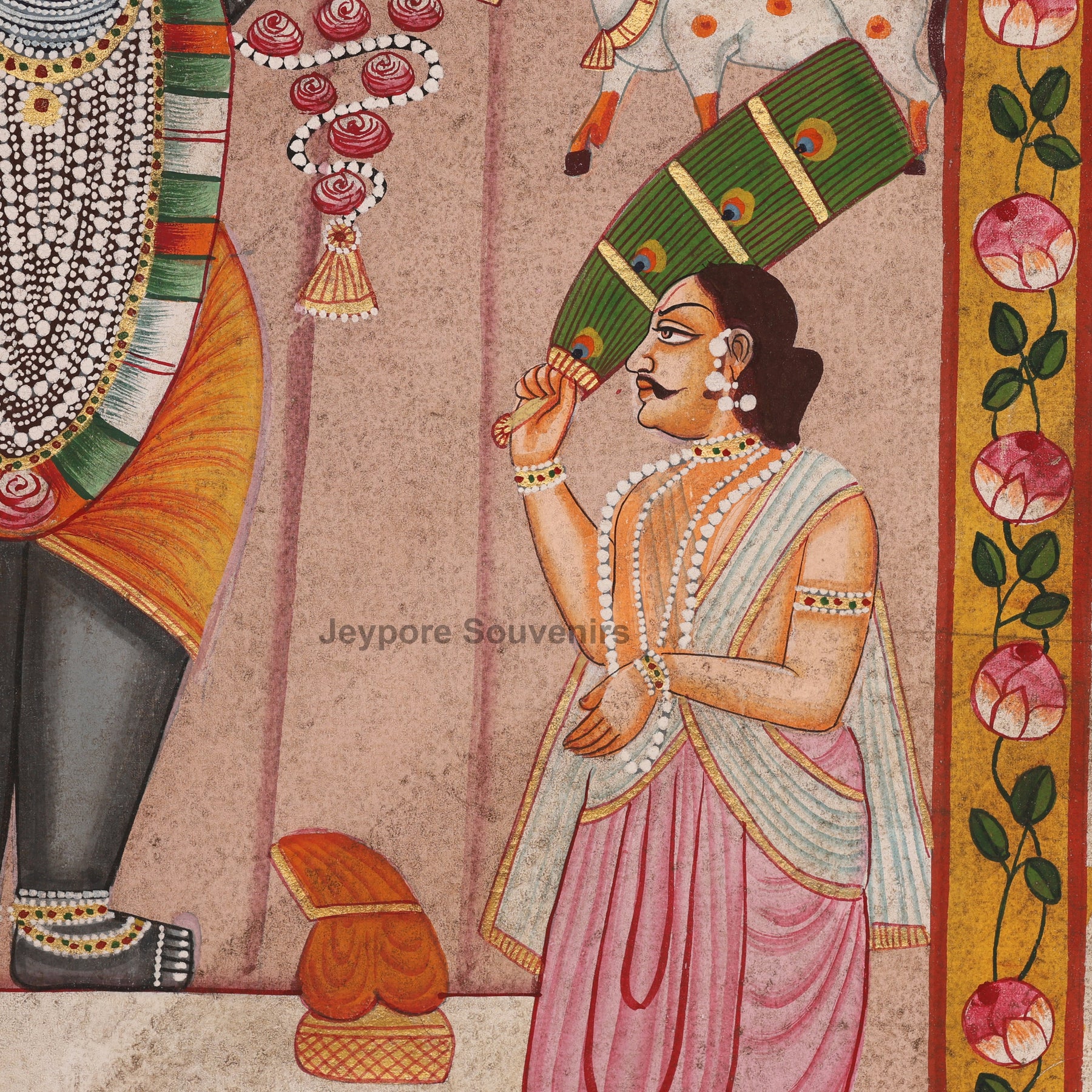 This handcrafted Pichwai painting from the Nathdwara school beautifully captures the divine darshan (view) of Lord Shrinathji, rendered in a striking dark blue/black hue. Shrinathji is flanked by two devoted Sevaks (priests), one holding a basket of offerings and the other fanning the Lord with a large chhatra (canopy fan).