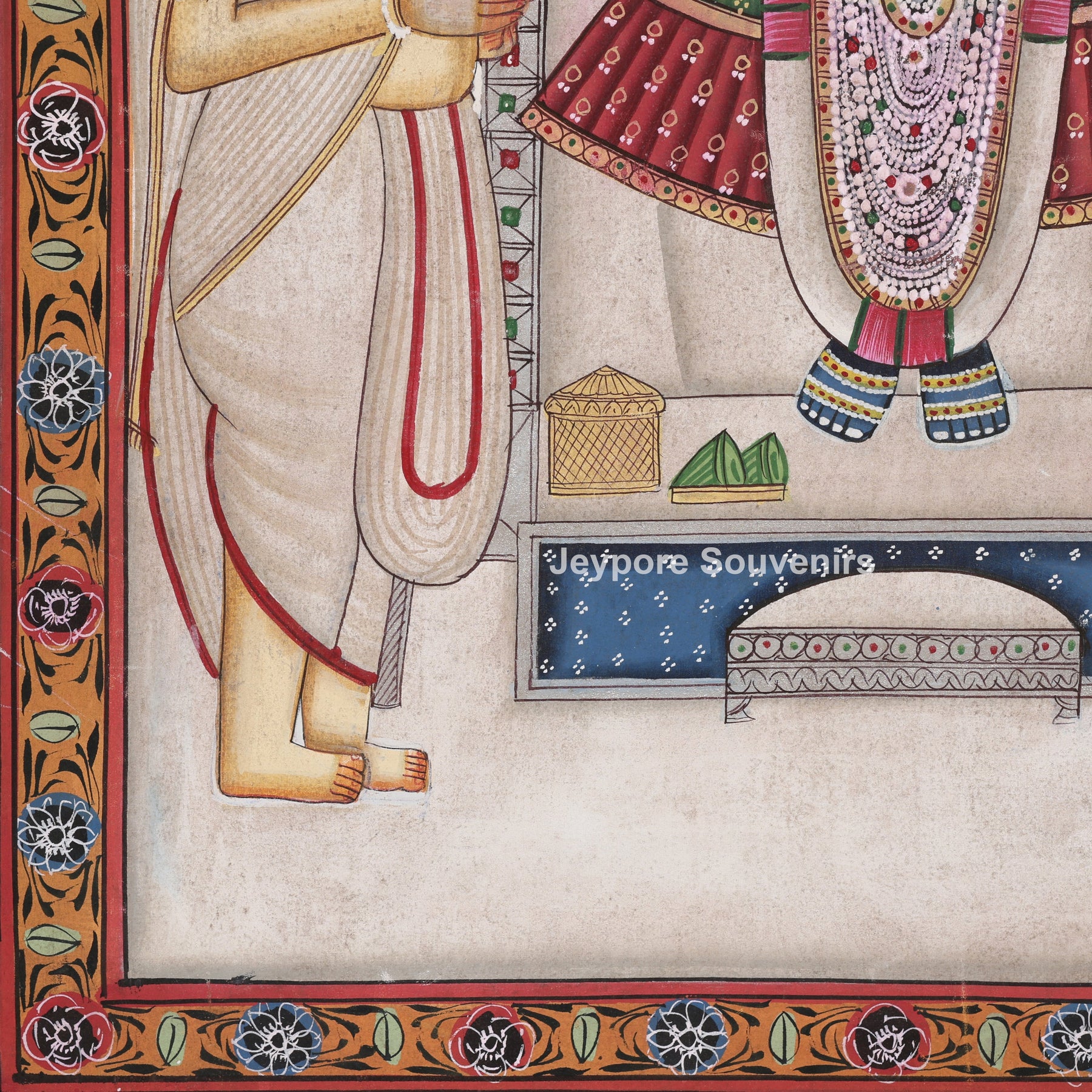 The shrinath ji is central, rendered in striking blue, adorned with opulent jewelry, and an elaborate Shringar (decoration). Flanking the Lord are two devoted priests, dressed in traditional white Vaishnava attire. Above the deity's head is the symbolic face of the goddess, often representing the protective energy of the temple. This piece beautifully encapsulates a moment of deep ritual and devotion, making it a spiritually significant addition to any space.